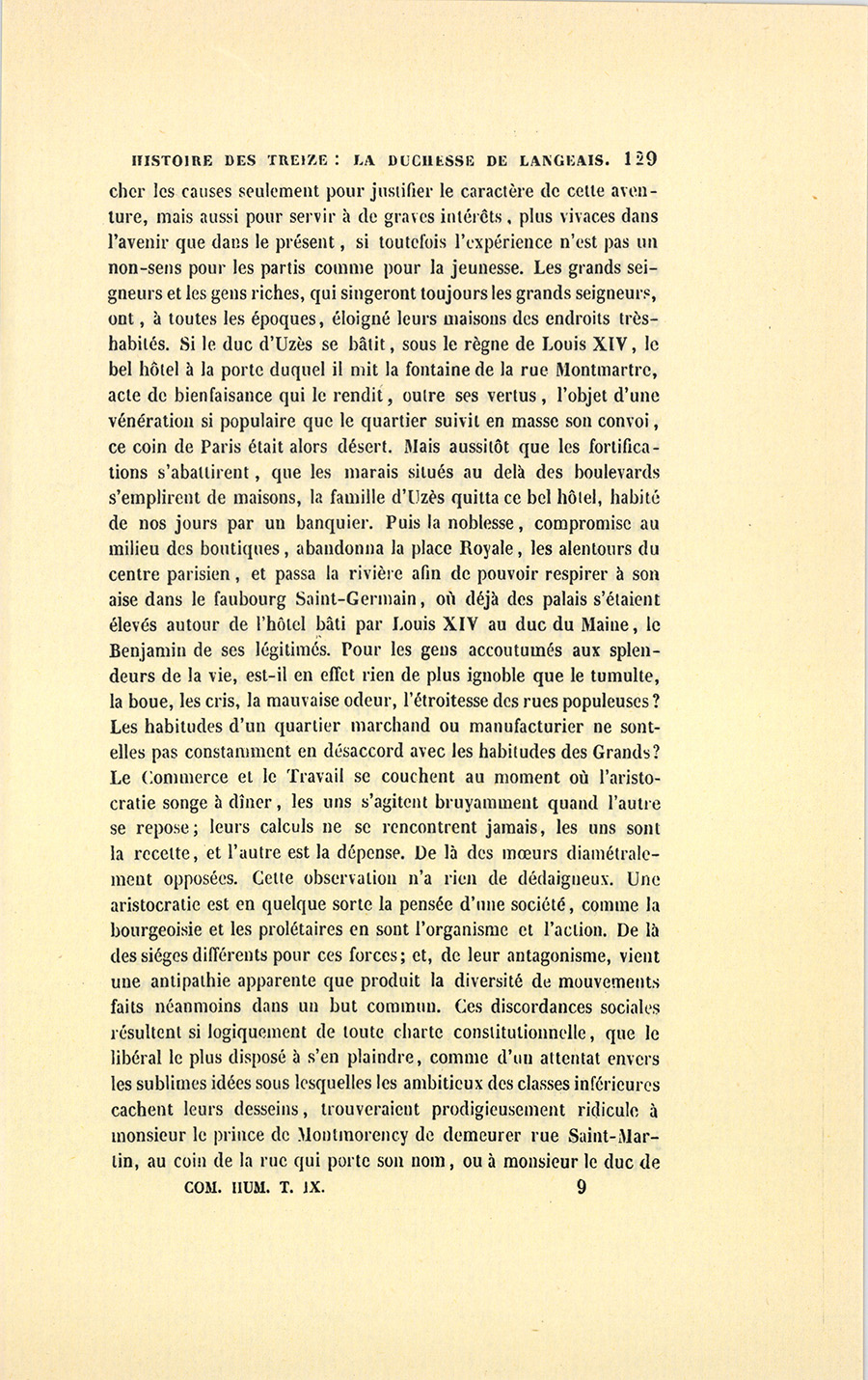 Ce que l’on nomme en France le faubourg Saint-Germain n’est ni un quartier, ni une secte, ni une institution, ni rien qui se puisse nettement exprimer. La place Royale, le faubourg Saint-Honoré, la Chaussée-d’Antin possèdent également des hôtels où se respire l’air du faubourg Saint-Germain. Ainsi, déjà tout le faubourg n’est pas dans le faubourg. Des personnes nées fort loin de son influence peuvent la ressentir et s’agréger à ce monde, tandis que certaines autres qui y sont nées peuvent en être à jamais bannies. Les manières, le parler, en un mot la tradition faubourg Saint-Germain est à Paris, depuis environ quarante ans, ce que la Cour y était jadis, ce qu’était l’hôtel Saint-Paul dans le quatorzième siècle, le Louvre au quinzième, le Palais, l’hôtel Rambouillet, la place Royale au seizième, puis Versailles au dix-septième et au dix-huitième siècle. À toutes les phases de l’histoire, le Paris de la haute classe et de la noblesse a eu son centre, comme le Paris vulgaire aura toujours le sien. Cette singularité périodique offre une ample matière aux réflexions de ceux qui veulent observer ou peindre les différentes zones sociales ; et peut-être ne doit-on pas en {p. 129} rechercher les causes seulement pour justifier le caractère de cette aventure, mais aussi pour servir à de graves intérêts, plus vivaces dans l’avenir que dans le présent, si toutefois l’expérience n’est pas un non-sens pour les partis comme pour la jeunesse. Les grands seigneurs et les gens riches, qui singeront toujours les grands seigneurs, ont, à toutes les époques, éloigné leurs maisons des endroits très habités. Si le duc d’Uzès se bâtit, sous le règne de Louis XIV, le bel hôtel à la porte duquel il mit la fontaine de la rue Montmartre, acte de bienfaisance qui le rendit, outre ses vertus, l’objet d’une vénération si populaire que le quartier suivit en masse son convoi, ce coin de Paris était alors désert. Mais aussitôt que les fortifications s’abattirent, que les marais situés au delà des boulevards s’emplirent de maisons, la famille d’Uzès quitta ce bel hôtel, habité de nos jours par un banquier. Puis la noblesse, compromise au milieu des boutiques, abandonna la place Royale, les alentours du centre parisien, et passa la rivière afin de pouvoir respirer à son aise dans le faubourg Saint-Germain, où déjà des palais s’étaient élevés autour de l’hôtel bâti par Louis XIV au duc du Maine, le Benjamin de ses légitimés. Pour les gens accoutumés aux splendeurs de la vie, est-il en effet rien de plus ignoble que le tumulte, la boue, les cris, la mauvaise odeur, l’étroitesse des rues populeuses ? Les habitudes d’un quartier marchand ou manufacturier ne sont-elles pas constamment en désaccord avec les habitudes des Grands ? Le Commerce et le Travail se couchent au moment où l’aristocratie songe à dîner, les uns s’agitent bruyamment quand l’autre se repose ; leurs calculs ne se rencontrent jamais, les uns sont la recette, et l’autre est la dépense. De là des mœurs diamétralement opposées. Cette observation n’a rien de dédaigneux. Une aristocratie est en quelque sorte la pensée d’une société, comme la bourgeoisie et les prolétaires en sont l’organisme et l’action. De là des siéges différents pour ces forces ; et, de leur antagonisme, vient une antipathie apparente que produit la diversité de mouvements faits néanmoins dans un but commun. Ces discordances sociales résultent si logiquement de toute charte constitutionnelle, que le libéral le plus disposé à s’en plaindre, comme d’un attentat envers les sublimes idées sous lesquelles les ambitieux des classes inférieures cachent leurs desseins, trouverait prodigieusement ridicule à monsieur le prince de Montmorency de demeurer rue Saint-Martin, au coin de la rue qui porte son nom, ou à monsieur le duc de {p. 130} Fitz-James, le descendant de la race royale écossaise, d’avoir son hôtel rue Marie-Stuart, au coin de la rue Montorgueil. Sint ut sunt, aut non sint, ces belles paroles pontificales peuvent servir de devise aux Grands de tous les pays. Ce fait, patent à chaque époque, et toujours accepté par le peuple, porte en lui des raisons d’état : il est à la fois un effet et une cause, un principe et une loi. Les masses ont un bon sens qu’elles ne désertent qu’au moment où les gens de mauvaise foi les passionnent. Ce bon sens repose sur des vérités d’un ordre général, vraies à Moscou comme à Londres, vraies à Genève comme à Calcutta. Partout, lorsque vous rassemblerez des familles d’inégale fortune sur un espace donné, vous verrez se former des cercles supérieurs, des patriciens, des première, seconde et troisième sociétés. L’égalité sera peut-être un droit, mais aucune puissance humaine ne saura le convertir en fait. Il serait bien utile pour le bonheur de la France d’y populariser cette pensée. Aux masses les moins intelligentes se révèlent encore les bienfaits de l’harmonie politique. L’harmonie est la poésie de l’ordre, et les peuples ont un vif besoin d’ordre. La concordance des choses entre elles, l’unité, pour tout dire en un mot, n’est-elle pas la plus simple expression de l’ordre ? L’architecture, la musique, la poésie, tout dans la France s’appuie, plus qu’en aucun autre pays, sur ce principe, qui d’ailleurs est écrit au fond de son clair et pur langage, et la langue sera toujours la plus infaillible formule d’une nation. Aussi, voyez-vous le peuple y adoptant les airs les plus poétiques, les mieux modulés ; s’attachant aux idées les plus simples ; aimant les motifs incisifs qui contiennent le plus de pensées. La France est le seul pays où quelque petite phrase puisse faire une grande révolution. Les masses ne s’y sont jamais révoltées que pour essayer de mettre d’accord les hommes, les choses et les principes. Or, nu