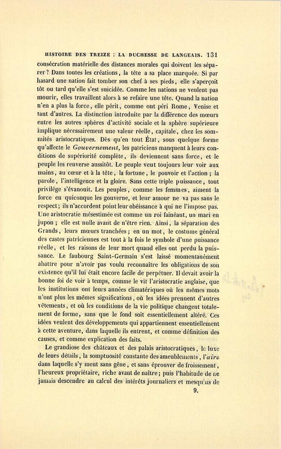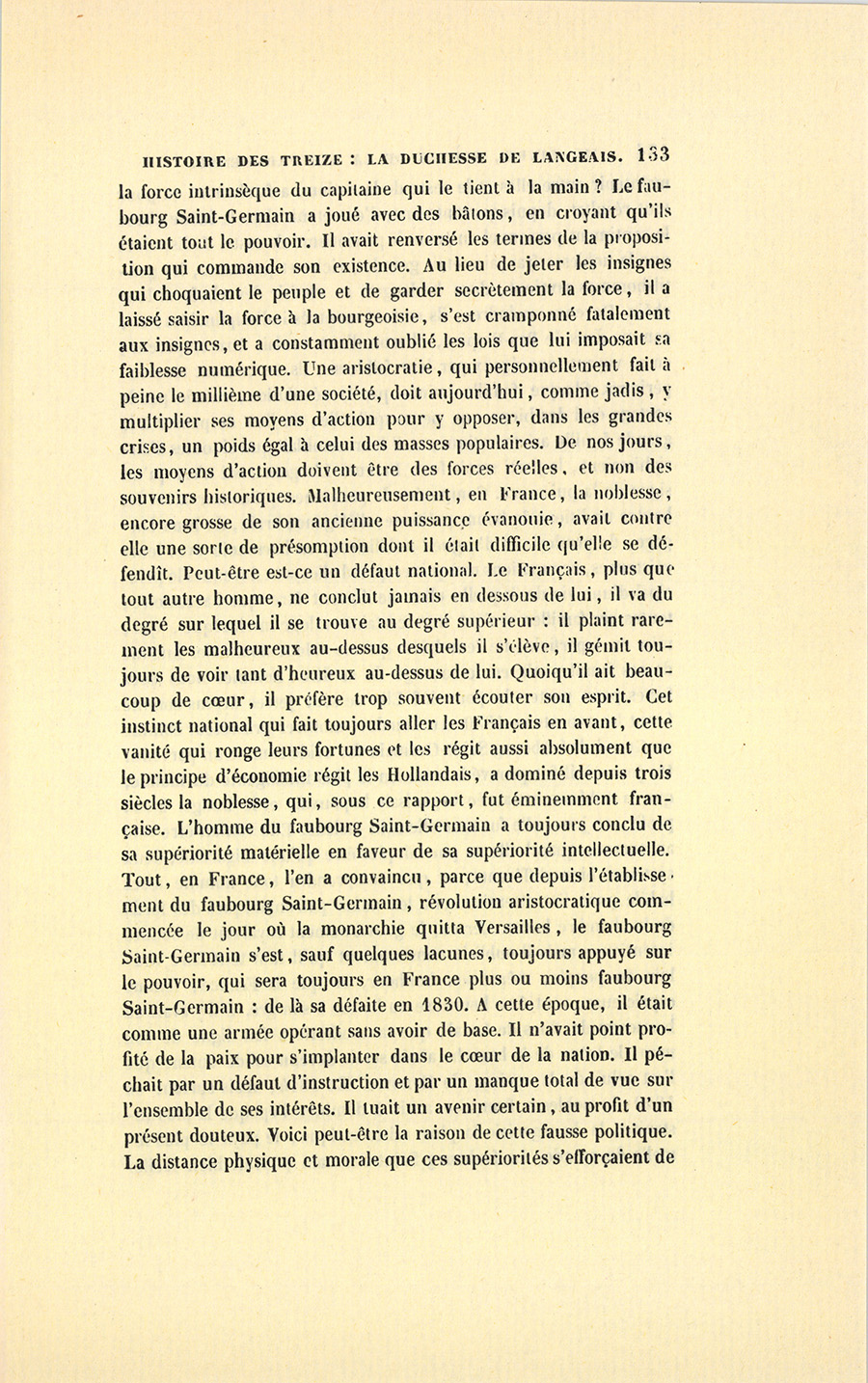 Ainsi déjà, pour premier trait caractéristique, le faubourg Saint-Germain a la splendeur de ses hôtels, ses grands jardins, leur silence, jadis en harmonie avec la magnificence de ses fortunes territoriales. Cet espace mis entre une classe et toute une capitale n’est-il pas une {p. 131} consécration matérielle des distances morales qui doivent les séparer ? Dans toutes les créations, la tête a sa place marquée. Si par hasard une nation fait tomber son chef à ses pieds, elle s’aperçoit tôt ou tard qu’elle s’est suicidée. Comme les nations ne veulent pas mourir, elles travaillent alors à se refaire une tête. Quand la nation n’en a plus la force, elle périt, comme ont péri Rome, Venise et tant d’autres. La distinction introduite par la différence des mœurs entre les autres sphères d’activité sociale et la sphère supérieure implique nécessairement une valeur réelle, capitale, chez les sommités aristocratiques. Dès qu’en tout État, sous quelque forme qu’affecte le Gouvernement, les patriciens manquent à leurs conditions de supériorité complète, ils deviennent sans force, et le peuple les renverse aussitôt. Le peuple veut toujours leur voir aux mains, au cœur et à la tête, la fortune, le pouvoir et l’action ; la parole, l’intelligence et la gloire. Sans cette triple puissance, tout privilége s’évanouit. Les peuples, comme les femmes, aiment la force en quiconque les gouverne, et leur amour ne va pas sans le respect ; ils n’accordent point leur obéissance à qui ne l’impose pas. Une aristocratie mésestimée est comme un roi fainéant, un mari en jupon ; elle est nulle avant de n’être rien. Ainsi, la séparation des Grands, leurs mœurs tranchées ; en un mot, le costume général des castes patriciennes est tout à la fois le symbole d’une puissance réelle, et les raisons de leur mort quand elles ont perdu la puissance. Le faubourg Saint-Germain s’est laissé momentanément abattre pour n’avoir pas voulu reconnaître les obligations de son existence qu’il lui était encore facile de perpétuer. Il devait avoir la bonne foi de voir à temps, comme le vit l’aristocratie anglaise, que les institutions ont leurs années climatériques où les mêmes mots n’ont plus les mêmes significations, où les idées prennent d’autres vêtements, et où les conditions de la vie politique changent totalement de forme, sans que le fond soit essentiellement altéré. Ces idées veulent des développements qui appartiennent essentiellement à cette aventure, dans laquelle ils entrent, et comme définition des causes, et comme explication des faits.