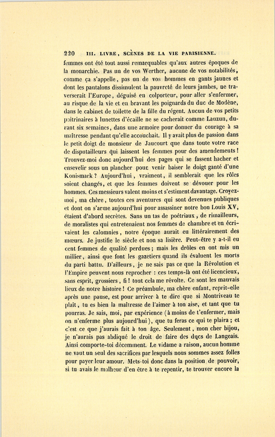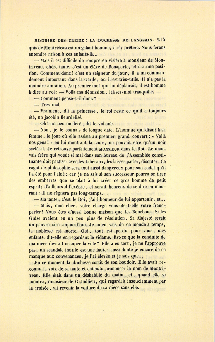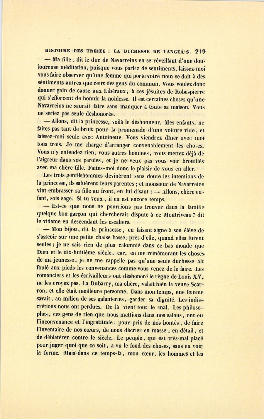 {p. 219} – Ma fille, dit le duc de Navarreins en se réveillant d’une douloureuse méditation, puisque vous parlez de sentiments, laissez-moi vous faire observer qu’une femme qui porte votre nom se doit à des sentiments autres que ceux des gens du commun. Vous voulez donc donner gain de cause aux Libéraux, à ces jésuites de Robespierre qui s’efforcent de honnir la noblesse. Il est certaines choses qu’une Navarreins ne saurait faire sans manquer à toute sa maison. Vous ne seriez pas seule déshonorée.
