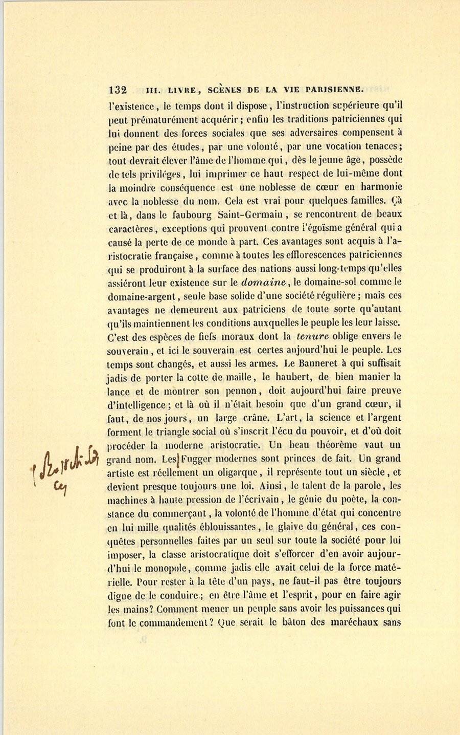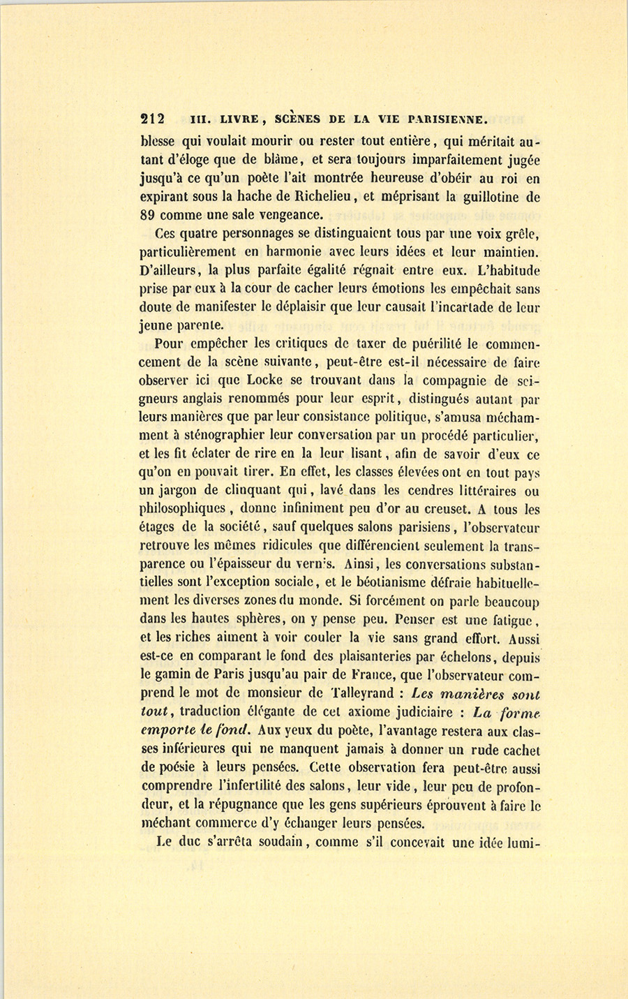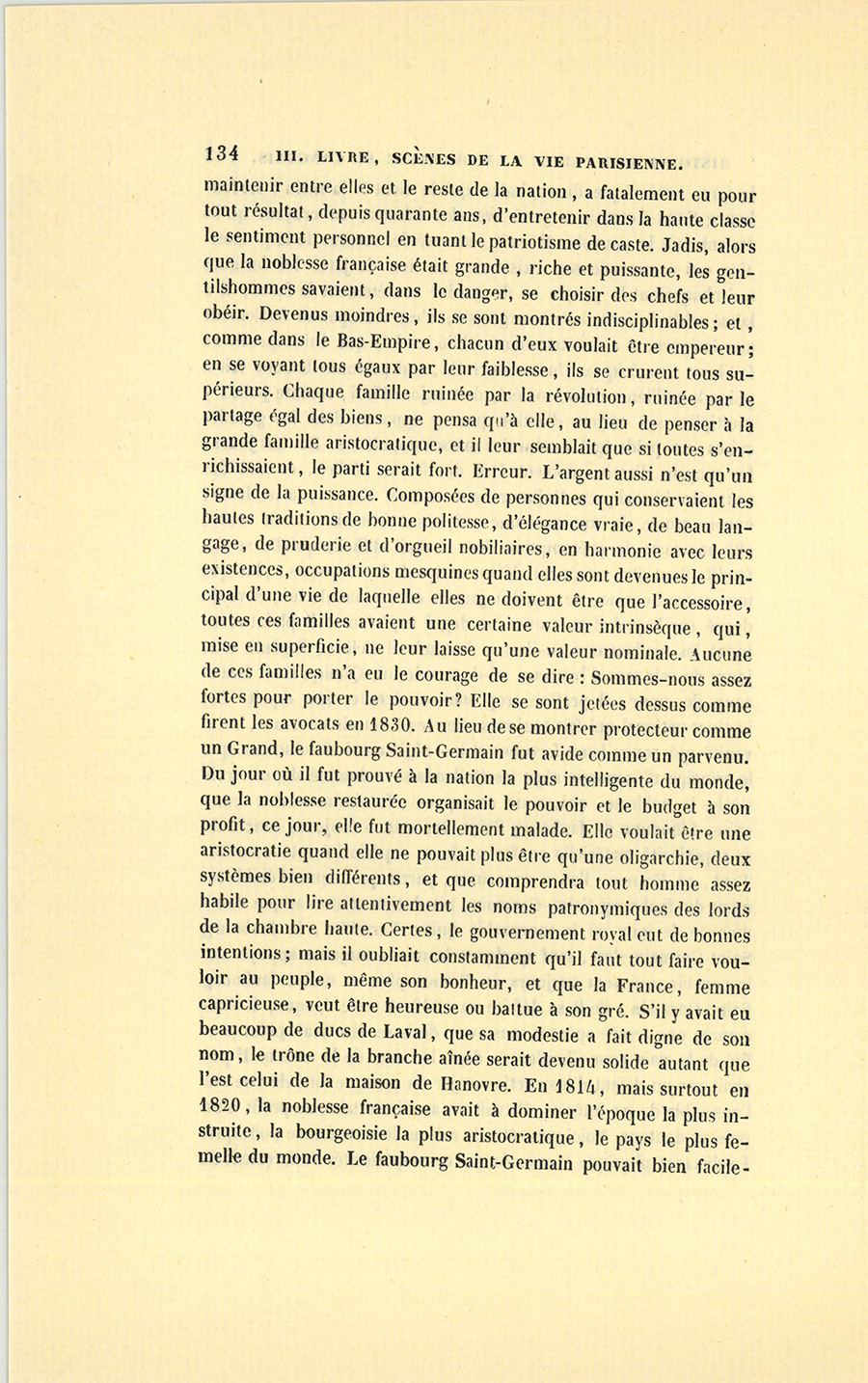 {p. 219} – Ma fille, dit le duc de Navarreins en se réveillant d’une douloureuse méditation, puisque vous parlez de sentiments, laissez-moi vous faire observer qu’une femme qui porte votre nom se doit à des sentiments autres que ceux des gens du commun. Vous voulez donc donner gain de cause aux Libéraux, à ces jésuites de Robespierre qui s’efforcent de honnir la noblesse. Il est certaines choses qu’une Navarreins ne saurait faire sans manquer à toute sa maison. Vous ne seriez pas seule déshonorée.