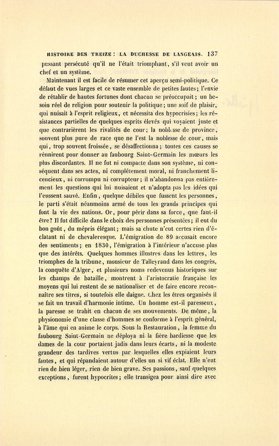 Maintenant il est facile de résumer cet aperçu semi-politique. Ce défaut de vues larges et ce vaste ensemble de petites fautes ; l’envie de rétablir de hautes fortunes dont chacun se préoccupait ; un besoin réel de religion pour soutenir la politique ; une soif de plaisir, qui nuisait à l’esprit religieux, et nécessita des hypocrisies ; les résistances partielles de quelques esprits élevés qui voyaient juste et que contrarièrent les rivalités de cour ; la noblesse de province, souvent plus pure de race que ne l’est la noblesse de cour, mais qui, trop souvent froissée, se désaffectionna ; toutes ces causes se réunirent pour donner au faubourg Saint-Germain les mœurs les plus discordantes. Il ne fut ni compact6 dans son système, ni conséquent dans ses actes, ni complétement moral, ni franchement licencieux, ni corrompu, ni corrupteur ; il n’abandonna pas entièrement les questions qui lui nuisaient et n’adopta pas les idées qui l’eussent sauvé. Enfin, quelque débiles que fussent les personnes, le parti s’était néanmoins armé de tous les grands principes qui font la vie des nations. Or, pour périr dans sa force, que faut-il être ? Il fut difficile dans le choix des personnes présentées ; il eut du bon goût, du mépris élégant ; mais sa chute n’eut certes rien d’éclatant ni de chevaleresque. L’émigration de 89 accusait encore des sentiments ; en 1830, l’émigration à l’intérieur n’accuse plus que des intérêts. Quelques hommes illustres dans les lettres, les triomphes de la tribune, monsieur de Talleyrand dans les congrès, la conquête d’Alger, et plusieurs noms redevenus historiques sur les champs de bataille, montrent à l’aristocratie française les moyens qui lui restent de se nationaliser et de faire encore reconnaître ses titres, si toutefois elle daigne. Chez les êtres organisés il se fait un travail d’harmonie intime. Un homme est-il paresseux, la paresse se trahit en chacun de ses mouvements. De même, la physionomie d’une classe d’hommes se conforme à l’esprit général, à l’âme qui en anime le corps. Sous la Restauration, la femme du faubourg Saint-Germain ne déploya ni la fière hardiesse que les dames de la cour portaient jadis dans leurs écarts, ni la modeste grandeur des tardives vertus par lesquelles elles expiaient leurs fautes, et qui répandaient autour d’elles un si vif éclat. Elle n’eut rien de bien léger, rien de bien grave. Ses passions, sauf quelques exceptions, furent hypocrites ; elle transigea pour ainsi dire avec {p. 138} leurs jouissances. Quelques-unes de ces familles menèrent la vie bourgeoise de la duchesse d’Orléans, dont le lit conjugal se montrait si ridiculement aux visiteurs du Palais-Royal ; deux ou trois à peine continuèrent les mœurs de la Régence, et inspirèrent une sorte de dégoût à des femmes plus habiles qu’elles. Cette nouvelle grande dame n’eut aucune influence sur les mœurs : elle pouvait néanmoins beaucoup, elle pouvait, en désespoir de cause, offrir le spectacle imposant des femmes de l’aristocratie anglaise ; mais elle hésita niaisement entre d’anciennes traditions, fut dévote de force, et cacha tout, même ses belles qualités. Aucune de ces Françaises ne put créer de salon où les sommités sociales vinssent prendre des leçons de goût et d’élégance. Leur voix, jadis si imposante en littérature, cette vivante expression des sociétés, y fut tout à fait nulle. Or, quand une littérature n’a pas de système général, elle ne fait pas corps et se dissout avec son siècle. Lorsque, dans un temps quelconque, il se trouve au milieu d’une nation un peuple à part ainsi constitué, l’historien y rencontre presque toujours une figure principale qui résume les vertus et les défauts de la masse à laquelle elle appartient : Coligny chez les huguenots, le Coadjuteur au sein de la Fronde, le maréchal de Richelieu sous Louis XV, Danton dans la Terreur. Cette identité de physionomie entre un homme et son cortége historique est dans la nature des choses. Pour mener un parti ne faut-il pas concorder à ses idées, pour briller dans une époque ne faut-il pas la représenter ? De cette obligation constante où se trouve la tête sage et prudente des partis d’obéir aux préjugés et aux folies des masses qui en font la queue dérivent les actions que reprochent certains historiens aux chefs de parti, quand, à distance des terribles ébullitions populaires, ils jugent à froid les passions les plus nécessaires à la conduite des grandes luttes séculaires. Ce qui est vrai dans la comédie historique des siècles est également vrai dans la sphère plus étroite des scènes partielles du drame national appelé les Mœurs.