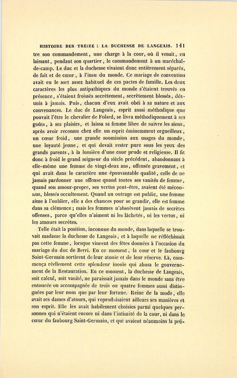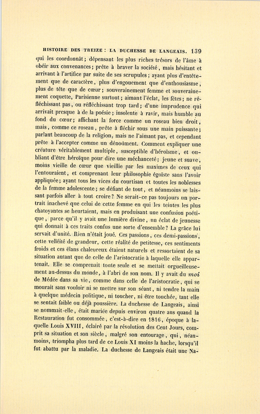 Au commencement de la vie éphémère que mena le faubourg Saint-Germain pendant la Restauration, et à laquelle, si les considérations précédentes sont vraies, il ne sut pas donner de consistance, une jeune femme fut passagèrement le type le plus complet de la nature à la fois supérieure et faible, grande et petite, de sa caste. C’était une femme artificiellement instruite, réellement ignorante ; pleine de sentiments élevés, mais manquant d’une pensée {p. 139} qui les coordonnât ; dépensant les plus riches trésors de l’âme à obéir aux convenances ; prête à braver la société, mais hésitant et arrivant à l’artifice par suite de ses scrupules ; ayant plus d’entêtement que de caractère, plus d’engouement que d’enthousiasme, plus de tête que de cœur ; souverainement femme et souverainement coquette, Parisienne surtout ; aimant l’éclat, les fêtes ; ne réfléchissant pas, ou réfléchissant trop tard ; d’une imprudence qui arrivait presque à de la poésie ; insolente à ravir, mais humble au fond du cœur ; affichant la force comme un roseau bien droit, mais, comme ce roseau, prête à fléchir sous une main puissante ; parlant beaucoup de la religion, mais ne l’aimant pas, et cependant prête à l’accepter comme un dénoûment. Comment expliquer une créature véritablement multiple, susceptible d’héroïsme, et oubliant d’être héroïque pour dire une méchanceté ; jeune et suave, moins vieille de cœur que vieillie par les maximes de ceux qui l’entouraient, et comprenant leur philosophie égoïste sans l’avoir appliquée ; ayant tous les vices du courtisan et toutes les noblesses de la femme adolescente ; se défiant de tout, et néanmoins se laissant parfois aller à tout croire ? Ne serait-ce pas toujours un portrait inachevé que celui de cette femme en qui les teintes les plus chatoyantes se heurtaient, mais en produisant une confusion poétique, parce qu’il y avait une lumière divine, un éclat de jeunesse qui donnait à ces traits confus une sorte d’ensemble ? La grâce lui servait d’unité. Rien n’était joué. Ces passions, ces demi-passions, cette velléité de grandeur, cette réalité de petitesse, ces sentiments froids et ces élans chaleureux étaient naturels et ressortaient de sa situation autant que de celle de l’aristocratie à laquelle elle appartenait. Elle se comprenait toute seule et se mettait orgueilleusement au-dessus du monde, à l’abri de son nom. Il y avait du moi de Médée dans sa vie, comme dans celle de l’aristocratie, qui se mourait sans vouloir ni se mettre sur son séant, ni tendre la main à quelque médecin politique, ni toucher, ni être touchée, tant elle se sentait faible ou déjà poussière. La duchesse de Langeais, ainsi se nommait-elle, était mariée depuis environ quatre ans quand la Restauration fut consommée, c’est-à-dire en 1816, époque à laquelle Louis XVIII, éclairé par la révolution des Cent Jours, comprit sa situation et son siècle, malgré son entourage, qui, néanmoins, triompha plus tard de ce Louis XI moins la hache, lorsqu’il fut abattu par la maladie. La duchesse de Langeais était une {p. 140} Navarreins, famille ducale, qui, depuis Louis XIV, avait pour principe de ne point abdiquer son titre dans ses alliances. Les filles de cette maison devaient avoir tôt ou tard, de même que leur mère, un tabouret à la cour. À l’âge de dix-huit ans, Antoinette de Navarreins sortit de la profonde retraite où elle avait vécu pour épouser le fils aîné du duc de Langeais. Les deux familles étaient alors éloignées du monde ; mais l’invasion de la France faisait présumer aux royalistes le retour des Bourbons comme la seule conclusion possible aux malheurs de la guerre. Les ducs de Navarreins et de Langeais, restés fidèles aux Bourbons, avaient noblement résisté à toutes les séductions de la gloire impériale, et, dans les circonstances où ils se trouvaient lors de cette union, ils durent naturellement obéir à la vieille politique de leurs familles. Mademoiselle Antoinette de Navarreins épousa donc, belle et pauvre, monsieur le marquis de Langeais, dont le père mourut quelques mois après ce mariage. Au retour des Bourbons, les deux familles reprirent leur rang, leurs charges, leurs dignités à la cour, et rentrèrent dans le mouvement social, en dehors duquel elles s’étaient tenues jusqu’alors. Elles devinrent les plus éclatantes sommités de ce nouveau monde politique. Dans ce temps de lâchetés et de fausses conversions, la conscience publique se plut à reconnaître en ces deux familles la fidélité sans tache, l’accord entre la vie privée et le caractère politique, auxquels tous les partis rendent involontairement hommage. Mais, par un malheur assez commun dans les temps de transaction, les personnes les plus pures et qui, par l’élévation de leurs vues, la sagesse de leurs principes, auraient fait croire en France à la générosité d’une politique neuve et hardie, furent écartées des affaires, qui tombèrent entre les mains de gens intéressés à porter les principes à l’extrême, pour faire preuve de dévouement. Les familles de Langeais et de Navarreins restèrent dans la haute sphère de la cour, condamnées aux devoirs de l’étiquette ainsi qu’aux reproches et aux moqueries du libéralisme, accusées de se gorger d’honneurs et de richesses, tandis que leur patrimoine ne s’augmenta point, et que les libéralités de la Liste Civile se consumèrent en frais de représentation, nécessaires à toute monarchie européenne, fût-elle même républicaine. En 1818, monsieur le duc de Langeais commandait une division militaire, et la duchesse avait, près d’une princesse, une place qui l’autorisait à demeurer à Paris, loin de son mari, sans scandale. D’ailleurs, le duc avait, {p. 141} outre son commandement, une charge à la cour, où il venait, en laissant, pendant son quartier, le command