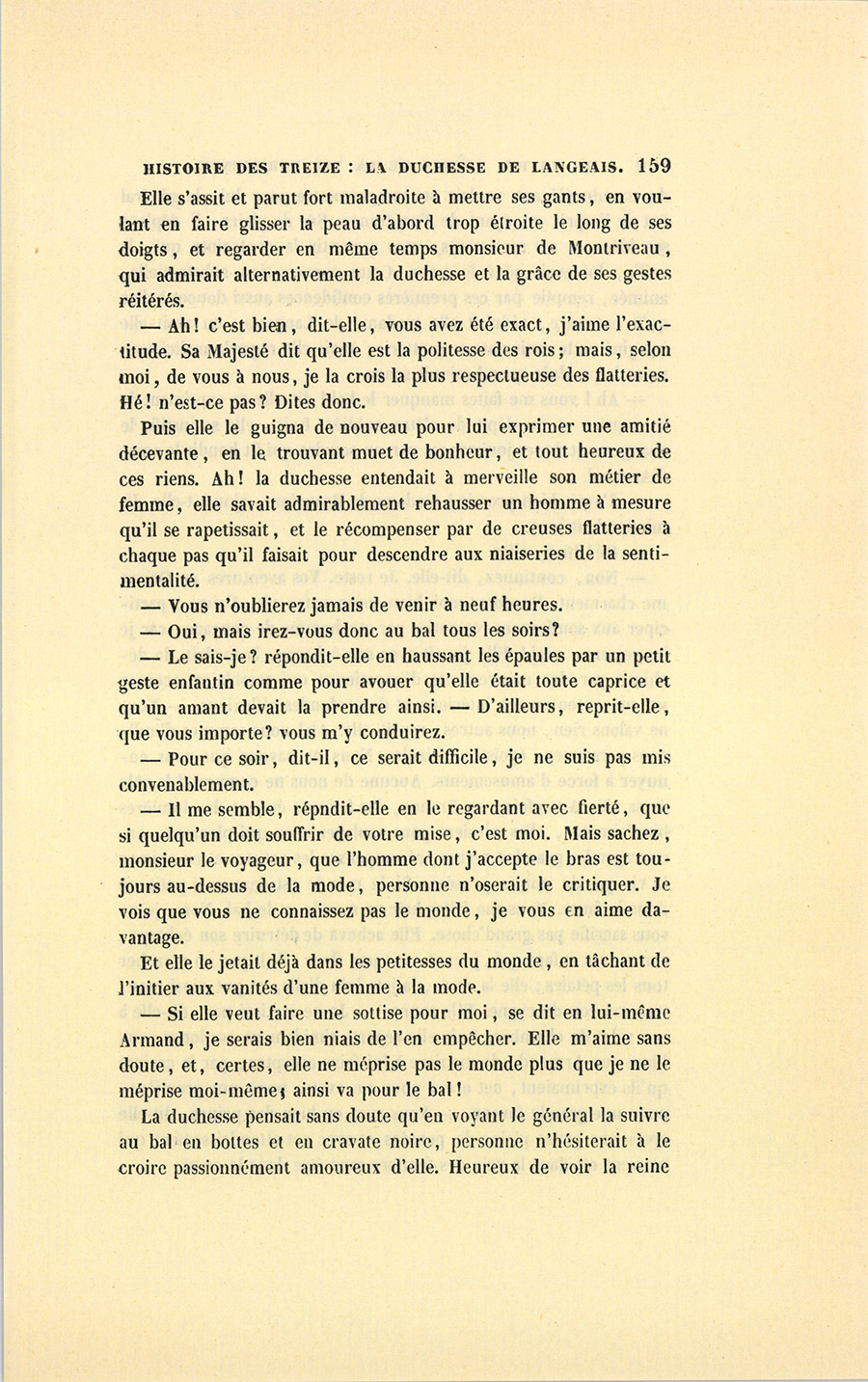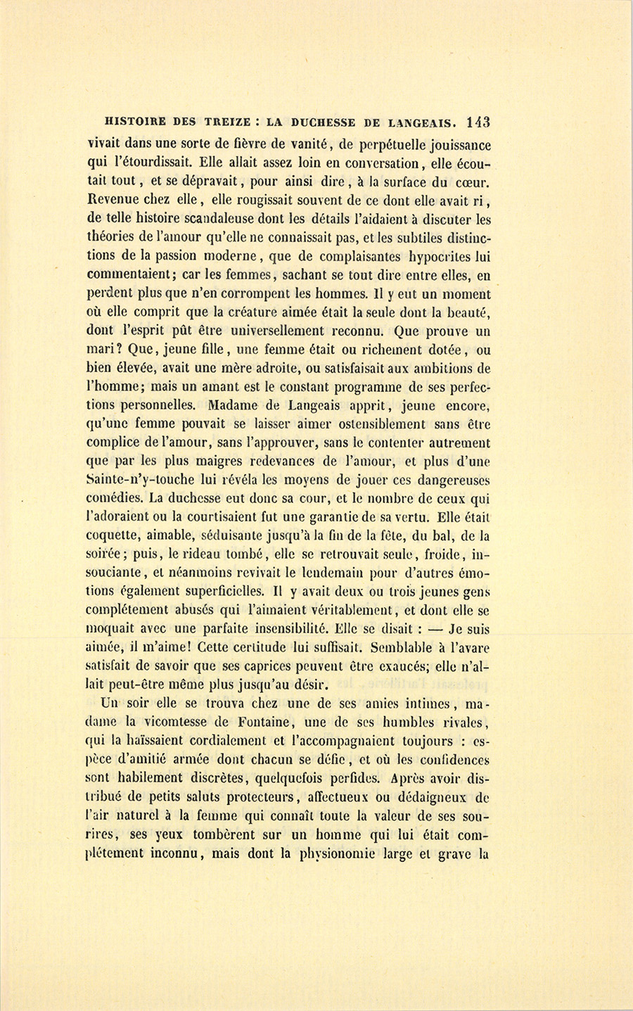 Ces phrases furent dites d’un ton si coquet, que monsieur de Montriveau ne pouvait se défendre d’accepter l’invitation. Quand il {p. 152} se rejeta dans les groupes d’hommes qui se tenaient à quelque distance des femmes, plusieurs de ses amis le félicitèrent, moitié sérieusement, moitié plaisamment, sur l’accueil extraordinaire que lui avait fait la duchesse de Langeais. Cette difficile, cette illustre conquête, était décidément faite, et la gloire en avait été réservée à l’artillerie de la Garde. Il est facile d’imaginer les bonnes et mauvaises plaisanteries que ce thème, une fois admis, suggéra dans un de ces salons parisiens où l’on aime tant à s’amuser, et où les railleries ont si peu de durée que chacun s’empresse d’en tirer toute la fleur.