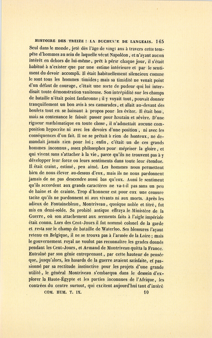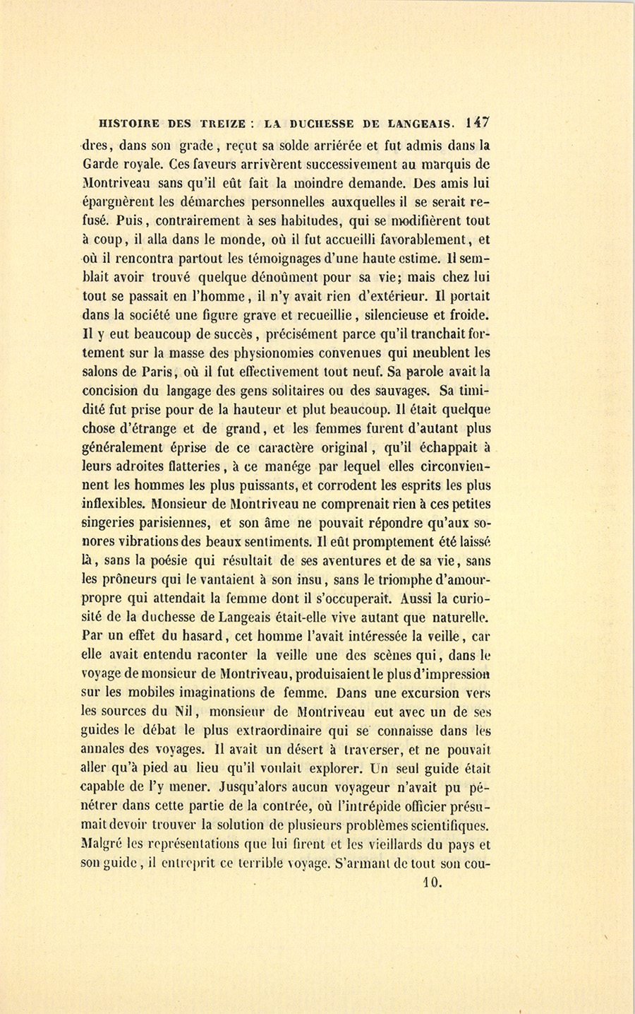 Monsieur Armand de Montriveau se trouvait en ce moment, sans le savoir, l’objet d’une curiosité générale, et le méritait plus qu’aucune de ces idoles passagères dont Paris a besoin et dont il s’amourache pour quelques jours, afin de satisfaire cette passion d’engouement et d’enthousiasme factice dont il est périodiquement travaillé. Armand de Montriveau était le fils unique du général de Montriveau, un de ces ci-devant qui servirent noblement la République, et qui périt, tué près de Joubert, à Novi. L’orphelin avait été placé par les soins de Bonaparte à l’école de Châlons, et mis, ainsi que plusieurs autres fils de généraux morts sur le champ de bataille, sous la protection de la République française. Après être sorti de cette école sans aucune espèce de fortune, il entra dans l’artillerie, et n’était encore que chef de bataillon lors du désastre de Fontainebleau. L’arme à laquelle appartenait Armand de Montriveau lui avait offert peu de chances d’avancement. D’abord le nombre des officiers y est plus limité que dans les autres corps de l’armée7 ; puis, les opinions libérales et presque républicaines que professait l’artillerie, les craintes inspirées à l’Empereur par une réunion d’hommes savants accoutumés à réfléchir, s’opposaient à la fortune militaire de la plupart d’entre eux. Aussi, contrairement aux lois ordinaires, les officiers parvenus au généralat ne furent-ils pas toujours les sujets les plus remarquables de l’arme, parce que, médiocres, ils donnaient peu de craintes. L’artillerie faisait un corps à part dans l’armée, et n’appartenait à Napoléon que sur les champs de bataille. À ces causes générales, qui peuvent expliquer les retards éprouvés dans sa carrière par Armand de Montriveau, il s’en joignait d’autres inhérentes à sa personne et à son caractère. {p. 145} Seul dans le monde, jeté dès l’âge de vingt ans à travers cette tempête d’hommes au sein de laquelle vécut Napoléon, et n’ayant aucun intérêt en dehors de lui-même, prêt à périr chaque jour, il s’était habitué à n’exister que par une estime intérieure et par le sentiment du devoir accompli. Il était habituellement silencieux comme le sont tous les hommes timides ; mais sa timidité ne venait point d’un défaut de courage, c’était une sorte de pudeur qui lui interdisait toute démonstration vaniteuse. Son intrépidité sur les champs de bataille n’était point fanfaronne ; il y voyait tout, pouvait donner tranquillement un bon avis à ses camarades, et allait au-devant des boulets tout en se baissant à propos pour les éviter. Il était bon, mais sa contenance le faisait passer pour hautain et sévère. D’une rigueur mathématique en toute chose, il n’admettait aucune composition hypocrite ni avec les devoirs d’une position, ni avec les conséquences d’un fait. Il ne se prêtait à rien de honteux, ne demandait jamais rien pour lui ; enfin, c’était un de ces grands hommes inconnus, assez philosophes pour mépriser la gloire, et qui vivent sans s’attacher à la vie, parce qu’ils ne trouvent pas à y développer leur force ou leurs sentiments dans toute leur étendue. Il était craint, estimé, peu aimé. Les hommes nous permettent bien de nous élever au-dessus d’eux, mais ils ne nous pardonnent jamais de ne pas descendre aussi bas qu’eux. Aussi le sentiment qu’ils accordent aux grands caractères ne va-t-il pas sans un peu de haine et de crainte. Trop d’honneur est pour eux une censure tacite qu’ils ne pardonnent ni aux vivants ni aux morts. Après les adieux de Fontainebleau, Montriveau, quoique noble et titré, fut mis en demi-solde. Sa probité antique effraya le Ministère de la Guerre, où son attachement aux serments faits à l’aigle impériale était connu. Lors des Cent-Jours il fut nommé colonel de la garde et resta sur le champ de bataille de Waterloo. Ses blessures l’ayant retenu en Belgique, il ne se trouva pas à l’armée de la Loire ; mais le gouvernement royal ne voulut pas reconnaître les grades donnés pendant les Cent-Jours, et Armand de Montriveau quitta la France. Entraîné par son génie entreprenant, par cette hauteur de pensée que, jusqu’alors, les hasards de la guerre avaient satisfaite, et passionné par sa rectitude instinctive pour les projets d’une grande utilité, le général Montriveau s’embarqua dans le dessein d’explorer la Haute-Égypte et les parties inconnues de l’Afrique, les contrées du centre surtout, qui excitent aujourd’hui tant d’intérêt8 {p. 146} parmi les savants. Son expédition scientifique fut longue et malheureuse. Il avait recueilli des notes précieuses destinées à résoudre les problèmes géographiques ou industriels si ardemment cherchés, et il était parvenu, non sans avoir surmonté bien des obstacles, jusqu’au cœur de l’Afrique, lorsqu’il tomba par trahison au pouvoir d’une tribu sauvage. Il fut dépouillé de tout, mis en esclavage et promené pendant deux années à travers les déserts, menacé de mort à tout moment et plus maltraité que ne l’est un animal dont s’amusent d’impitoyables enfants. Sa force de corps et sa constance d’âme lui firent supporter toutes les horreurs de sa captivité ; mais il épuisa presque toute son énergie dans son évasion, qui fut miraculeuse. Il atteignit la colonie française du Sénégal, demi-mort, en haillons, et n’ayant plus que d’informes souvenirs. Les immenses sacrifices de son voyage, l’étude des dialectes de l’Afrique, ses découvertes et ses observations, tout fut perdu. Un seul fait fera comprendre ses souffrances. Pendant quelques jours les enfants du scheik de la tribu dont il était l’esclave s’amusèrent à prendre sa tête pour but dans un jeu qui consistait à jeter d’assez loin des osselets de cheval, et à les y faire tenir. Montriveau revint à Paris vers le milieu de l’an