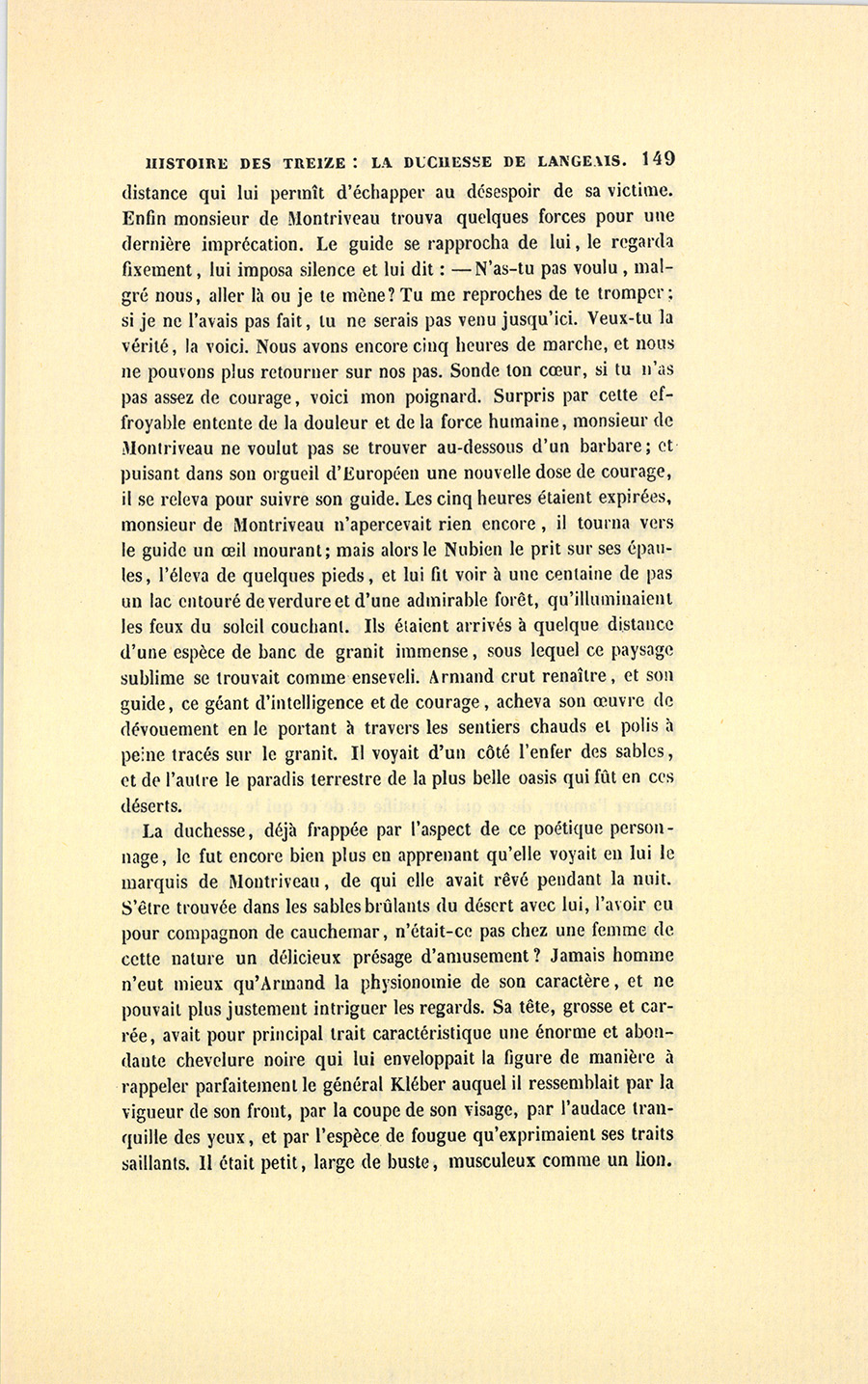 La duchesse, déjà frappée par l’aspect de ce poétique personnage, le fut encore bien plus en apprenant qu’elle voyait en lui le marquis de Montriveau, de qui elle avait rêvé pendant la nuit. S’être trouvée dans les sables brûlants du désert avec lui, l’avoir eu pour compagnon de cauchemar, n’était-ce pas chez une femme de cette nature un délicieux présage d’amusement ? Jamais homme n’eut mieux qu’Armand la physionomie de son caractère, et ne pouvait plus justement intriguer les regards. Sa tête, grosse et carrée, avait pour principal trait caractéristique une énorme et abondante chevelure noire qui lui enveloppait la figure de manière à rappeler parfaitement le général Kléber auquel il ressemblait par la vigueur de son front, par la coupe de son visage, par l’audace tranquille des yeux, et par l’espèce de fougue qu’exprimaient ses traits saillants. Il était petit, large de buste, musculeux comme un lion. {p. 150} Quand il marchait, sa pose, sa démarche, le moindre geste trahissait et je ne sais quelle sécurité de force qui imposait, et quelque chose de despotique. Il paraissait savoir que rien ne pouvait s’opposer à sa volonté, peut-être parce qu’il ne voulait rien que de juste. Néanmoins, semblable à tous les gens réellement forts, il était doux dans son parler, simple dans ses manières, et naturellement bon. Seulement toutes ces belles qualités semblaient devoir disparaître dans les circonstances graves où l’homme devient implacable dans ses sentiments, fixe dans ses résolutions, terrible dans ses actions. Un observateur aurait pu voir dans la commissure de ses lèvres un retroussement habituel qui annonçait des penchants vers l’ironie.