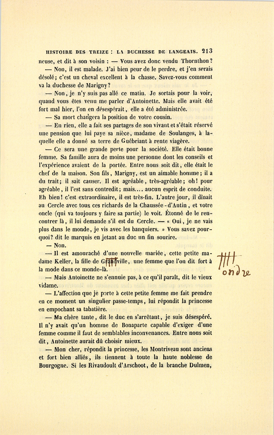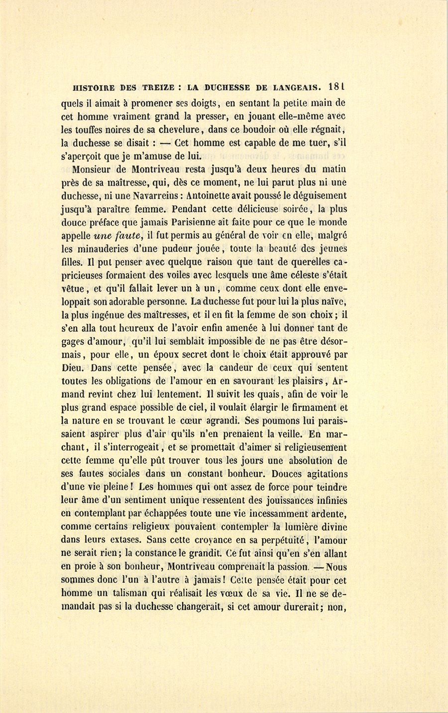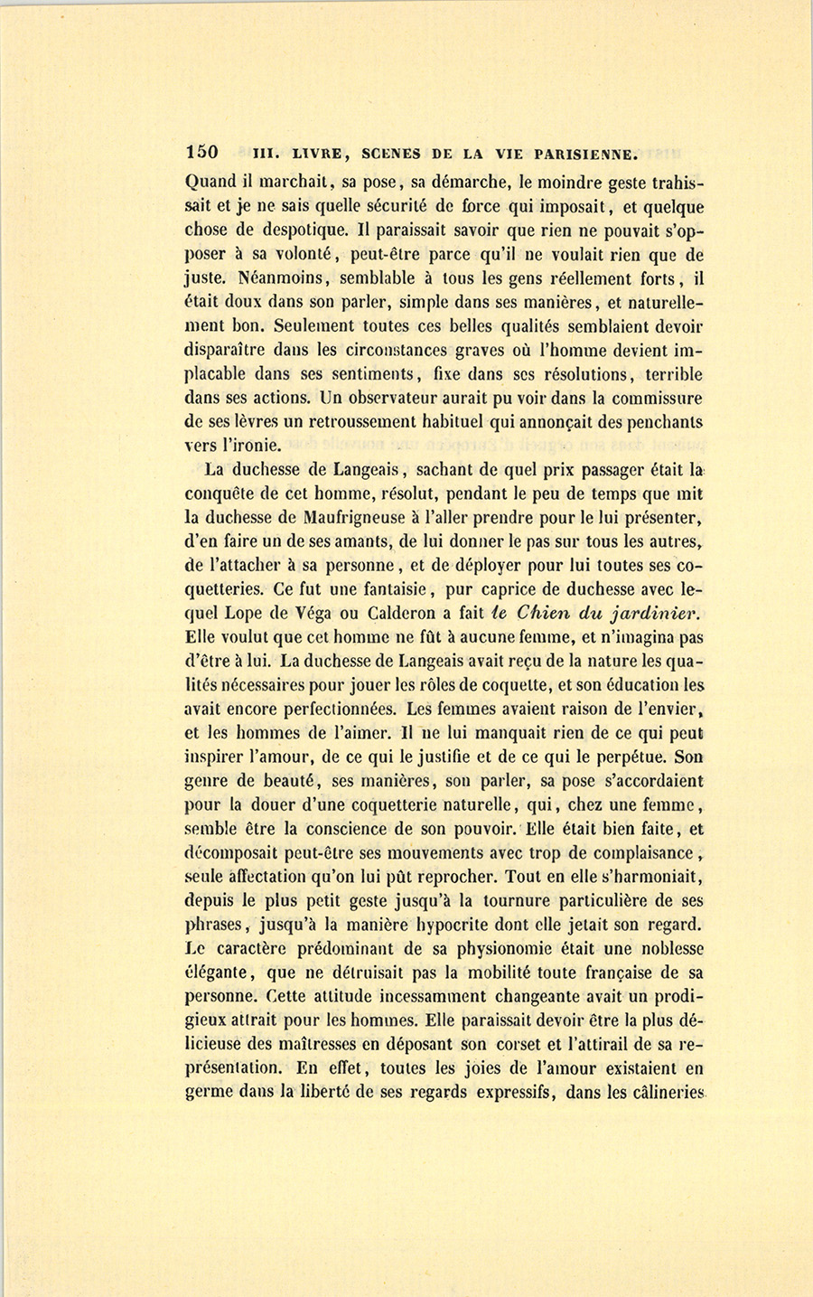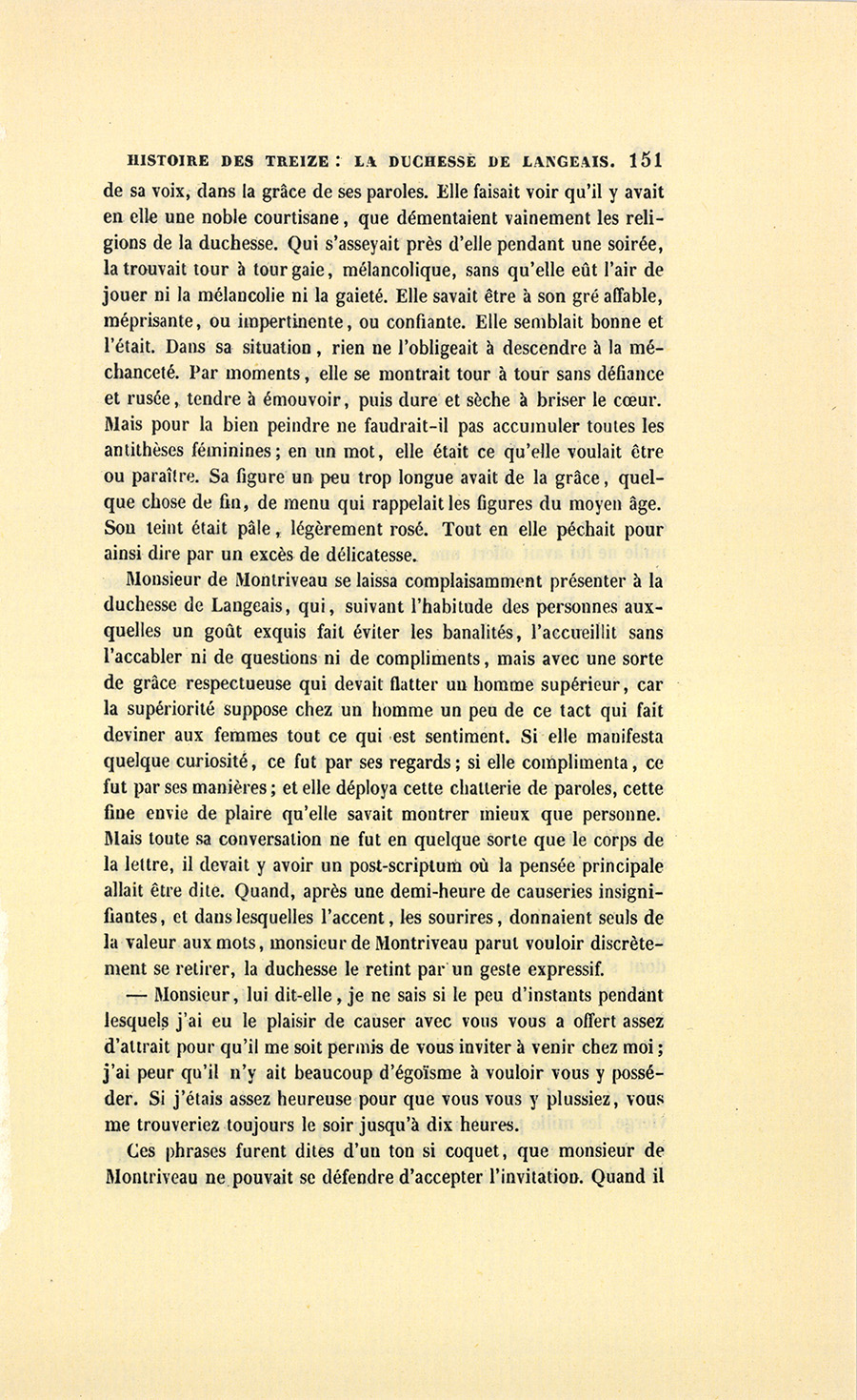 La duchesse de Langeais, sachant de quel prix passager était la conquête de cet homme, résolut, pendant le peu de temps que mit la duchesse de Maufrigneuse à l’aller prendre pour le lui présenter, d’en faire un de ses amants, de lui donner le pas sur tous les autres, de l’attacher à sa personne, et de déployer pour lui toutes ses coquetteries. Ce fut une fantaisie, pur caprice de duchesse avec lequel Lope de Véga ou Calderon a fait le Chien du jardinier. Elle voulut que cet homme ne fût à aucune femme, et n’imagina pas d’être à lui. La duchesse de Langeais avait reçu de la nature les qualités nécessaires pour jouer les rôles de coquette, et son éducation les avait encore perfectionnées. [ill.] Les femmes avaient raison de l’envier, et les hommes de l’aimer. Il ne lui manquait rien de ce qui peut inspirer l’amour, de ce qui le justifie et de ce qui le perpétue. Son genre de beauté, ses manières, son parler, sa pose s’accordaient pour la douer d’une coquetterie naturelle, qui, chez une femme, semble être la conscience de son pouvoir. Elle était bien faite, et décomposait peut-être ses mouvements avec trop de complaisance, seule affectation qu’on lui pût reprocher. Tout en elle s’harmoniait, depuis le plus petit geste jusqu’à la tournure particulière de ses phrases, jusqu’à la manière hypocrite dont elle jetait son regard. Le caractère prédominant de sa physionomie était une noblesse élégante, que ne détruisait pas la mobilité toute française de sa personne. Cette attitude incessamment changeante avait un prodigieux attrait pour les hommes. Elle paraissait devoir être la plus délicieuse des maîtresses en déposant son corset et l’attirail de sa représentation. En effet, toutes les joies de l’amour existaient en germe dans la liberté de ses regards expressifs, dans les câlineries {p. 151} de sa voix, dans la grâce de ses paroles. Elle faisait voir qu’il y avait en elle une noble courtisane, que démentaient vainement les religions de la duchesse. Qui s’asseyait près d’elle pendant une soirée, la trouvait tour à tour gaie, mélancolique, sans qu’elle eût l’air de jouer ni la mélancolie ni la gaieté. Elle savait être à son gré affable, méprisante, ou impertinente, ou confiante. Elle semblait bonne et l’était. Dans sa situation, rien ne l’obligeait à descendre à la méchanceté. Par moments, elle se montrait tour à tour sans défiance et rusée, tendre à émouvoir, puis dure et sèche à briser le cœur. Mais pour la bien peindre ne faudrait-il pas accumuler toutes les antithèses féminines ; en un mot, elle était ce qu’elle voulait être ou paraître. Sa figure un peu trop longue avait de la grâce, quelque chose de fin, de menu qui rappelait les figures du moyen âge. Son teint était pâle, légèrement rosé. Tout en elle péchait pour ainsi dire par un excès de délicatesse.