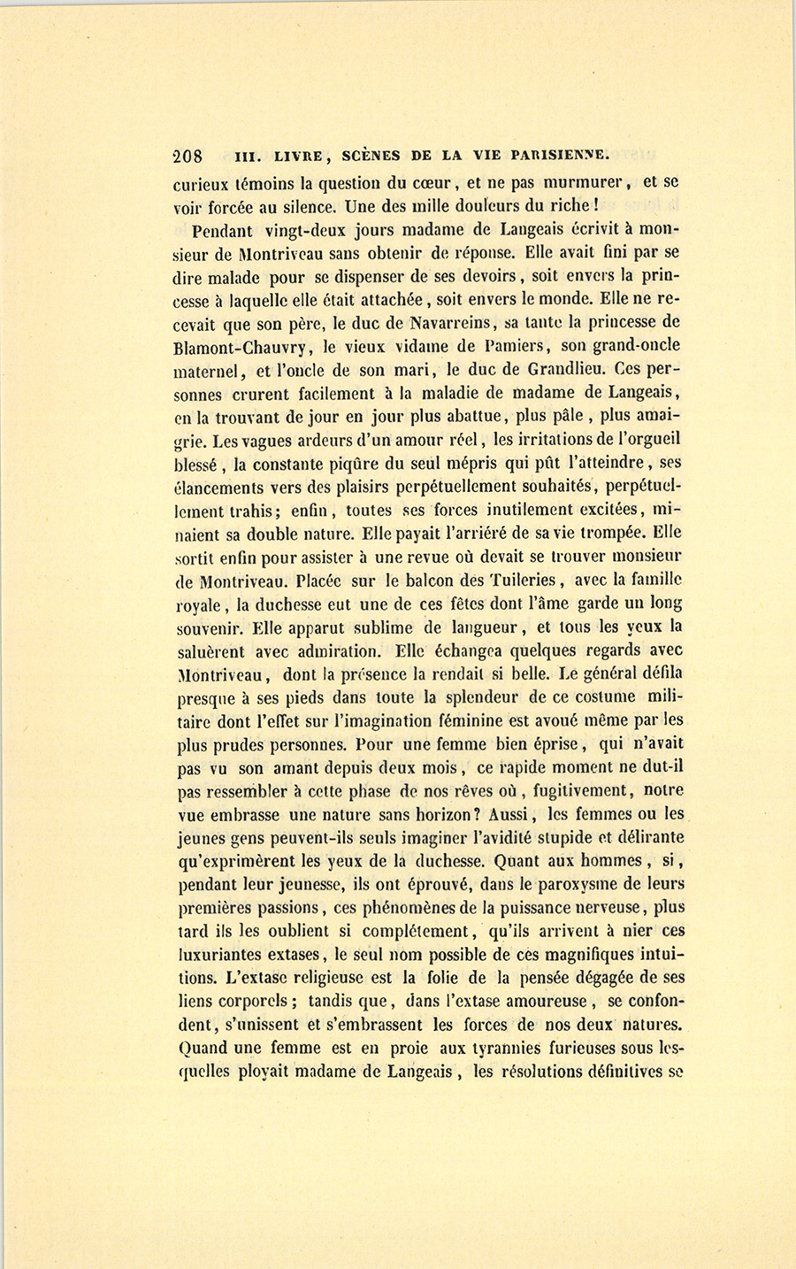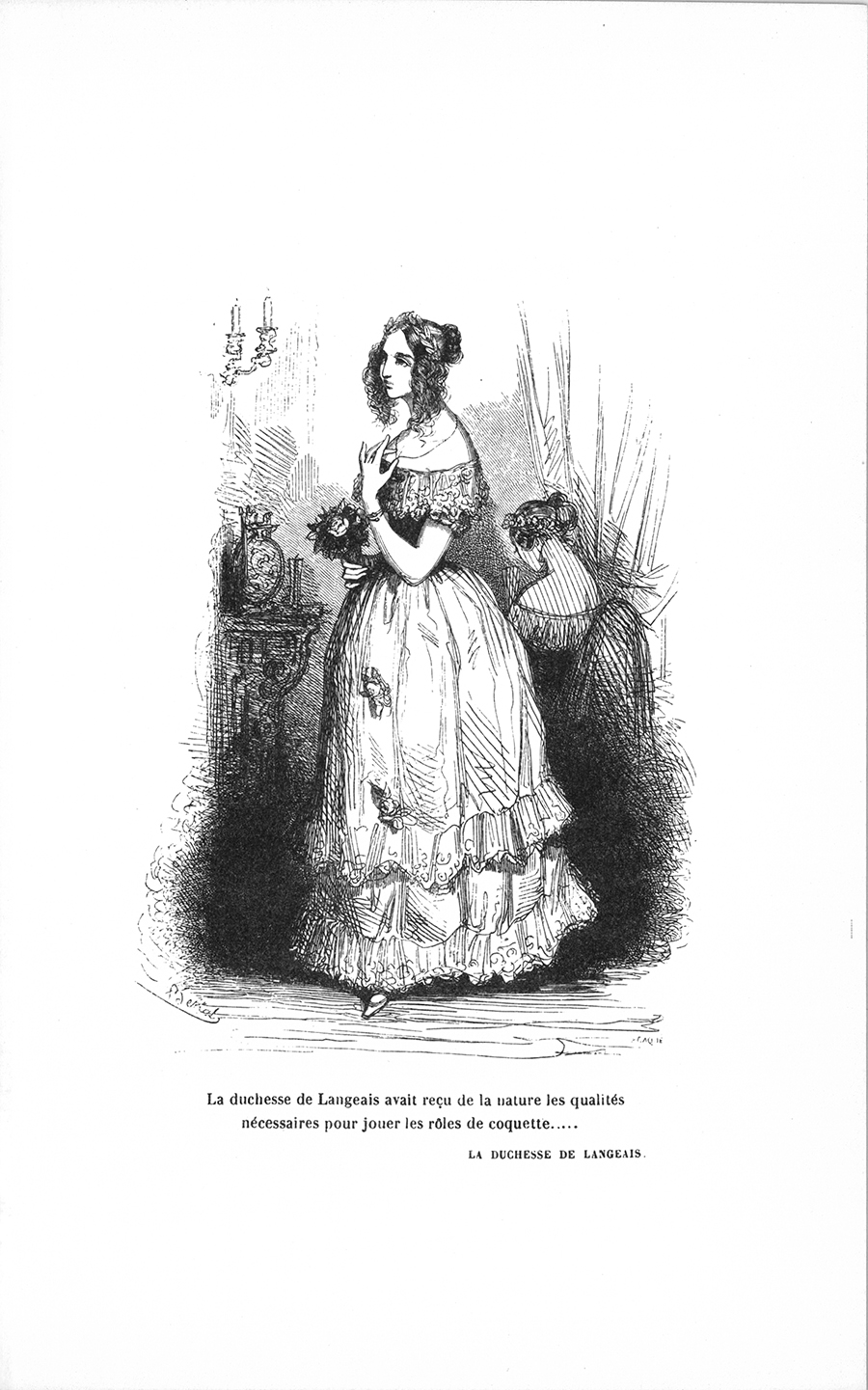 Telle était la position, inconnue du monde, dans laquelle se trouvait madame la duchesse de Langeais, et à laquelle ne réfléchissait pas cette femme, lorsque vinrent des fêtes données à l’occasion du mariage du duc de Berri. En ce moment, la cour et le faubourg Saint-Germain sortirent de leur atonie et de leur réserve. Là, commença réellement cette splendeur inouïe qui abusa le gouvernement de la Restauration. En ce moment, la duchesse de Langeais, soit calcul, soit vanité, ne paraissait jamais dans le monde sans être entourée ou accompagnée de trois ou quatre femmes aussi distinguées par leur nom que par leur fortune. Reine de la mode, elle avait ses dames d’atours, qui reproduisaient ailleurs ses manières et son esprit. Elle les avait habilement choisies parmi quelques personnes qui n’étaient encore ni dans l’intimité de la cour, ni dans le cœur du faubourg Saint-Germain, et qui avaient néanmoins la {p. 142} prétention d’y arriver ; simples Dominations qui voulaient s’élever jusqu’aux environs du trône et se mêler aux séraphiques puissances de la haute sphère nommée le petit château. Ainsi posée, la duchesse de Langeais était plus forte, elle dominait mieux, elle était plus en sûreté. Ses dames la défendaient contre la calomnie, et l’aidaient à jouer le détestable rôle de femme à la mode. Elle pouvait à son aise se moquer des hommes, des passions, les exciter, recueillir les hommages dont se nourrit toute nature féminine, et rester maîtresse d’elle-même. À Paris et dans la plus haute compagnie, la femme est toujours femme ; elle vit d’encens, de flatteries, d’honneurs. La plus réelle beauté, la figure la plus admirable n’est rien si elle n’est admirée : un amant, des flagorneries sont les attestations de sa puissance. Qu’est un pouvoir inconnu ? Rien. Supposez la plus jolie femme seule dans le coin d’un salon, elle y est triste. Quand une de ces créatures se trouve au sein des magnificences sociales, elle veut donc régner sur tous les cœurs, souvent faute de pouvoir être souveraine heureuse dans un seul. Ces toilettes, ces apprêts, ces coquetteries étaient faites pour les plus pauvres êtres qui se soient rencontrés, des fats sans esprit, des hommes dont le mérite consistait dans une jolie figure, et pour lesquels toutes les femmes se compromettaient sans profit, de véritables idoles de bois doré qui, malgré quelques exceptions, n’avaient ni les antécédents des petits-maîtres du temps de la Fronde, ni la bonne grosse valeur des héros de l’empire, ni l’esprit et les manières de leurs grands-pères, mais qui voulaient être gratis quelque chose d’approchant ; qui étaient braves comme l’est la jeunesse française, habiles sans doute s’ils eussent été mis à l’épreuve, et qui ne pouvaient rien être par le règne des vieillards usés qui les tenaient en lisière. Ce fut une époque froide, mesquine et sans poésie. Peut-être faut-il beaucoup de temps à une restauration pour devenir une monarchie.