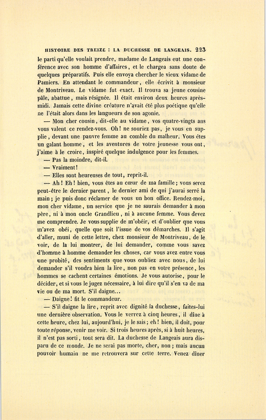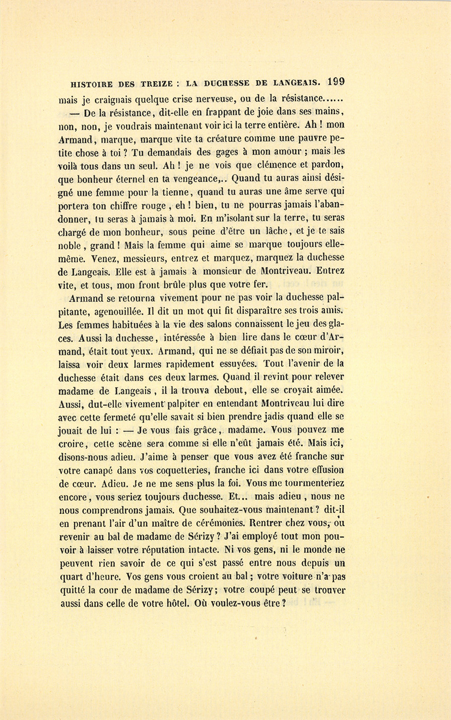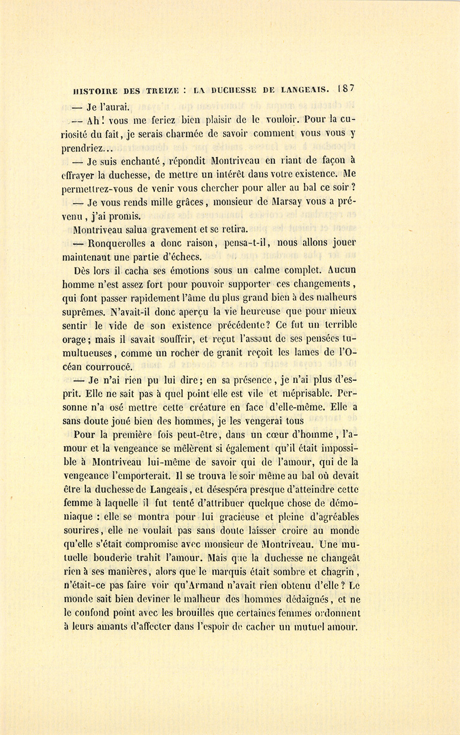 – S’il daigne la lire, reprit avec dignité la duchesse, faites-lui une dernière observation. Vous le verrez à cinq heures, il dîne à cette heure, chez lui, aujourd’hui, je le sais ; eh ! bien, il doit, pour toute réponse, venir me voir. Si trois heures après, si à huit heures, il n’est pas sorti, tout sera dit. La duchesse de Langeais aura disparu de ce monde. Je ne serai pas morte, cher, non ; mais aucun pouvoir humain ne me retrouvera sur cette terre. Venez dîner {p. 224} avec moi, j’aurai du moins un ami pour m’assister dans mes dernières angoisses. Oui, ce soir, mon cher cousin, ma vie sera décidée ; et quoi qu’il arrive, elle ne peut être que cruellement ardente. Allez, silence, je ne veux rien entendre qui ressemble soit à des observations, soit à des avis. – Causons, rions, dit-elle en lui tendant une main qu’il baisa. Soyons comme deux vieillards philosophes qui savent jouir de la vie jusqu’au moment de leur mort. Je me parerai, je serai bien coquette pour vous. Vous serez peut-être le dernier homme qui aura vu la duchesse de Langeais.