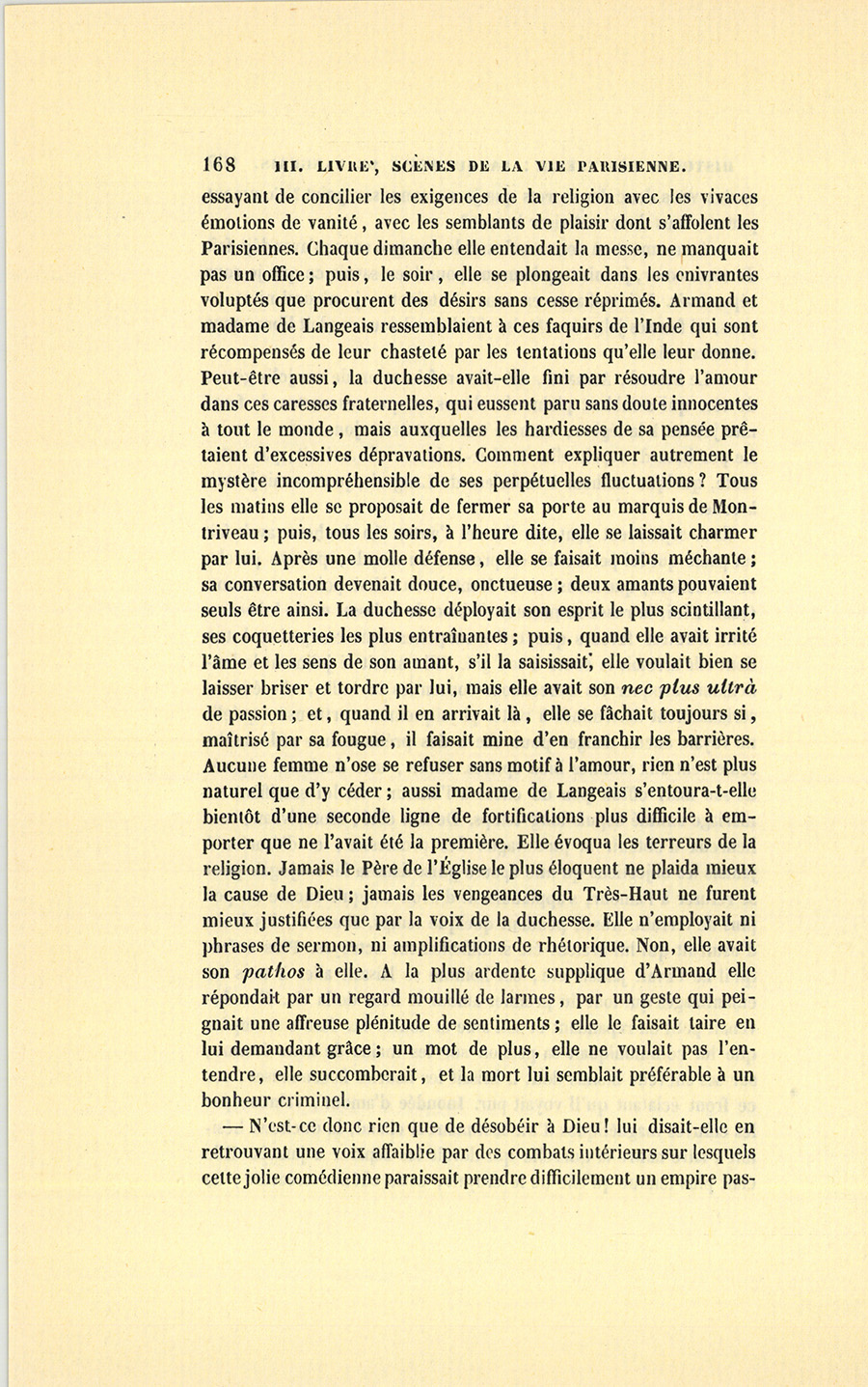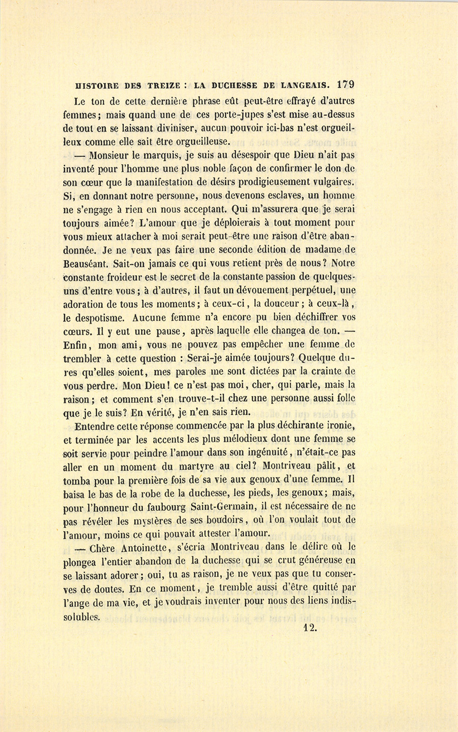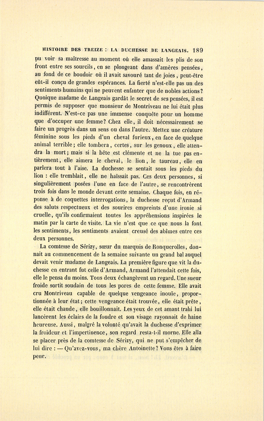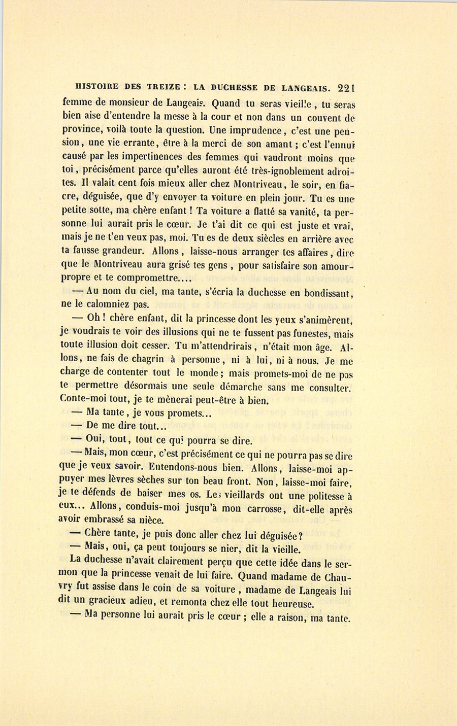 – S’il daigne la lire, reprit avec dignité la duchesse, faites-lui une dernière observation. Vous le verrez à cinq heures, il dîne à cette heure, chez lui, aujourd’hui, je le sais ; eh ! bien, il doit, pour toute réponse, venir me voir. Si trois heures après, si à huit heures, il n’est pas sorti, tout sera dit. La duchesse de Langeais aura disparu de ce monde. Je ne serai pas morte, cher, non ; mais aucun pouvoir humain ne me retrouvera sur cette terre. Venez dîner {p. 224} avec moi, j’aurai du moins un ami pour m’assister dans mes dernières angoisses. Oui, ce soir, mon cher cousin, ma vie sera décidée ; et quoi qu’il arrive, elle ne peut être que cruellement ardente. Allez, silence, je ne veux rien entendre qui ressemble soit à des observations, soit à des avis. – Causons, rions, dit-elle en lui tendant une main qu’il baisa. Soyons comme deux vieillards philosophes qui savent jouir de la vie jusqu’au moment de leur mort. Je me parerai, je serai bien coquette pour vous. Vous serez peut-être le dernier homme qui aura vu la duchesse de Langeais.