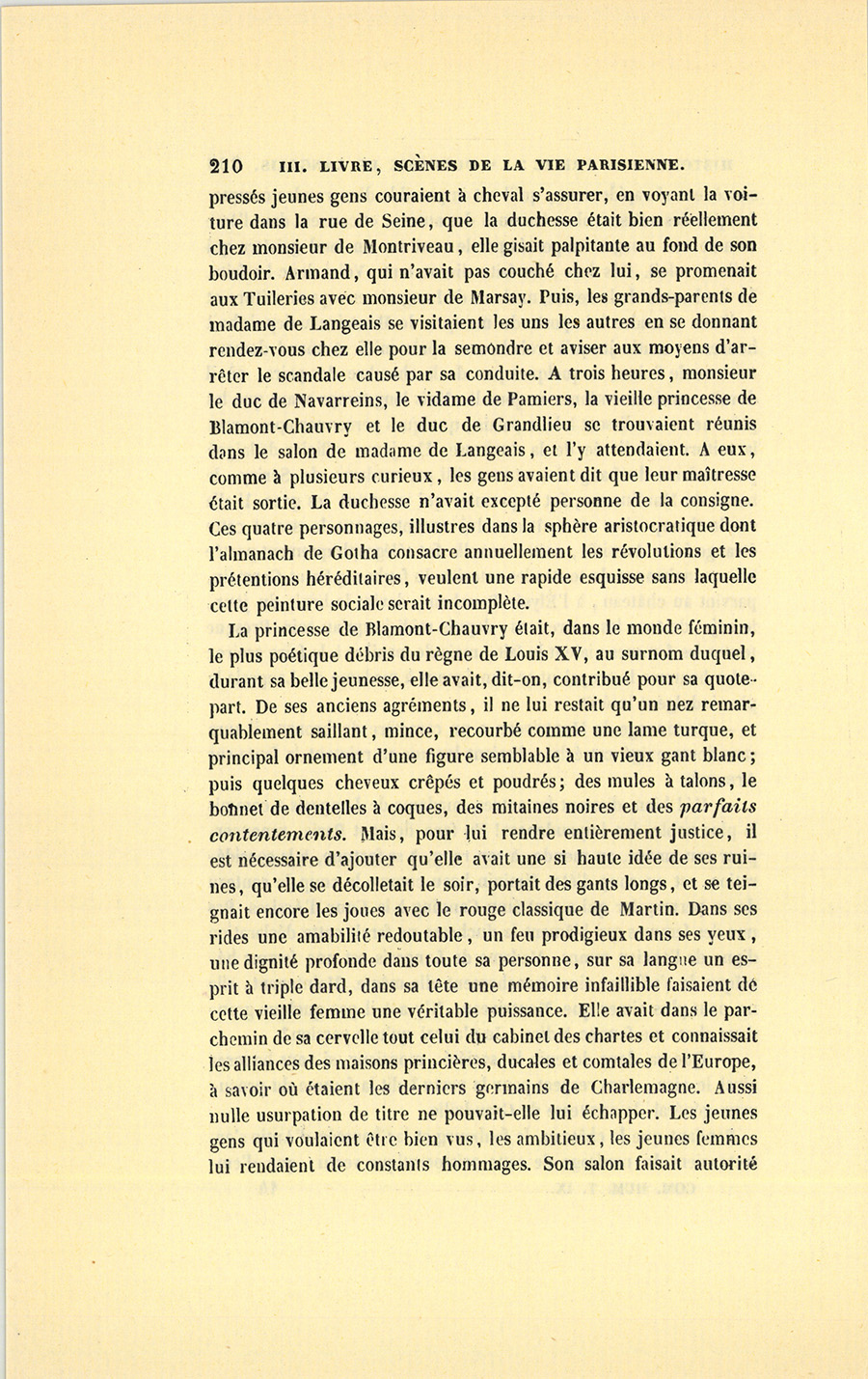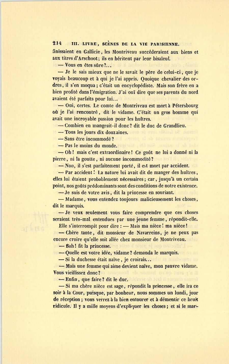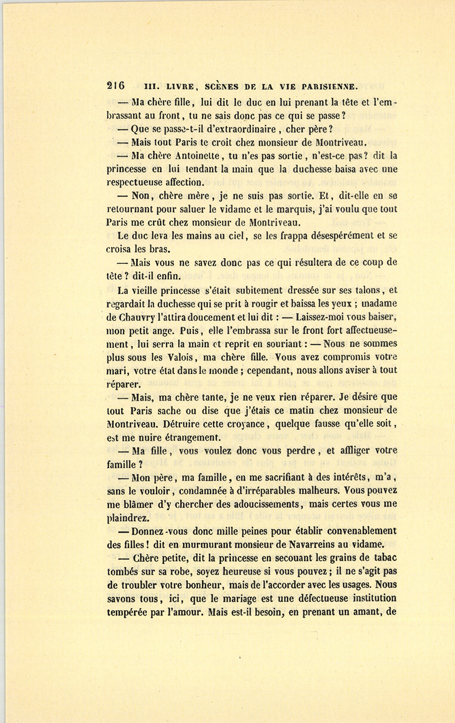 – Chère petite, dit la princesse en secouant les grains de tabac tombés sur sa robe, soyez heureuse si vous pouvez ; il ne s’agit pas de troubler votre bonheur, mais de l’accorder avec les usages. Nous savons tous, ici, que le mariage est une défectueuse institution tempérée par l’amour. Mais est-il besoin, en prenant un amant, de {p. 217} faire son lit sur le Carrousel ? Voyons, ayez un peu de raison, écoutez-nous.