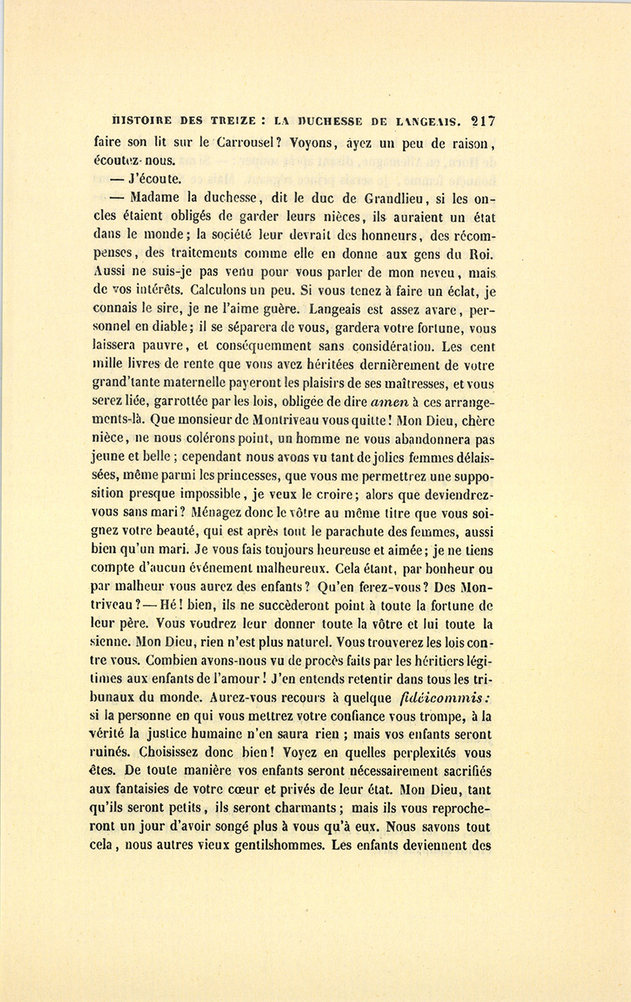 – Madame la duchesse, dit le duc de Grandlieu, si les oncles étaient obligés de garder leurs nièces, ils auraient un état dans le monde ; la société leur devrait des honneurs, des récompenses, des traitements comme elle en donne aux gens du Roi. Aussi ne suis-je pas venu pour vous parler de mon neveu, mais de vos intérêts. Calculons un peu. Si vous tenez à faire un éclat, je connais le sire, je ne l’aime guère. Langeais est assez avare, personnel en diable ; il se séparera de vous, gardera votre fortune, vous laissera pauvre, et conséquemment sans considération. Les cent mille livres de rente que vous avez héritées dernièrement de votre grand’tante maternelle payeront les plaisirs de ses maîtresses, et vous serez liée, garrottée par les lois, obligée de dire amen à ces arrangements-là. Que monsieur de Montriveau vous quitte ! Mon Dieu, chère nièce, ne nous colérons point, un homme ne vous abandonnera pas jeune et belle ; cependant nous avons vu tant de jolies femmes délaissées, même parmi les princesses, que vous me permettrez une supposition presque impossible, je veux le croire ; alors que deviendrez-vous sans mari ? Ménagez donc le vôtre au même titre que vous soignez votre beauté, qui est après tout le parachute des femmes, aussi bien qu’un mari. Je vous fais toujours heureuse et aimée ; je ne tiens compte d’aucun événement malheureux. Cela étant, par bonheur ou par malheur vous aurez des enfants ? Qu’en ferez-vous ? Des Montriveau ? – Hé ! bien, ils ne succèderont point à toute la fortune de leur père. Vous voudrez leur donner toute la vôtre et lui toute la sienne. Mon Dieu, rien n’est plus naturel. Vous trouverez les lois contre vous. Combien avons-nous vu de procès faits par les héritiers légitimes aux enfants de l’amour ! J’en entends retentir dans tous les tribunaux du monde. Aurez-vous recours à quelque fidéicommis : si la personne en qui vous mettrez votre confiance vous trompe, à la vérité la justice humaine n’en saura rien ; mais vos enfants seront ruinés. Choisissez donc bien ! Voyez en quelles perplexités vous êtes. De toute manière vos enfants seront nécessairement sacrifiés aux fantaisies de votre cœur et privés de leur état. Mon Dieu, tant qu’ils seront petits, ils seront charmants ; mais ils vous reprocheront un jour d’avoir songé plus à vous qu’à eux. Nous savons tout cela, nous autres vieux gentilshommes. Les enfants deviennent des {p. 218} hommes, et les hommes sont ingrats. N’ai-je pas entendu le jeune de Horn, en Allemagne, disant après souper : – Si ma mère avait été honnête femme, je serais prince régnant. Mais ce SI, nous avons passé notre vie à l’entendre dire aux roturiers, et il a fait la révolution. Quand les hommes ne peuvent accuser ni leur père, ni leur mère, ils s’en prennent à Dieu de leur mauvais sort. En somme, chère enfant, nous sommes ici pour vous éclairer. Hé ! bien, je me résume par un mot que vous devez méditer : une femme ne doit jamais donner raison à son mari.