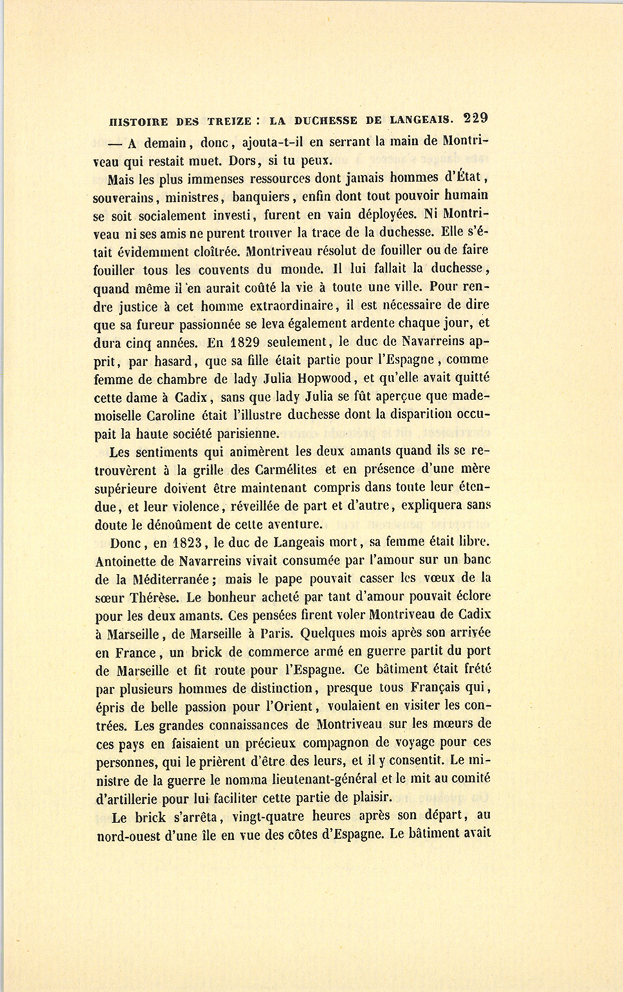 Donc, en 1823, le duc de Langeais mort, sa femme était libre. Antoinette de Navarreins vivait consumée par l’amour sur un banc de la Méditerranée ; mais le pape pouvait casser les vœux de la sœur Thérèse. Le bonheur acheté par tant d’amour pouvait éclore pour les deux amants. Ces pensées firent voler Montriveau de Cadix à Marseille, de Marseille à Paris. Quelques mois après son arrivée en France, un brick de commerce armé en guerre partit du port de Marseille et fit route pour l’Espagne. Ce bâtiment était frété par plusieurs hommes de distinction, presque tous Français qui, épris de belle passion pour l’Orient, voulaient en visiter les contrées. Les grandes connaissances de Montriveau sur les mœurs de ces pays en faisaient un précieux compagnon de voyage pour ces personnes, qui le prièrent d’être des leurs, et il y consentit. Le ministre de la guerre le nomma lieutenant-général et le mit au comité d’artillerie pour lui faciliter cette partie de plaisir.