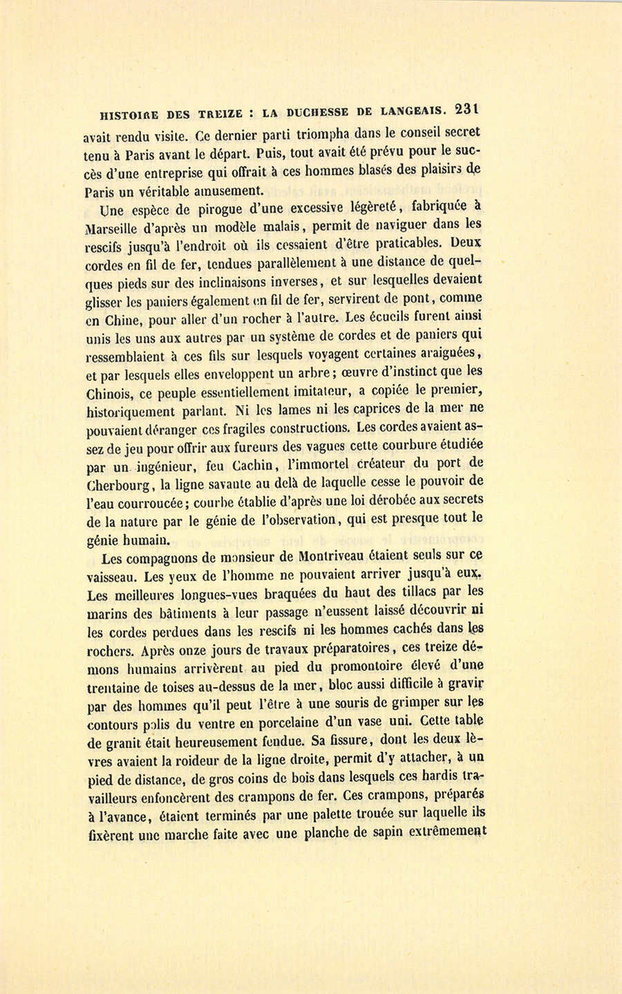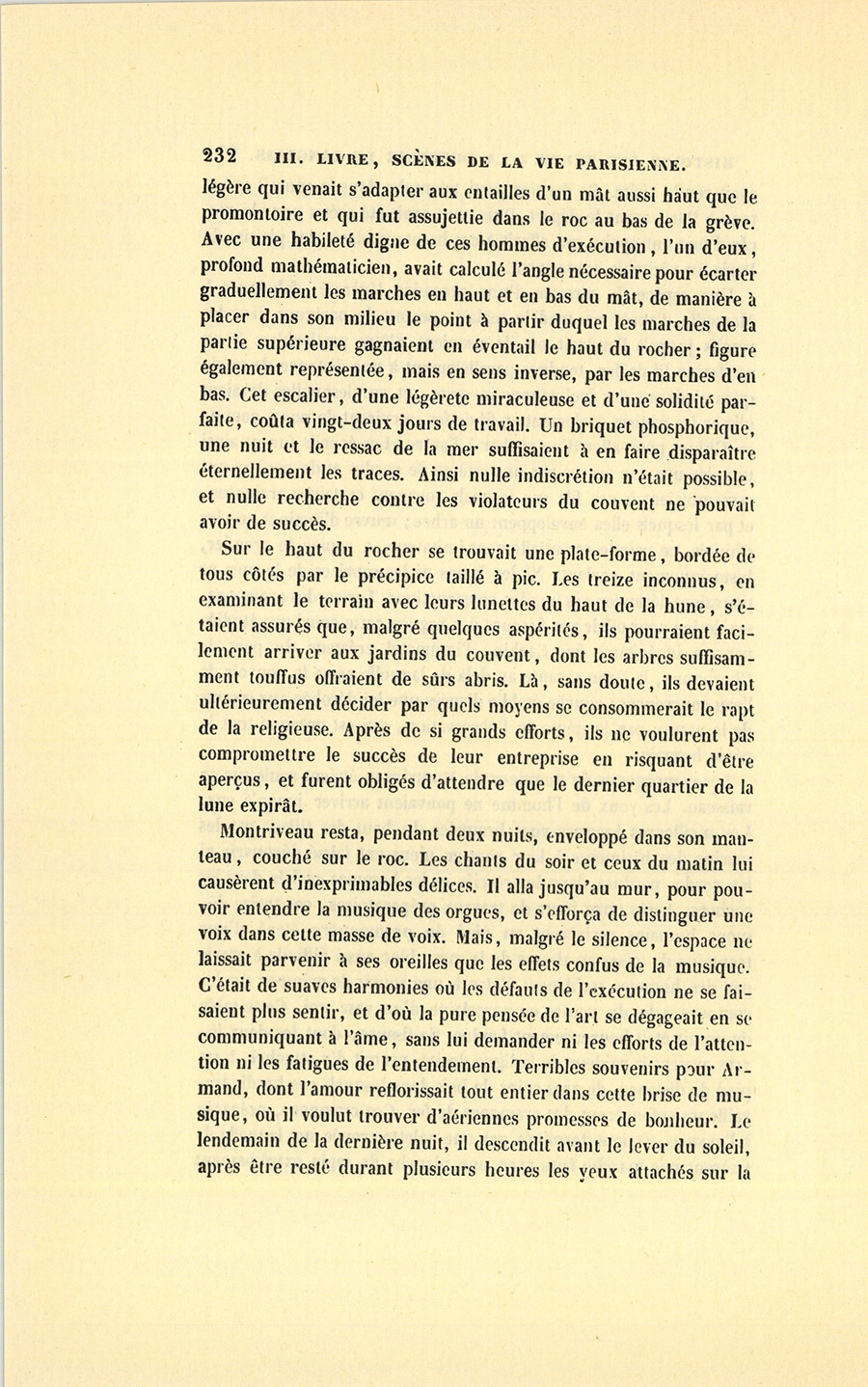 Les compagnons de monsieur de Montriveau étaient seuls sur ce vaisseau. Les yeux de l’homme ne pouvaient arriver jusqu’à eux. Les meilleures longues-vues braquées du haut des tillacs par les marins des bâtiments à leur passage n’eussent laissé découvrir ni les cordes perdues dans les rescifs ni les hommes cachés dans les rochers. Après onze jours de travaux préparatoires, ces treize démons humains arrivèrent au pied du promontoire élevé d’une trentaine de toises au-dessus de la mer, bloc aussi difficile à gravir par des hommes qu’il peut l’être à une souris de grimper sur les contours polis du ventre en porcelaine d’un vase uni. Cette table de granit était heureusement fendue. Sa fissure, dont les deux lèvres avaient la roideur de la ligne droite, permit d’y attacher, à un pied de distance, de gros coins de bois dans lesquels ces hardis travailleurs enfoncèrent des crampons de fer. Ces crampons, préparés à l’avance, étaient terminés par une palette trouée sur laquelle ils fixèrent une marche faite avec une planche de sapin extrêmement {p. 232} légère qui venait s’adapter aux entailles d’un mât aussi haut que le promontoire et qui fut assujettie dans le roc au bas de la grève. Avec une habileté digne de ces hommes d’exécution, l’un d’eux, profond mathématicien, avait calculé l’angle nécessaire pour écarter graduellement les marches en haut et en bas du mât, de manière à placer dans son milieu le point à partir duquel les marches de la partie supérieure gagnaient en éventail le haut du rocher ; figure également représentée, mais en sens inverse, par les marches d’en bas. Cet escalier, d’une légèreté miraculeuse et d’une solidité parfaite, coûta vingt-deux jours de travail. Un briquet phosphorique, une nuit et le ressac de la mer suffisaient à en faire disparaître éternellement les traces. Ainsi nulle indiscrétion n’était possible, et nulle recherche contre les violateurs du couvent ne pouvait avoir de succès.