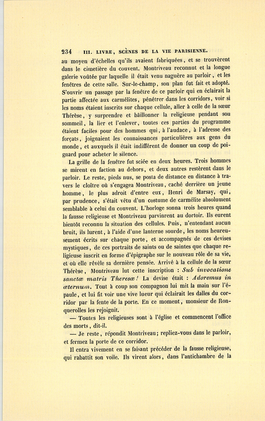 La grille de la fenêtre fut sciée en deux heures. Trois hommes se mirent en faction au dehors, et deux autres restèrent dans le parloir. Le reste, pieds nus, se posta de distance en distance à travers le cloître où s’engagea Montriveau, caché derrière un jeune homme, le plus adroit d’entre eux, Henri de Marsay, qui, par prudence, s’était vêtu d’un costume de carmélite absolument semblable à celui du couvent. L’horloge sonna trois heures quand la fausse religieuse et Montriveau parvinrent au dortoir. Ils eurent bientôt reconnu la situation des cellules. Puis, n’entendant aucun bruit, ils lurent, à l’aide d’une lanterne sourde, les noms heureusement écrits sur chaque porte, et accompagnés de ces devises mystiques, de ces portraits de saints ou de saintes que chaque religieuse inscrit en forme d’épigraphe sur le nouveau rôle de sa vie, et où elle révèle sa dernière pensée. Arrivé à la cellule de la sœur Thérèse, Montriveau lut cette inscription : Sub invocatione sanctæ, matris Theresæ ! La devise était : Adoremus in æternum. Tout à coup son compagnon lui mit la main sur l’épaule, et lui fit voir une vive lueur qui éclairait les dalles du corridor par la fente de la porte. En ce moment, monsieur de Ronquerolles les rejoignit.