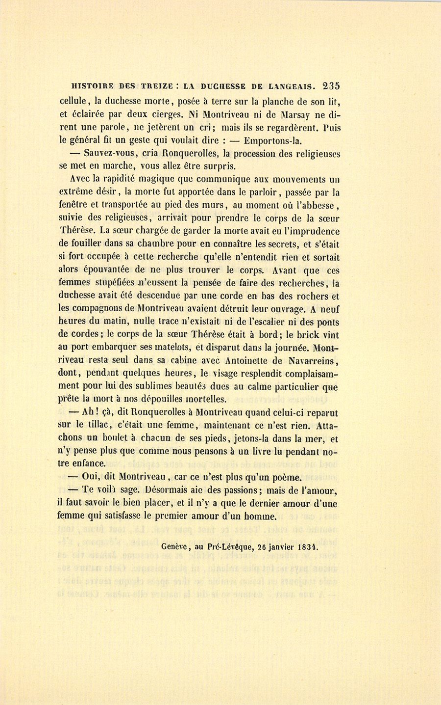 Il entra vivement en se faisant précéder de la fausse religieuse, qui rabattit son voile. Ils virent alors, dans l’antichambre de la {p. 235} cellule, la duchesse morte, posée à terre sur la planche de son lit, et éclairée par deux cierges. Ni Montriveau ni de Marsay ne dirent une parole, ne jetèrent un cri ; mais ils se regardèrent. Puis le général fit un geste qui voulait dire : – Emportons-la.