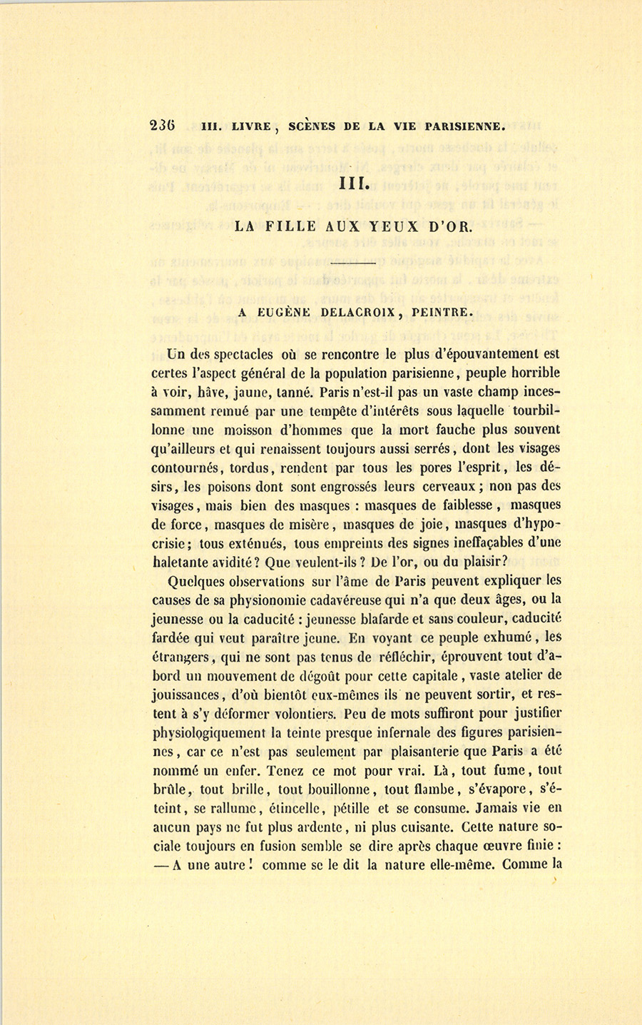 Henri resta pendant un moment plongé dans de joyeuses réflexions. Disons-le à la louange des femmes, il obtenait toutes celles qu’il daignait désirer. Et que faudrait-il donc penser d’une femme sans amant, qui aurait su résister à un jeune homme armé de la beauté qui est l’esprit du corps, armé de l’esprit qui est une grâce de l’âme, armé de la force morale et de la fortune qui sont les deux seules puissances réelles ? Mais en triomphant aussi facilement, de Marsay devait s’ennuyer de ses triomphes ; aussi, depuis environ deux ans s’ennuyait-il beaucoup. En plongeant au fond des voluptés, il en rapportait plus de gravier que de perles. Donc il en était venu, comme les souverains, à implorer du hasard quelque obstacle à vaincre, quelque entreprise qui demandât le déploiement de ses forces morales et physiques inactives. Quoique Paquita Valdès lui présentât le merveilleux assemblage des perfections dont il n’avait encore joui qu’en détail, l’attrait de la passion était presque nul chez lui. Une satiété constante avait affaibli dans son cœur le sentiment de l’amour. Comme les vieillards et les gens blasés, il n’avait plus que des {p. 265} caprices extravagants, des goûts ruineux, des fantaisies qui, satisfaites, ne lui laissaient aucun bon souvenir au cœur. Chez les jeunes gens, l’amour est le plus beau des sentiments, il fait fleurir la vie dans l’âme, il épanouit par sa puissance solaire les plus belles inspirations et leurs grandes pensées : les prémices en toute chose ont une délicieuse saveur. Chez les hommes, l’amour devient une passion : la force mène à l’abus. Chez les vieillards, il se tourne au vice : l’impuissance conduit à l’extrême. Henri était à la fois vieillard, homme et jeune. Pour lui rendre les émotions d’un véritable amour, il lui fallait comme à Lovelace une Clarisse Harlowe. Sans le reflet magique de cette perle introuvable, il ne pouvait plus avoir que, soit des passions aiguisées par quelque vanité parisienne, soit des partis pris avec lui-même de faire arriver telle femme à tel degré de corruption, soit des aventures qui stimulassent sa curiosité. Le rapport de Laurent, son valet de chambre, venait de donner un prix énorme à la Fille aux yeux d’or. Il s’agissait de livrer bataille à quelque ennemi secret, qui paraissait aussi dangereux qu’habile ; et, pour remporter la victoire, toutes les forces dont Henri pouvait disposer n’étaient pas inutiles. Il allait jouer cette éternelle vieille comédie qui sera toujours neuve, et dont les personnages sont un vieillard, une jeune fille et un amoureux : don Hijos, Paquita, de Marsay. Si Laurent valait Figaro, la duègne paraissait incorruptible. Ainsi, la pièce vivante était plus fortement nouée par le hasard qu’elle ne l’avait jamais été par aucun auteur dramatique ! Mais aussi le hasard n’est-il pas un homme de génie ?