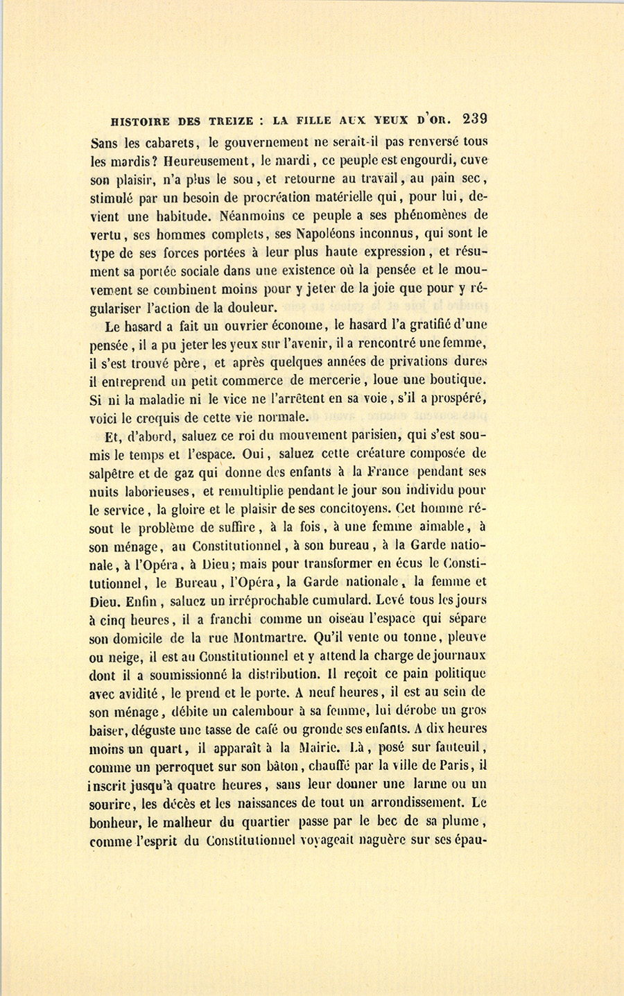 Et, d’abord, saluez ce roi du mouvement parisien, qui s’est soumis le temps et l’espace. Oui, saluez cette créature composée de salpêtre et de gaz qui donne des enfants à la France pendant ses nuits laborieuses, et remultiplie pendant le jour son individu pour le service, la gloire et le plaisir de ses concitoyens. Cet homme résout le problème de suffire, à la fois, à une femme aimable, à son ménage, au Constitutionnel, à son bureau, à la Garde nationale, à l’Opéra, à Dieu ; mais pour transformer en écus le Constitutionnel, le Bureau, l’Opéra, la Garde nationale, la femme et Dieu. Enfin, saluez un irréprochable cumulard. Levé tous les jours à cinq heures, il a franchi comme un oiseau l’espace qui sépare son domicile de la rue Montmartre. Qu’il vente ou tonne, pleuve ou neige, il est au Constitutionnel et y attend la charge de journaux dont il a soumissionné la distribution. Il reçoit ce pain politique avec avidité, le prend et le porte. À neuf heures, il est au sein de son ménage, débite un calembour à sa femme, lui dérobe un gros baiser, déguste une tasse de café ou gronde ses enfants. À dix heures moins un quart, il apparaît à la Mairie. Là, posé sur un fauteuil, comme un perroquet sur son bâton, chauffé par la ville de Paris, il inscrit jusqu’à quatre heures, sans leur donner une larme ou un sourire, les décès et les naissances de tout un arrondissement. Le bonheur, le malheur du quartier passe par le bec de sa plume, comme l’esprit du Constitutionnel voyageait naguère sur ses {p. 240} épaules. Rien ne lui pèse ! Il va toujours droit devant lui, prend son patriotisme tout fait dans le journal, ne contredit personne, crie ou applaudit avec tout le monde, et vit en hirondelle. À deux pas de sa paroisse, il peut, en cas d’une cérémonie importante, laisser sa place à un surnuméraire, et aller chanter un requiem au lutrin de l’église, dont il est, le dimanche et les jours de fête, le plus bel ornement, la voix la plus imposante, où il tord avec énergie sa large bouche en faisant tonner un joyeux Amen. Il est chantre. Libéré à quatre heures de son service officiel, il apparaît pour répandre la joie et la gaieté au sein de la boutique la plus célèbre qui soit en la Cité. Heureuse est sa femme, il n’a pas le temps d’être jaloux ; il est plutôt homme d’action que de sentiment. Aussi, dès qu’il arrive, agace-t-il les demoiselles de comptoir, dont les yeux vifs attirent force chalands ; se gaudit au sein des parures, des fichus, de la mousseline façonnée par ces habiles ouvrières ; ou, plus souvent encore, avant de dîner, il sert une pratique, copie une page du journal ou porte chez l’huissier quelque effet en retard. À six heures, tous les deux jours, il est fidèle à son poste. Inamovible basse-taille des chœurs, il se trouve à l’Opéra, prêt à y devenir soldat Arabe, prisonnier, sauvage, paysan, ombre, pate de chameau, lion, diable, génie, esclave, eunuque noir ou blanc, toujours expert à produire de la joie, de la douleur, de la pitié, de l’étonnement, à pousser d’invariables cris, à se taire, à chasser, à se battre, à représenter Rome ou l’Égypte ; mais toujours in petto, mercier. À minuit, il redevient bon mari, homme, tendre père, il se glisse dans le lit conjugal, l’imagination encore tendue par les formes décevantes des nymphes de l’Opéra, et fait ainsi tourner, au profit de l’amour conjugal, les dépravations du monde et les voluptueux ronds de jambe de la Taglioni. Enfin, s’il dort, il dort vite, et dépêche son sommeil comme il a dépêché sa vie. N’est-ce pas le mouvement fait homme, l’espace incarné, le protée de la civilisation ? Cet homme résume tout : histoire, littérature, politique, gouvernement, religion, art militaire. N’est-ce pas une encyclopédie vivante, un atlas grotesque, sans cesse en marche comme Paris et qui jamais ne repose ? En lui tout est jambes. Aucune physionomie ne saurait se conserver pure en de tels travaux. Peut-être l’ouvrier qui meurt vieux à trente ans, l’estomac tanné par les doses progressives de son eau-de-vie, sera-t-il trouvé, au dire de quelques philosophes bien rentés, plus heureux que ne {p. 241} l’est le mercier. L’un périt d’un seul coup et l’autre en détail. De ses huit industries, de ses épaules, de son gosier, de ses mains, de sa femme et de son commerce, celui-ci retire, comme d’autant de fermes, des enfants, quelques mille francs et le plus laborieux bonheur qui ait jamais récréé cœur d’homme. Cette fortune et ces enfants, ou les enfants qui résument tout pour lui, deviennent la proie du monde supérieur, auquel il porte ses écus et sa fille, ou son fils élevé au collége, qui, plus instruit que ne l’est son père, jette plus haut ses regards ambitieux. Souvent le cadet d’un petit détaillant veut être quelque chose dans l’État.