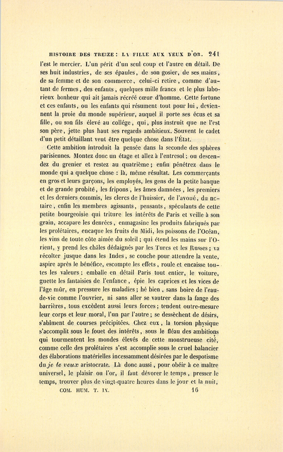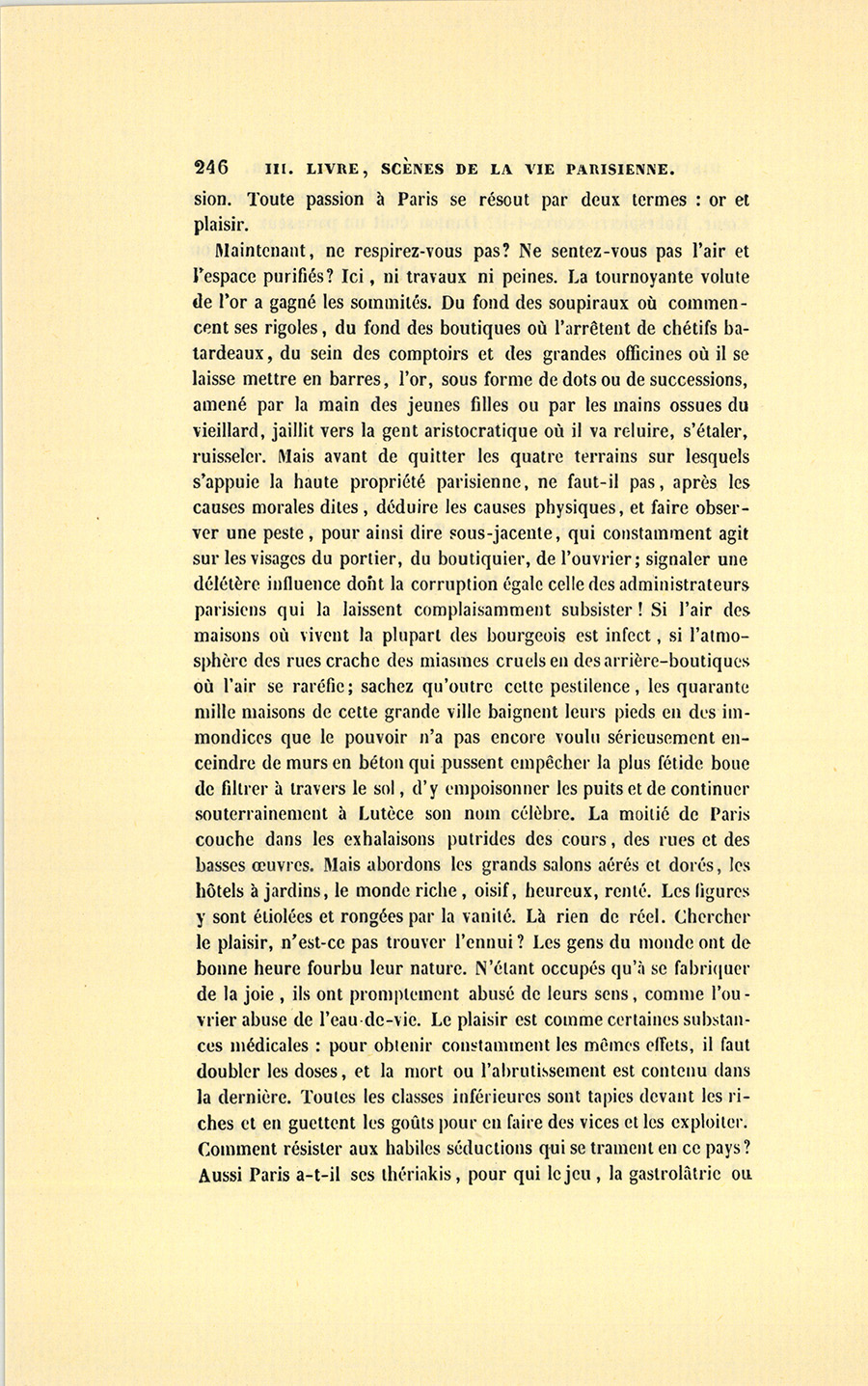 À force de s’intéresser à tout, le Parisien finit par ne s’intéresser à rien. Aucun sentiment ne dominant sur sa face usée par le frottement, elle devient grise comme le plâtre des maisons qui a reçu toute espèce de poussière et de fumée. En effet, indifférent la veille à ce dont il s’enivrera le lendemain, le Parisien vit en enfant quel que soit son âge. Il murmure de tout, se console de tout, se moque de tout, oublie tout, veut tout, goûte à tout, prend tout avec passion, quitte tout avec insouciance ; ses rois, ses conquêtes, sa gloire, son idole, qu’elle soit de bronze ou de verre ; comme il jette ses bas, ses chapeaux et sa fortune. À Paris, aucun sentiment ne résiste au jet des choses, et leur courant oblige à une lutte qui détend les passions : l’amour y est un désir, et la haine une velléité ; il n’y a là de vrai parent que le billet de mille francs, d’autre ami que le Mont-de-Piété. Ce laissez-aller général porte ses fruits ; et, dans le salon, comme dans la rue, personne n’y est de trop, personne n’y est absolument utile, ni absolument nuisible : les sots et les fripons, comme les gens d’esprit ou de probité. Tout y est toléré, le gouvernement et la guillotine, la religion et le choléra. Vous convenez toujours à ce monde, vous n’y manquez jamais. Qui donc domine en ce pays sans mœurs, sans croyance, sans aucun sentiment ; mais d’où partent et où aboutissent tous les sentiments, toutes les croyances et toutes les mœurs ? L’or et le plaisir. Prenez ces deux mots comme une lumière et parcourez cette grande cage de plâtre, cette ruche à ruisseaux noirs, et suivez-y les serpenteaux de cette pensée qui l’agite, la soulève, la travaille ? Voyez. Examinez d’abord le monde qui n’a rien ?