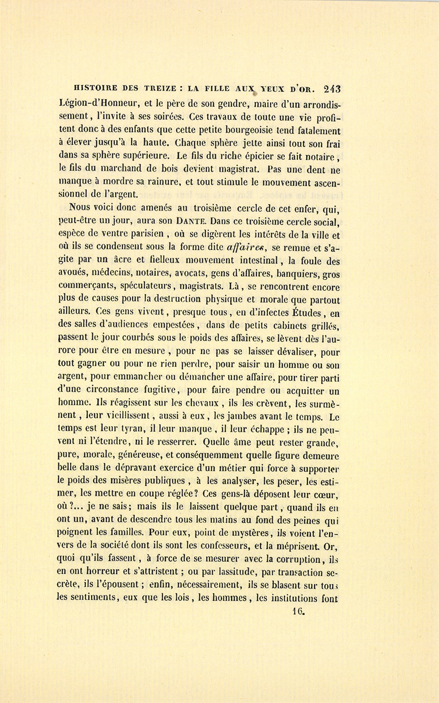 Nous voici donc amenés au troisième cercle de cet enfer, qui, peut-être un jour, aura son Dante. Dans ce troisième cercle social, espèce de ventre parisien, où se digèrent les intérêts de la ville et où ils se condensent sous la forme dite affaires, se remue et s’agite par un âcre et fielleux mouvement intestinal, la foule des avoués, médecins, notaires, avocats, gens d’affaires, banquiers, gros commerçants, spéculateurs, magistrats. Là, se rencontrent encore plus de causes pour la destruction physique et morale que partout ailleurs. Ces gens vivent, presque tous, en d’infectes Études, en des salles d’audiences empestées, dans de petits cabinets grillés, passent le jour courbés sous le poids des affaires, se lèvent dès l’aurore pour être en mesure, pour ne pas se laisser dévaliser, pour tout gagner ou pour ne rien perdre, pour saisir un homme ou son argent, pour emmancher ou démancher une affaire, pour tirer parti d’une circonstance fugitive, pour faire pendre ou acquitter un homme. Ils réagissent sur les chevaux, ils les crèvent, les surmènent, leur vieillissent, aussi à eux, les jambes avant le temps. Le temps est leur tyran, il leur manque, il leur échappe ; ils ne peuvent ni l’étendre, ni le resserrer. Quelle âme peut rester grande, pure, morale, généreuse, et conséquemment quelle figure demeure belle dans le dépravant exercice d’un métier qui force à supporter le poids des misères publiques, à les analyser, les peser, les estimer, les mettre en coupe réglée ? Ces gens-là déposent leur cœur, où ?… je ne sais ; mais ils le laissent quelque part, quand ils en ont un, avant de descendre tous les matins au fond des peines qui poignent les familles. Pour eux, point de mystères, ils voient l’envers de la société dont ils sont les confesseurs, et la méprisent. Or, quoi qu’ils fassent, à force de se mesurer avec la corruption, ils en ont horreur et s’attristent ; ou par lassitude, par transaction secrète, ils l’épousent ; enfin, nécessairement, ils se blasent sur tous les sentiments, eux que les lois, les hommes, les institutions font {p. 244} voler comme des choucas sur les cadavres encore chauds. À toute heure, l’homme d’argent pèse les vivants, l’homme des contrats pèse les morts, l’homme de loi pèse la conscience. Obligés de parler sans cesse, tous remplacent l’idée par la parole, le sentiment par la phrase, et leur âme devient un larynx. Ils s’usent et se démoralisent. Ni le grand négociant, ni le juge, ni l’avocat ne conservent leur sens droit : ils ne sentent plus, ils appliquent les régles que faussent les espèces. Emportés par leur existence torrentueuse, ils ne sont ni époux, ni pères, ni amants ; ils glissent à la ramasse sur les choses de la vie, et vivent à toute heure, poussés par les affaires de la grande cité. Quand ils rentrent chez eux, ils sont requis d’aller au bal, à l’Opéra, dans les fêtes où ils vont se faire des clients, des connaissances, des protecteurs. Tous mangent démesurément, jouent, veillent, et leurs figures s’arrondissent, s’aplatissent, se rougissent. À de si terribles dépenses de forces intellectuelles, à des contractions morales si multipliées, ils opposent non pas le plaisir, il est trop pâle et ne produit aucun contraste, mais la débauche, débauche secrète, effrayante, car ils peuvent disposer de tout, et font la morale de la société. Leur stupidité réelle se cache sous une science spéciale. Ils savent leur métier, mais ils ignorent tout ce qui n’en est pas. Alors, pour sauver leur amour-propre, ils mettent tout en question, critiquent à tort et à travers ; paraissent douteurs et sont gobe-mouches en réalité, noient leur esprit dans leurs interminables discussions. Presque tous adoptent commodément les préjugés sociaux, littéraires ou politiques pour se dispenser d’avoir une opinion ; de même qu’ils mettent leurs consciences à l’abri du code, ou du tribunal de commerce. Partis de bonne heure pour être des hommes remarquables, ils deviennent médiocres, et rampent sur les sommités du monde. Aussi leurs figures offrent-elles cette pâleur aigre, ces colorations fausses, ces yeux ternis, cernés, ces bouches bavardes et sensuelles où l’observateur reconnaît les symptômes de l’abâtardissement de la pensée et sa rotation dans le cirque d’une spécialité qui tue les facultés génératives du cerveau, le don de voir en grand, de généraliser et de déduire. Ils se ratatinent presque tous dans la fournaise des affaires. Aussi jamais un homme qui s’est laissé prendre dans les conquassations ou dans l’engrenage de ces immenses machines ne peut-il devenir grand. S’il est médecin, ou il a peu fait la médecine, ou il est une exception, un Bichat qui meurt jeune. {p. 245} Si, grand négociant, il reste quelque chose, il est presque Jacques Cœur. Robespierre exerça-t-il ? Danton était un paresseux qui attendait. Mais qui d’ailleurs a jamais envié les figures de Danton et de Robespierre, quelque superbes qu’elles puissent être ? Ces affairés par excellence attirent à eux l’argent et l’entassent pour s’allier aux familles aristocratiques. Si l’ambition de l’ouvrier est celle du petit bourgeois, ici, mêmes passions encore. À Paris, la vanité résume toutes les passions. Le type de cette classe serait soit le bourgeois ambitieux, qui, après une vie d’angoisses et de manœuvres continuelles, passe au Conseil-d’État comme une fourmi passe par une fente ; soit quelque rédacteur de journal, roué d’intrigues, que le roi fait Pair de France, peut-être pour se venger de la noblesse ; soit quelque notaire devenu Maire de son arrondissement, tous gens laminés par les affaires et qui, s’ils arrivent à leur but, y arrivent tués. En France, l’usage est d’introniser la perruque. Napoléon, Louis XIV, les grands rois seuls ont toujours voulu des jeunes gens pour 
