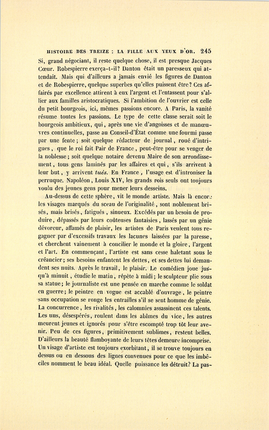 Telle était l’histoire du jeune homme qui, vers le milieu du mois d’avril, en 1815, parcourait nonchalamment la grande allée des Tuileries, à la manière de tous les animaux qui, connaissant leurs forces, marchent dans leur paix et leur majesté ; les bourgeoises se retournaient tout naïvement pour le revoir, les femmes ne se {p. 254} retournaient point, elles l’attendaient au retour, et gravaient dans leur mémoire, pour s’en souvenir à propos, cette suave figure qui n’eût pas déparé le corps de la plus belle d’entre elles.