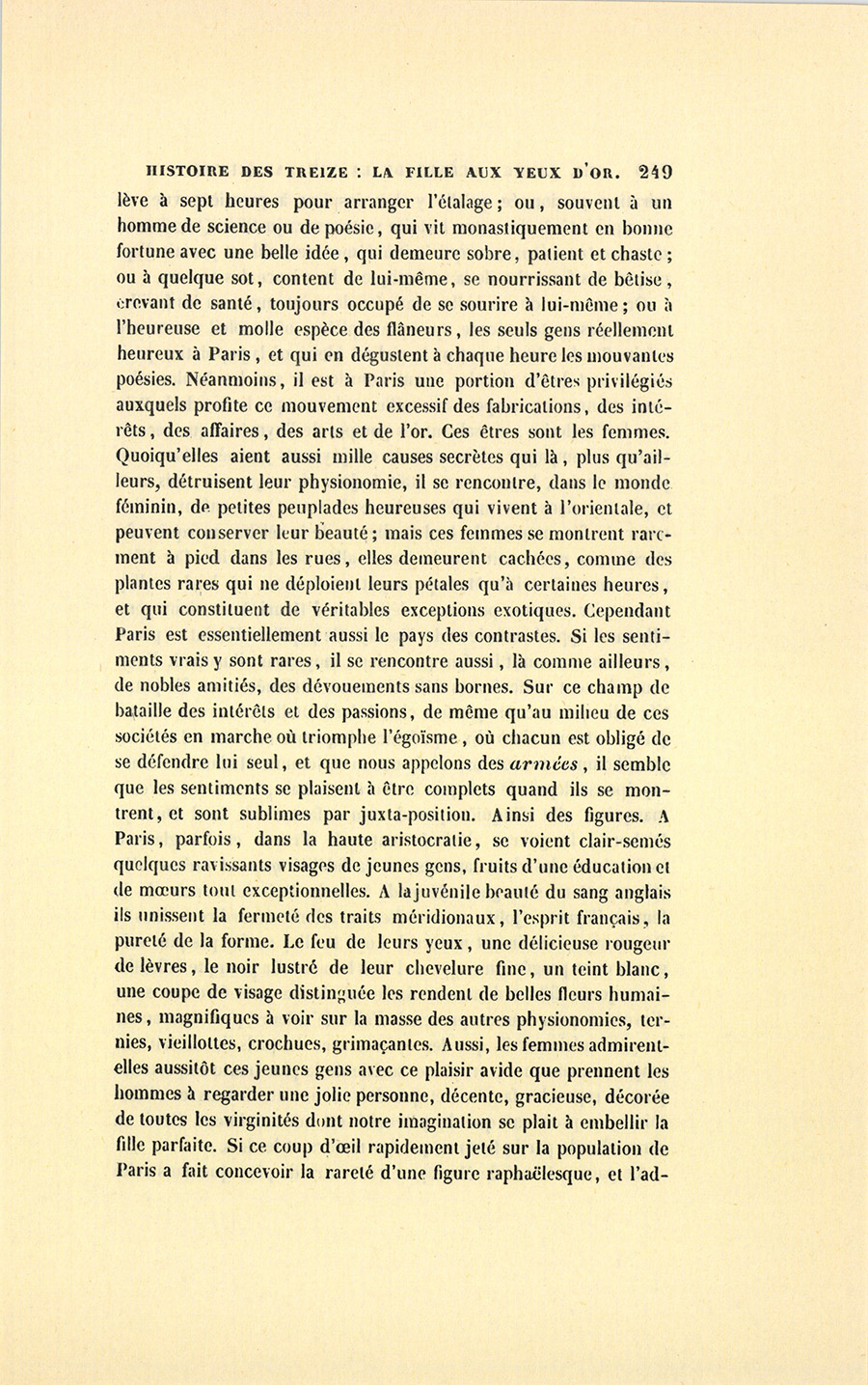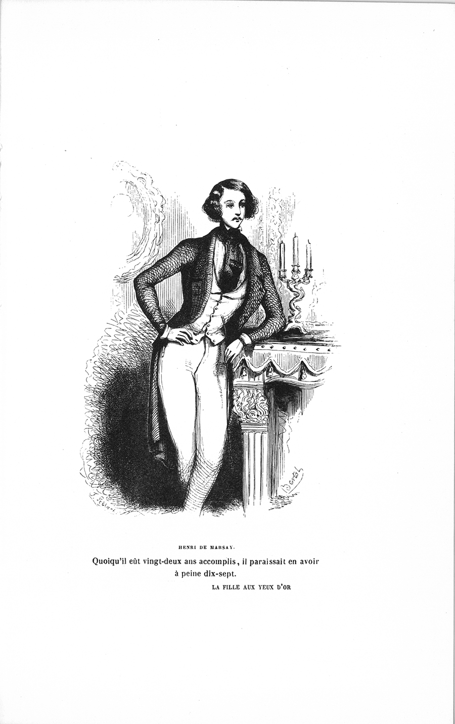 Vers la fin de 1814, Henri de Marsay n’avait donc sur terre aucun sentiment obligatoire et se trouvait libre autant que l’oiseau sans compagne. Quoiqu’il eût vingt-deux ans accomplis, il paraissait en avoir à peine dix-sept. [ill.] Généralement, les plus difficiles de ses rivaux le regardaient comme le plus joli garçon de Paris. De son père, lord Dudley, il avait pris les yeux bleus les plus amoureusement décevants ; de sa mère, les cheveux noirs les plus touffus ; de tous deux, un sang pur, une peau de jeune fille, un air doux et modeste, une taille fine et aristocratique, de fort belles mains. Pour une femme, le voir, c’était en être folle ; vous savez ? concevoir un de ces désirs qui mordent le cœur, mais qui s’oublient par impossibilité de le satisfaire, parce que la femme est vulgairement à Paris sans ténacité. Peu d’entre elles se disent à la manière des {p. 253} hommes, le : je maintiendrai de la maison d’Orange. Sous cette fraîcheur de vie, et malgré l’eau limpide de ses yeux, Henri avait un courage de lion, une adresse de singe. Il coupait une balle à dix pas dans la lame d’un couteau ; montait à cheval de manière à réaliser la fable du centaure ; conduisait avec grâce une voiture à grandes guides ; était leste comme Chérubin et tranquille comme un mouton ; mais il savait battre un homme du faubourg au terrible jeu de la savate ou du bâton ; puis, il touchait du piano de manière à pouvoir se faire artiste s’il tombait dans le malheur, et possédait une voix qui lui aurait valu de Barbaja, cinquante mille francs par saison. Hélas toutes ces belles qualités, ces jolis défauts étaient ternis par un épouvantable vice : il ne croyait ni aux hommes ni aux femmes, ni à Dieu ni au diable. La capricieuse nature avait commencé à le douer ; un prêtre l’avait achevé.