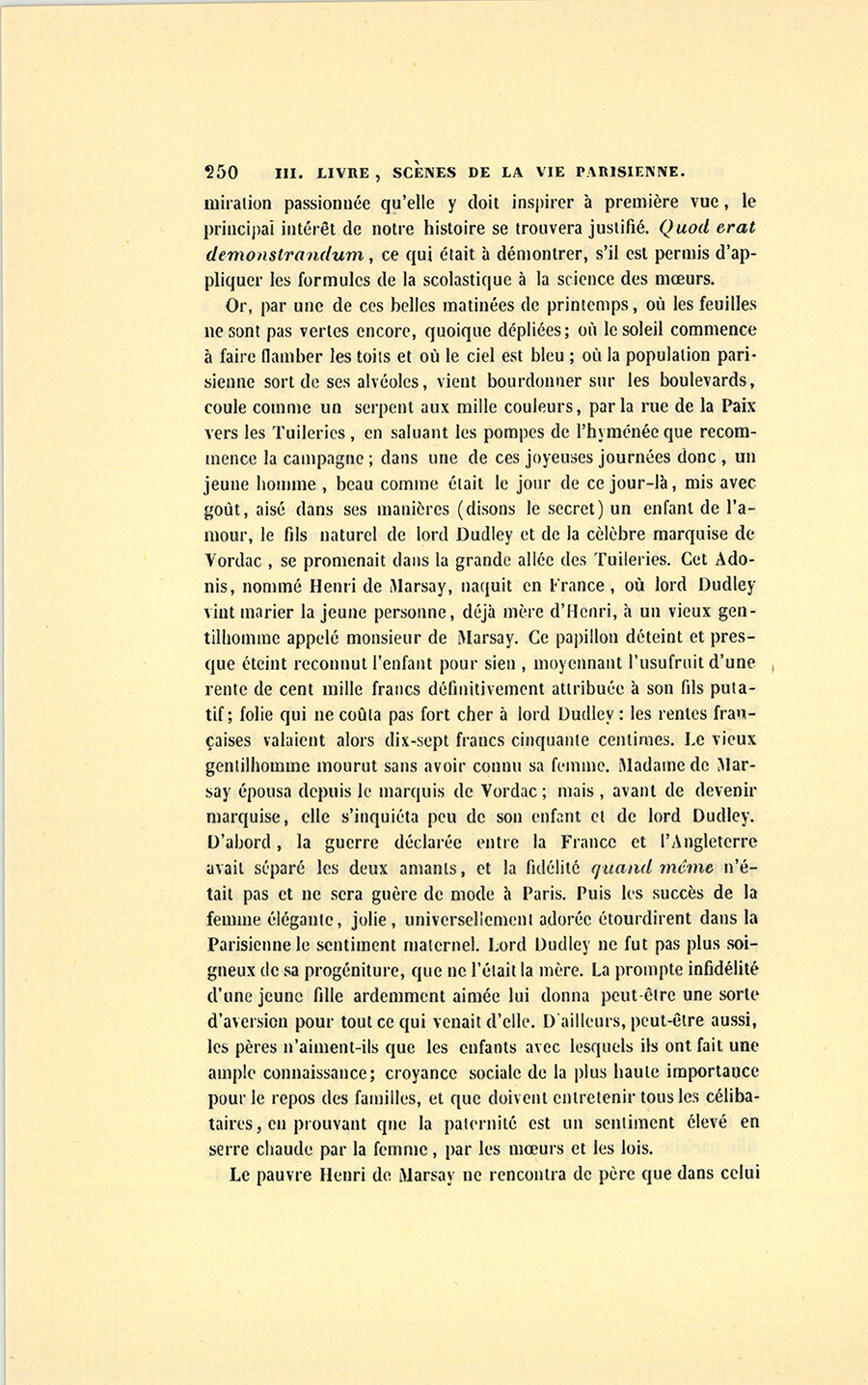 Or, par une de ces belles matinées de printemps, où les feuilles ne sont pas vertes encore, quoique dépliées ; où le soleil commence à faire flamber les toits et où le ciel est bleu ; où la population parisienne sort de ses alvéoles, vient bourdonner sur les boulevards, coule comme un serpent aux mille couleurs, par la rue de la Paix vers les Tuileries, en saluant les pompes de l’hyménée que recommence la campagne ; dans une de ces joyeuses journées donc, un jeune homme, beau comme était le jour de ce jour-là, mis avec goût, aisé dans ses manières (disons le secret) un enfant de l’amour, le fils naturel de lord Dudley et de la célèbre marquise de Vordac, se promenait dans la grande allée des Tuileries. Cet Adonis, nommé Henri de Marsay, naquit en France, où lord Dudley vint marier la jeune personne, déjà mère d’Henri, à un vieux gentilhomme appelé monsieur de Marsay. Ce papillon déteint et presque éteint reconnut l’enfant pour sien, moyennant l’usufruit d’une rente de cent mille francs définitivement attribuée à son fils putatif ; folie qui ne coûta pas fort cher à lord Dudley : les rentes françaises valaient alors dix-sept francs cinquante centimes. Le vieux gentilhomme mourut sans avoir connu sa femme. Madame de Marsay épousa depuis le marquis de Vordac ; mais, avant de devenir marquise, elle s’inquiéta peu de son enfant et de lord Dudley. D’abord, la guerre déclarée entre la France et l’Angleterre avait séparé les deux amants, et la fidélité quand même n’était pas et ne sera guère de mode à Paris. Puis les succès de la femme élégante, jolie, universellement adorée étourdirent dans la Parisienne le sentiment maternel. Lord Dudley ne fut pas plus soigneux de sa progéniture, que ne l’était la mère. La prompte infidélité d’une jeune fille ardemment aimée lui donna peut-être une sorte d’aversion pour tout ce qui venait d’elle. D’ailleurs, peut-être aussi, les pères n’aiment-ils que les enfants avec lesquels ils ont fait une ample connaissance ; croyance sociale de la plus haute importance pour le repos des familles, et que doivent entretenir tous les célibataires, en prouvant que la paternité est un sentiment élevé en serre chaude par la femme, par les mœurs et les lois.