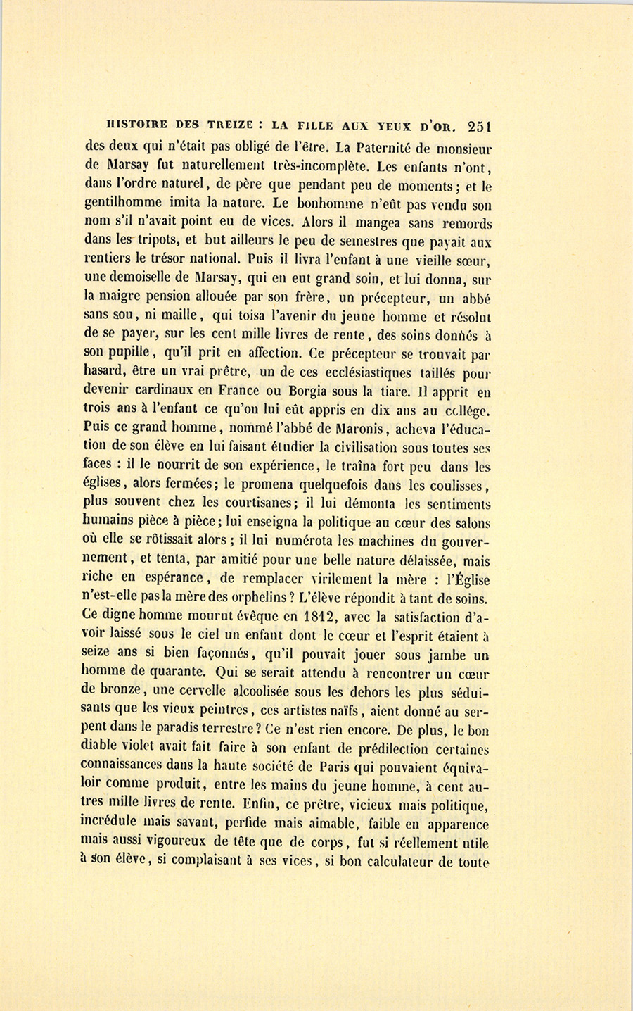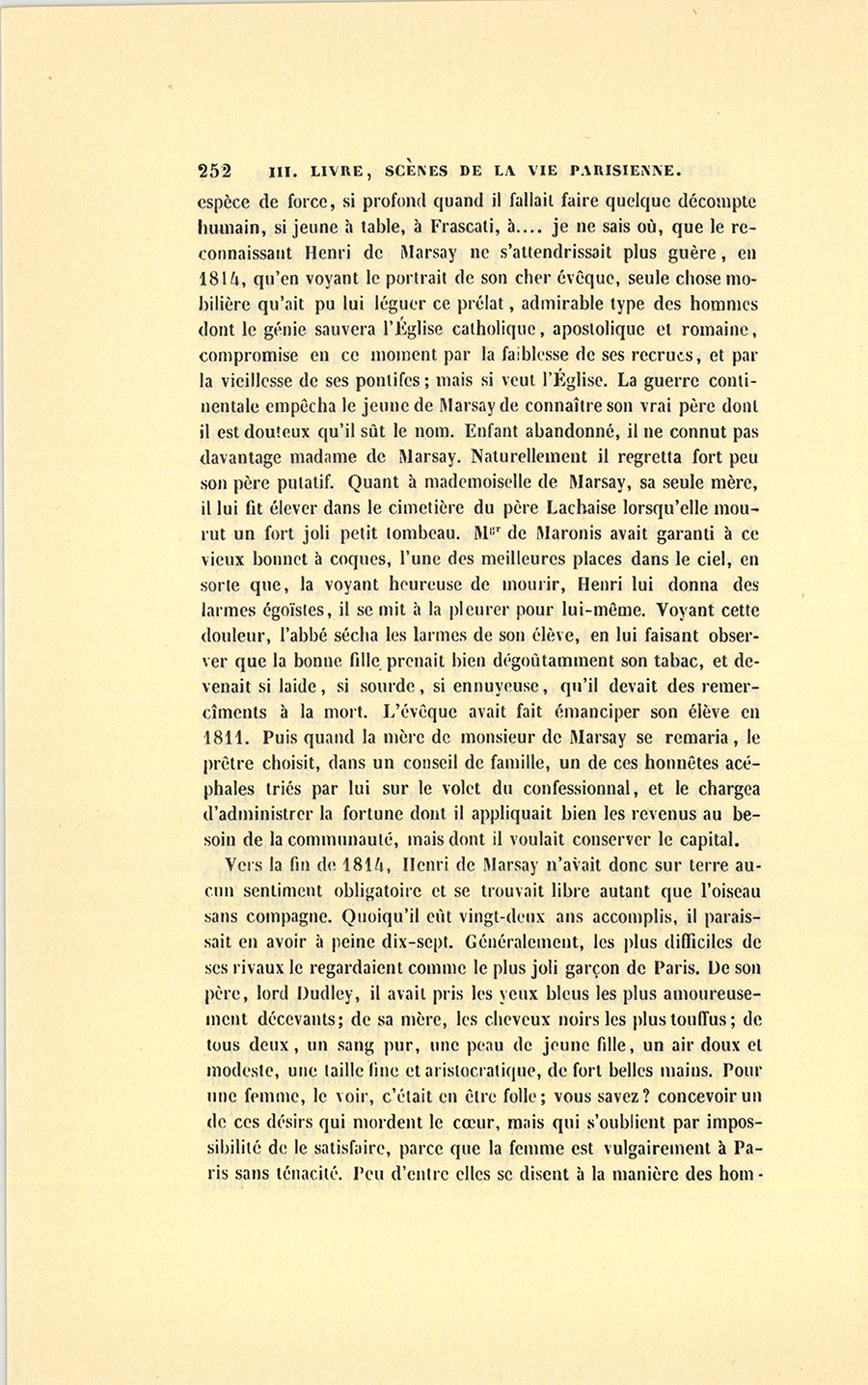 Le pauvre Henri de Marsay ne rencontra de père que dans celui {p. 251} des deux qui n’était pas obligé de l’être. La Paternité de monsieur de Marsay fut naturellement très-incomplète. Les enfants n’ont, dans l’ordre naturel, de père que pendant peu de moments ; et le gentilhomme imita la nature. Le bonhomme n’eût pas vendu son nom s’il n’avait point eu de vices. Alors il mangea sans remords dans les tripots, et but ailleurs le peu de semestres que payait aux rentiers le trésor national. Puis il livra l’enfant à une vieille sœur, une demoiselle de Marsay, qui en eut grand soin, et lui donna, sur la maigre pension allouée par son frère, un précepteur, un abbé sans sou, ni maille, qui toisa l’avenir du jeune homme et résolut de se payer, sur les cent mille livres de rente, des soins donnés à son pupille, qu’il prit en affection. Ce précepteur se trouvait par hasard, être un vrai prêtre, un de ces ecclésiastiques taillés pour devenir cardinaux en France ou Borgia sous la tiare. Il apprit en trois ans à l’enfant ce qu’on lui eût appris en dix ans au collége. Puis ce grand homme, nommé l’abbé de Maronis, acheva l’éducation de son élève en lui faisant étudier la civilisation sous toutes ses faces : il le nourrit de son expérience, le traîna fort peu dans les églises, alors fermées ; le promena quelquefois dans les coulisses, plus souvent chez les courtisanes ; il lui démonta les sentiments humains pièce à pièce ; lui enseigna la politique au cœur des salons où elle se rôtissait alors ; il lui numérota les machines du gouvernement, et tenta, par amitié pour une belle nature délaissée, mais riche en espérance, de remplacer virilement la mère : l’Église n’est-elle pas la mère des orphelins ? L’élève répondit à tant de soins. Ce digne homme mourut évêque en 1812, avec la satisfaction d’avoir laissé sous le ciel un enfant dont le cœur et l’esprit étaient à seize ans si bien façonnés, qu’il pouvait jouer sous jambe un homme de quarante. Qui se serait attendu à rencontrer un cœur de bronze, une cervelle alcoolisée sous les dehors les plus séduisants que les vieux peintres, ces artistes naïfs, aient donné au serpent dans le paradis terrestre ? Ce n’est rien encore. De plus, le bon diable violet avait fait faire à son enfant de prédilection certaines connaissances dans la haute société de Paris qui pouvaient équivaloir comme produit, entre les mains du jeune homme, à cent autres mille livres de rente. Enfin, ce prêtre, vicieux mais politique, incrédule mais savant, perfide mais aimable, faible en apparence mais aussi vigoureux de tête que de corps, fut si réellement utile à son élève, si complaisant à ses vices, si bon calculateur de toute {p. 252} espèce de force, si profond quand il fallait faire quelque décompte humain, si jeune à table, à Frascati, à… je ne sais où, que le reconnaissant Henri de Marsay ne s’attendrissait plus guère, en 1814, qu’en voyant le portrait de son cher évêque, seule chose mobilière qu’ait pu lui léguer ce prélat, admirable type des hommes dont le génie sauvera l’Église catholique, apostolique et romaine, compromise en ce moment par la faiblesse de ses recrues, et par la vieillesse de ses pontifes ; mais si veut l’Église. La guerre continentale empêcha le jeune de Marsay de connaître son vrai père dont il est douteux qu’il sût le nom. Enfant abandonné, il ne connut pas davantage madame de Marsay. Naturellement il regretta fort peu son père putatif. Quant à mademoiselle de Marsay, sa seule mère, il lui fit élever dans le cimetière du père Lachaise lorsqu’elle mourut un fort joli petit tombeau. Mgr de Maronis avait garanti à ce vieux bonnet à coques, l’une des meilleures places dans le ciel, en sorte que, la voyant heureuse de mourir, Henri lui donna des larmes égoïstes, il se mit à la pleurer pour lui-même. Voyant cette douleur, l’abbé sécha les larmes de son élève, en lui faisant observer que la bonne fille prenait bien dégoûtamment son tabac, et devenait si laide, si sourde, si ennuyeuse, qu’il devait des remercîments à la mort. L’évêque avait fait émanciper son élève en 1811. Puis quand la mère de monsieur de Marsay se remaria, le prêtre choisit, dans un conseil de famille, un de ces honnêtes acéphales triés par lui sur le volet du confessionnal, et le chargea d’administrer la fortune dont il appliquait bien les revenus au besoin de la communauté, mais dont il voulait conserver le capital.
