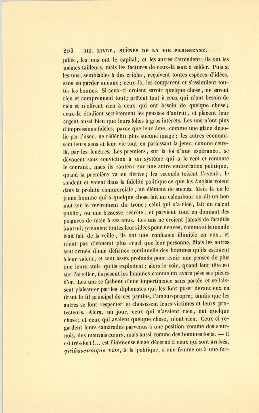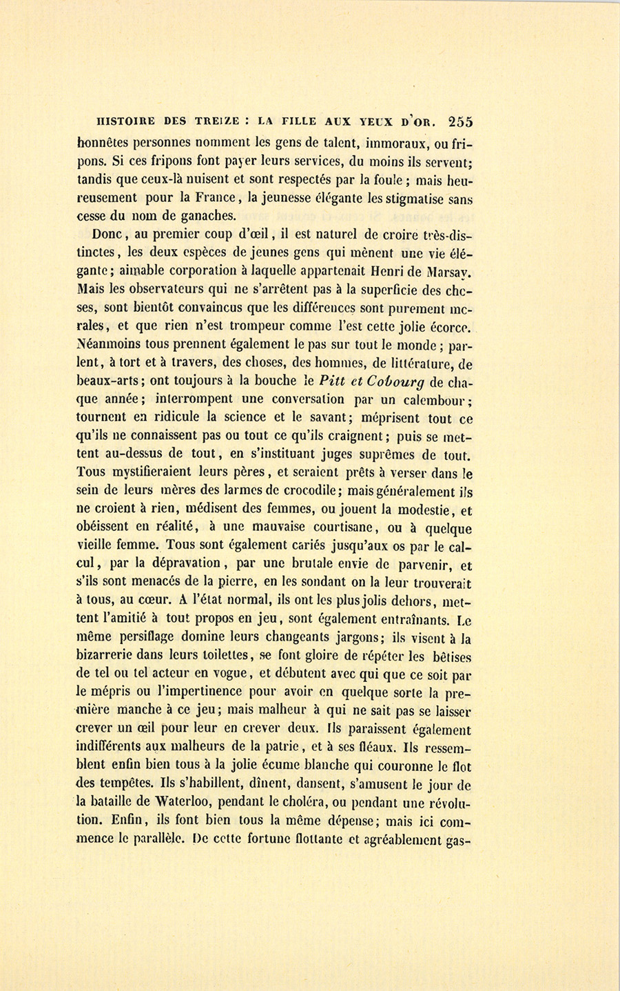 En effet, les jeunes gens de Paris ne ressemblent aux jeunes gens d’aucune autre ville. Ils se divisent en deux classes : le jeune homme qui a quelque chose et le jeune homme qui n’a rien ; ou, le jeune homme qui pense et celui qui dépense. Mais entendez-le bien, il ne s’agit ici que de ces indigènes qui mènent à Paris le train délicieux d’une vie élégante. Il y existe bien quelques autres jeunes gens, mais ceux-là sont des enfants qui conçoivent très-tard l’existence parisienne et en restent les dupes. Ils ne spéculent pas, ils étudient, ils piochent, disent les autres. Enfin il s’y voit encore certains jeunes gens, riches ou pauvres, qui embrassent des carrières et les suivent tout uniment ; ils sont un peu l’Émile de Rousseau, de la chair à citoyen, et n’apparaissent jamais dans le monde. Les diplomates les nomment impoliment des niais. Niais ou non, ils augmentent le nombre de ces gens médiocres sous le poids desquels plie la France. Ils sont toujours là ; toujours prêts à gâcher les affaires publiques ou particulières, avec la plate truelle de la médiocrité, en se targuant de leur impuissance qu’ils nomment mœurs et probité. Ces espèces de Prix d’excellence sociaux infestent l’administration, l’armée, la magistrature, les chambres, la cour. Ils amoindrissent, aplatissent le pays et constituent en quelque sorte dans le corps politique, une lymphe qui le surcharge et le rend mollasse. Ces {p. 255} honnêtes personnes nomment les gens de talent, immoraux, ou fripons. Si ces fripons font payer leurs services, du moins ils servent ; tandis que ceux-là nuisent et sont respectés par la foule ; mais heureusement pour la France, la jeunesse élégante les stigmatise sans cesse du nom de ganaches.