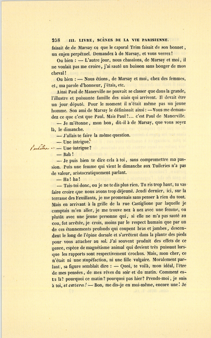Le jeune homme qui s’intitulait ami de Henri de Marsay était un étourdi, arrivé de province et auquel les jeunes gens, alors à la mode, apprenaient l’art d’écorner proprement une succession, mais il avait un dernier gâteau à manger dans sa province, un établissement certain. C’était tout simplement un héritier passé sans transition de ses maigres cent francs par mois, à toute la fortune paternelle, et qui, s’il n’avait pas assez d’esprit pour s’apercevoir que l’on se moquait de lui, savait assez de calcul pour s’arrêter aux deux tiers de son capital. Il venait découvrir à Paris, moyennant quelques billets de mille francs, la valeur exacte des harnais, l’art de ne pas trop respecter ses gants, y entendre de savantes méditations sur les gages à donner aux gens, et chercher quel forfait était le plus avantageux à conclure avec eux ; il tenait beaucoup à pouvoir parler en bons termes de ses chevaux, de son chien des Pyrénées, à reconnaître d’après la mise, le marcher, le brodequin, à quelle espèce appartenait une femme ; étudier l’écarté, retenir quelques mots à la mode, et conquérir, par son séjour dans le monde parisien, l’autorité nécessaire pour importer plus tard en province le goût du thé, l’argenterie à forme anglaise, et se donner le droit de tout mépriser autour de lui pendant le reste de ses jours. De Marsay l’avait pris en amitié pour s’en servir dans le monde, comme un hardi spéculateur se sert d’un commis de confiance. L’amitié fausse ou vraie de de Marsay était une position sociale pour Paul de Manerville qui, de son côté, se croyait fort en exploitant à sa manière son ami intime. Il vivait dans le reflet de son ami, se mettait constamment sous son parapluie, en chaussait les bottes, se dorait de ses rayons. En se posant près de Henri, ou même en marchant à ses côtés, il avait l’air de dire : – Ne nous insultez pas, nous sommes de vrais tigres. Souvent il se permettait de dire avec fatuité : – Si je demandais telle ou telle chose à Henri, il est assez mon ami pour le faire… Mais il avait soin de ne lui jamais rien demander. Il le craignait, et sa crainte, quoique imperceptible, réagissait sur les autres, et servait de Marsay. – C’est un fier homme que de Marsay, disait Paul. Ha, ha, vous verrez, il sera ce qu’il voudra être. Je ne m’étonnerais pas de le trouver un jour ministre des affaires étrangères. Rien ne lui résiste. Puis il {p. 258} faisait de de Marsay ce que le caporal Trim faisait de son bonnet, un enjeu perpétuel. Demandez à de Marsay, et vous verrez !