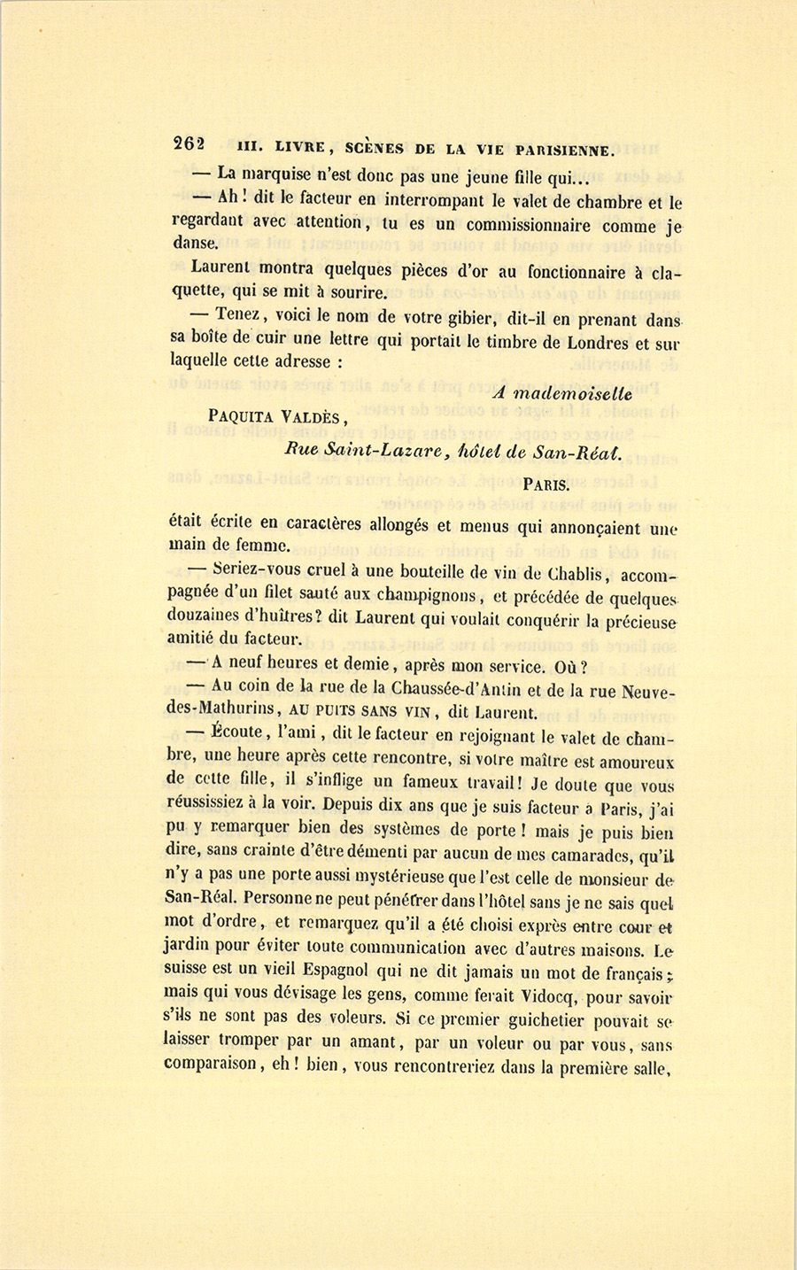 – Le portier de monsieur le baron de Nucingen, dont le jardin touche par en haut à celui de l’hôtel San-Réal, me l’a dit effectivement, reprit le facteur.