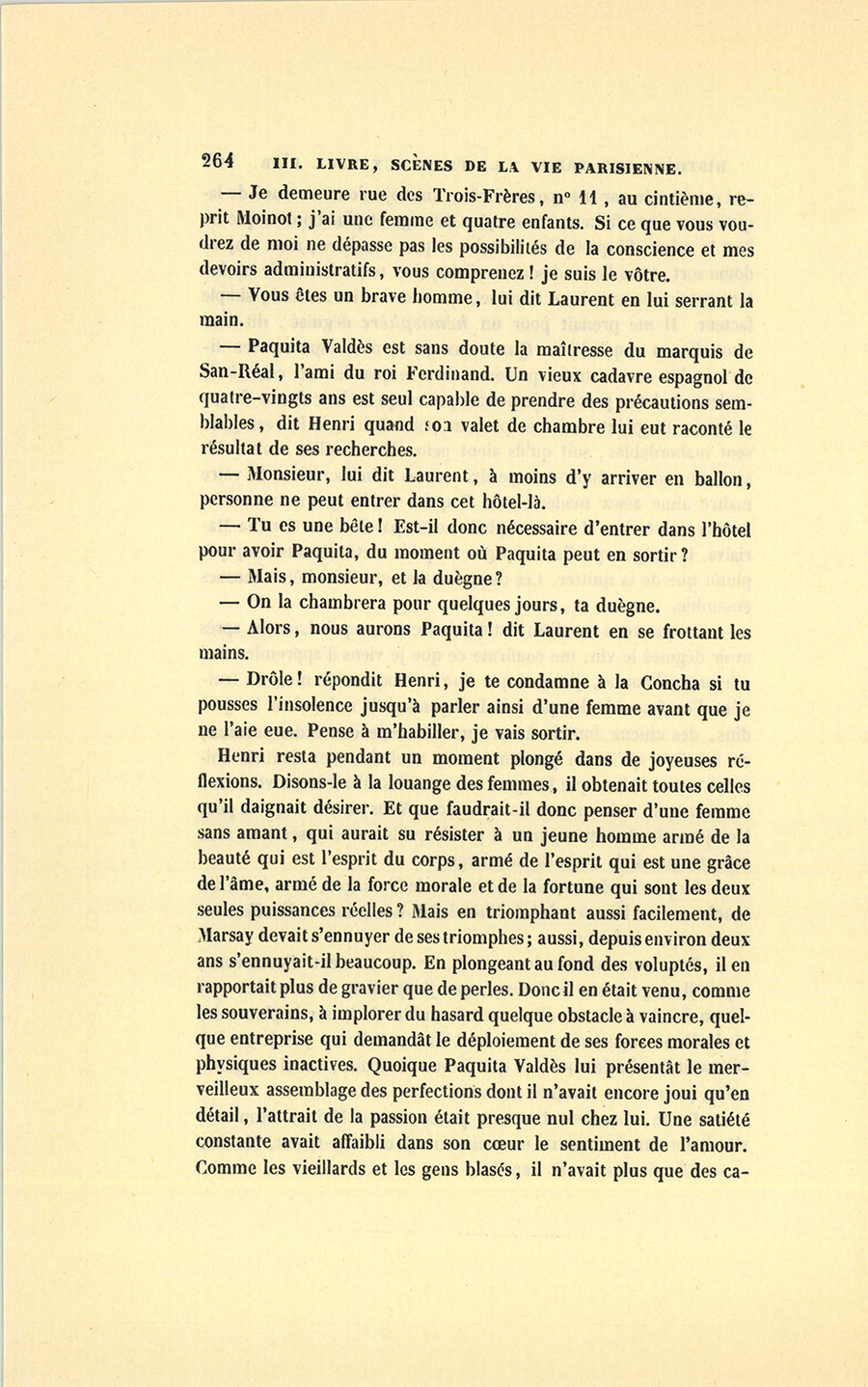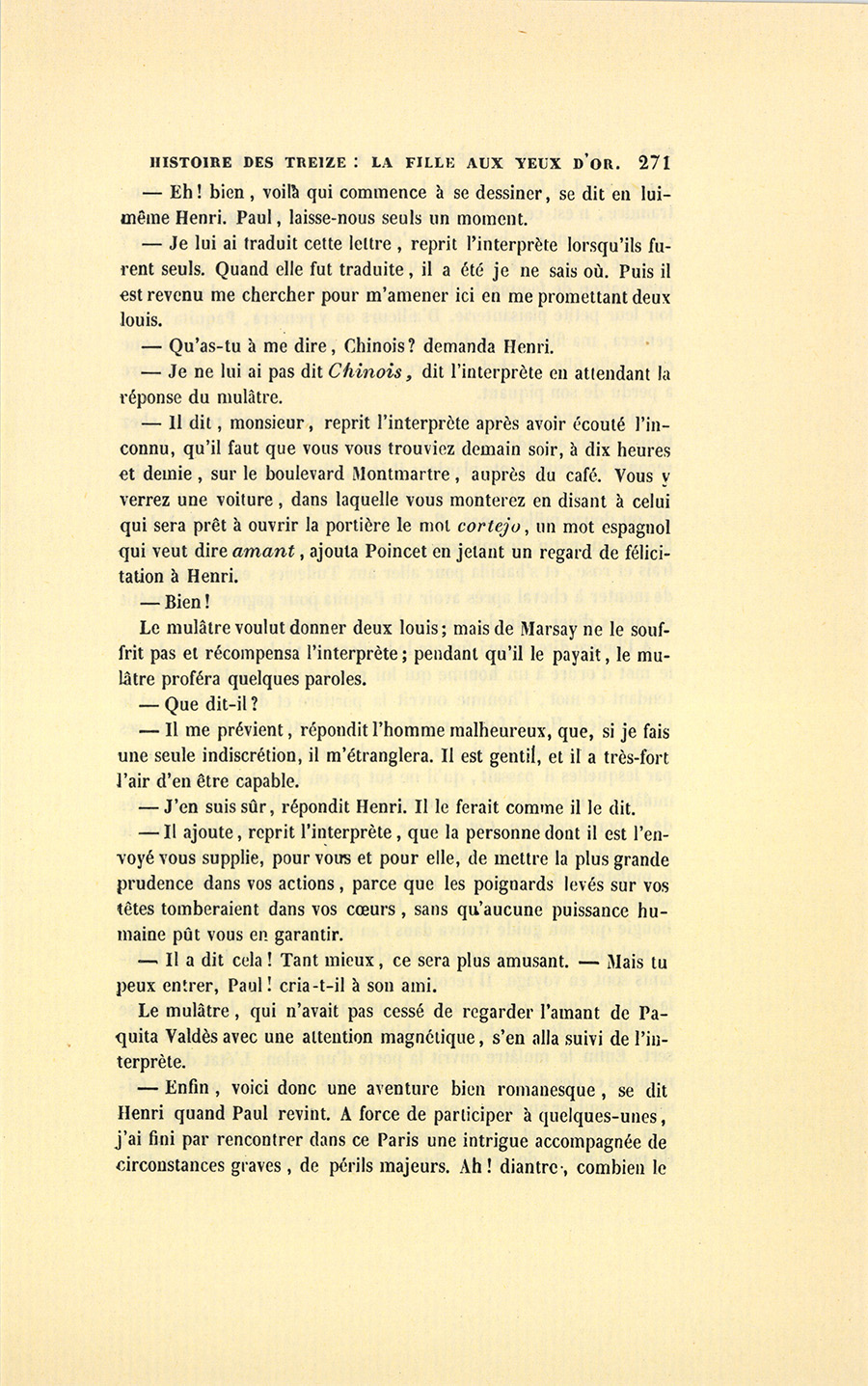 – Paquita Valdès est sans doute la maîtresse du marquis de San-Réal, l’ami du roi Ferdinand. Un vieux cadavre espagnol de quatre-vingts ans est seul capable de prendre des précautions semblables, dit Henri quand son valet de chambre lui eut raconté le résultat de ses recherches.