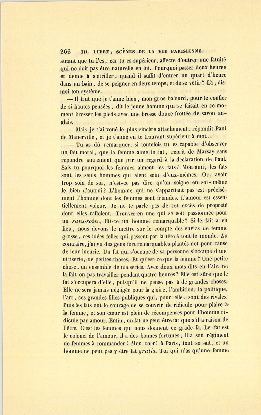 – Tu as dû remarquer, si toutefois tu es capable d’observer un fait moral, que la femme aime le fat, reprit de Marsay sans répondre autrement que par un regard à la déclaration de Paul. Sais-tu pourquoi les femmes aiment les fats ? Mon ami, les fats sont les seuls hommes qui aient soin d’eux-mêmes. Or, avoir trop soin de soi, n’est-ce pas dire qu’on soigne en soi-même le bien d’autrui ? L’homme qui ne s’appartient pas est précisément l’homme dont les femmes sont friandes. L’amour est essentiellement voleur. Je ne te parle pas de cet excès de propreté dont elles raffolent. Trouves-en une qui se soit passionnée pour un sans-soin, fût-ce un homme remarquable ? Si le fait a eu lieu, nous devons le mettre sur le compte des envies de femme grosse, ces idées folles qui passent par la tête à tout le monde. Au contraire, j’ai vu des gens fort remarquables plantés net pour cause de leur incurie. Un fat qui s’occupe de sa personne s’occupe d’une niaiserie, de petites choses. Et qu’est-ce que la femme ? Une petite chose, un ensemble de niaiseries. Avec deux mots dits en l’air, ne la fait-on pas travailler pendant quatre heures ? Elle est sûre que le fat s’occupera d’elle, puisqu’il ne pense pas à de grandes choses. Elle ne sera jamais négligée pour la gloire, l’ambition, la politique, l’art, ces grandes filles publiques qui, pour elle, sont des rivales. Puis les fats ont le courage de se couvrir de ridicule pour plaire à la femme, et son cœur est plein de récompenses pour l’homme ridicule par amour. Enfin, un fat ne peut être fat que s’il a quelque raison de l’être. C’est les femmes qui nous donnent ce grade-là. Le fat est le colonel de l’amour, il a des bonnes fortunes, il a son régiment de femmes à commander ! Mon cher ! à Paris, tout se sait, et un homme ne peut pas y être fat gratis. Toi qui n’as qu’une femme {p. 267} et qui peut-être as raison de n’en avoir qu’une, essaie de faire le fat ?… tu ne deviendras même pas ridicule, tu seras mort. Tu deviendrais un préjugé à deux pates, un de ces hommes condamnés inévitablement à faire une seule et même chose. Tu signifierais sottise comme monsieur de La Fayette signifie Amérique ; monsieur de Talleyrand, diplomatie ; Désaugiers, chanson ; monsieur de Ségur, romance. S’ils sortent de leur genre, on ne croit plus à la valeur de ce qu’ils font. Voilà comme nous sommes en France, toujours souverainement injustes ! Monsieur de Talleyrand est peut-être un grand financier, monsieur de La Fayette un tyran, et Désaugiers un administrateur. Tu aurais quarante femmes l’année suivante, on ne t’en accorderait pas publiquement une seule. Ainsi donc la fatuité, mon ami Paul, est le signe d’un incontestable pouvoir conquis sur le peuple femelle. Un homme aimé par plusieurs femmes passe pour avoir des qualités supérieures ; et alors c’est à qui l’aura, le malheureux ! Mais crois-tu que ce ne soit rien aussi que d’avoir le droit d’arriver dans un salon, d’y regarder tout le monde du haut de sa cravate, ou à travers un lorgnon, et de pouvoir mépriser l’homme le plus supérieur s’il porte un gilet arriéré ? Laurent, tu me fais mal ! Après déjeuner, Paul, nous irons aux Tuileries voir l’adorable Fille aux yeux d’or.