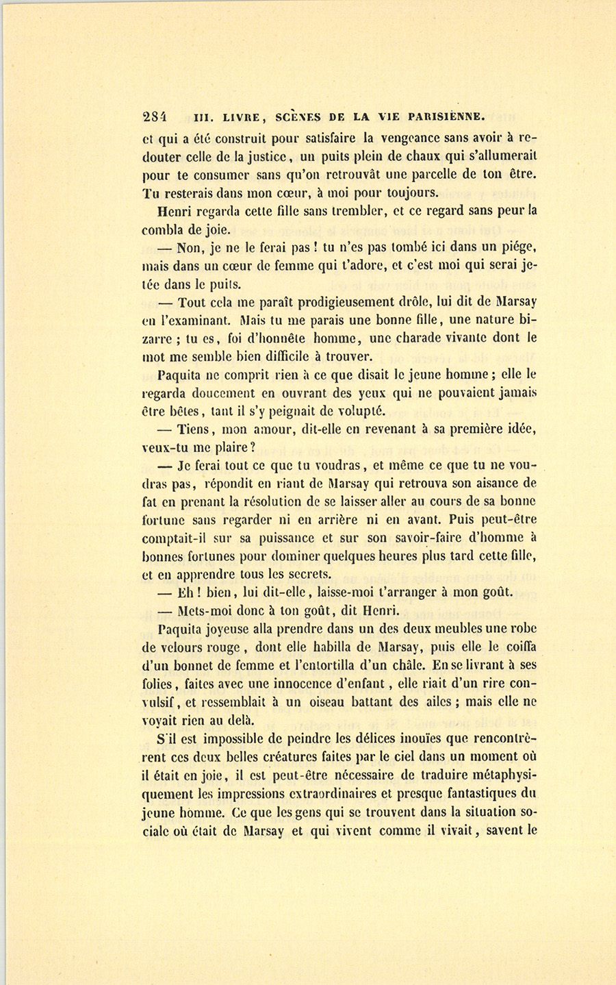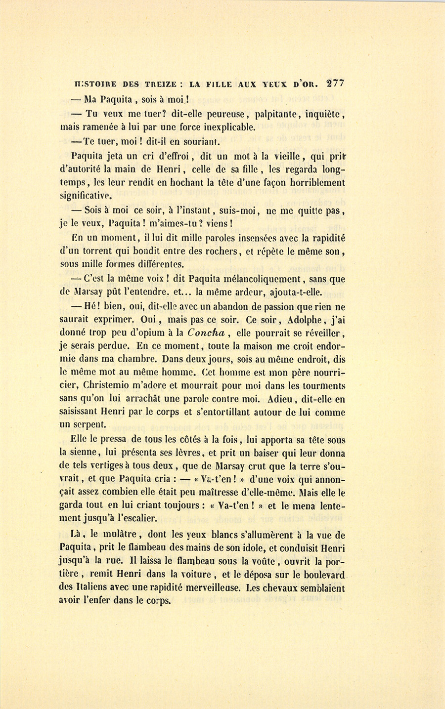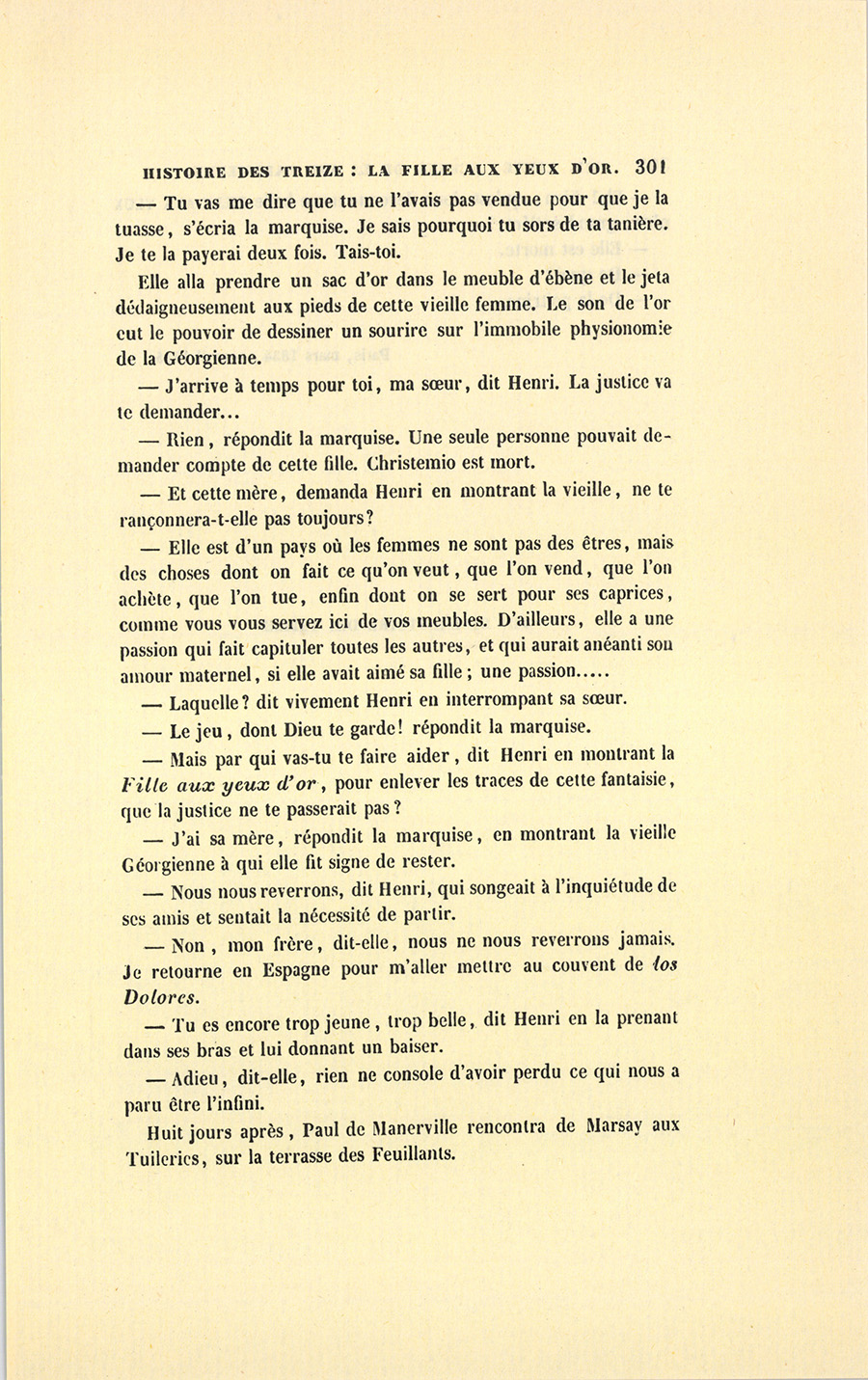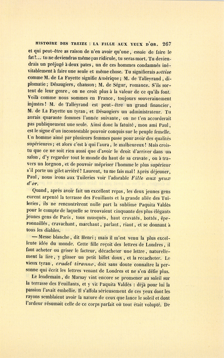 Le lendemain, de Marsay vint encore se promener au soleil sur la terrasse des Feuillants, et y vit Paquita Valdès : déjà pour lui la passion l’avait embellie. Il s’affola sérieusement de ces yeux dont les rayons semblaient avoir la nature de ceux que lance le soleil et dont l’ardeur résumait celle de ce corps parfait où tout était volupté. {p. 268} De Marsay brûlait de frôler la robe de cette séduisante fille quand ils se rencontraient dans leur promenade ; mais ses tentatives étaient toujours vaines. En un moment où il avait dépassé la duègne et Paquita, pour pouvoir se trouver du côté de la Fille aux yeux d’or quand il se retournerait, Paquita, non moins impatiente, s’avança vivement, et de Marsay se sentit presser la main par elle d’une façon tout à la fois si rapide et si passionnément significative, qu’il crut avoir reçu le choc d’une étincelle électrique. En un instant toutes ses émotions de jeunesse lui sourdirent au cœur. Quand les deux amants se regardèrent, Paquita parut honteuse ; elle baissa les yeux pour ne pas revoir les yeux d’Henri, mais son regard se coula par en dessous pour regarder les pieds et la taille de celui que les femmes nommaient avant la révolution leur vainqueur.