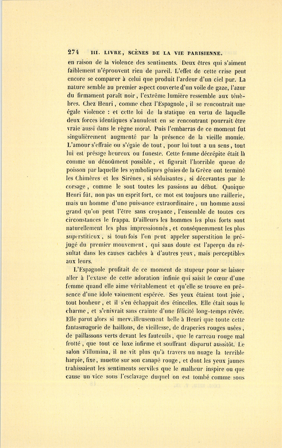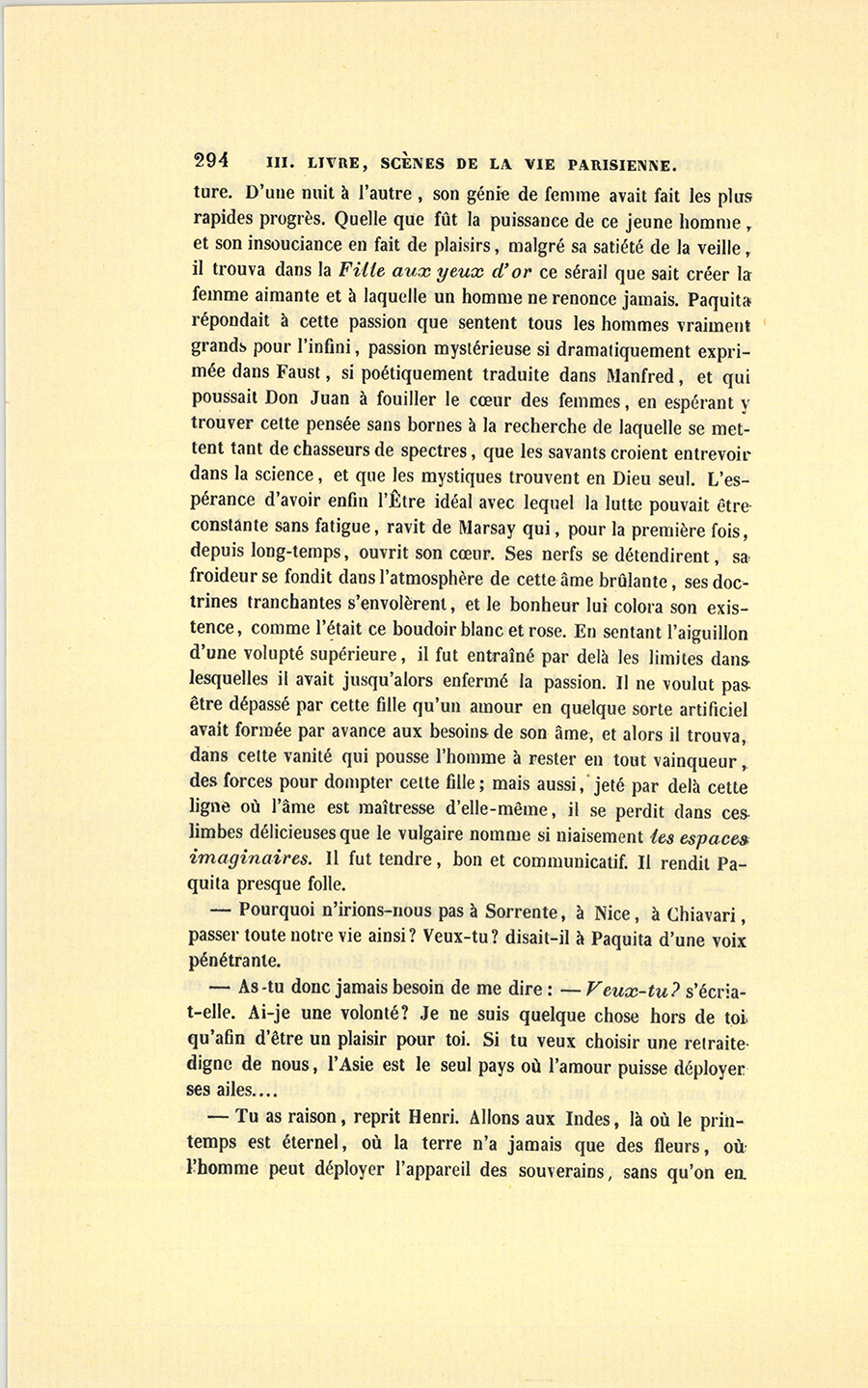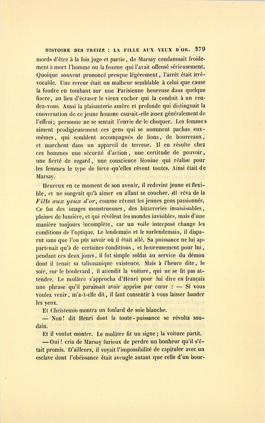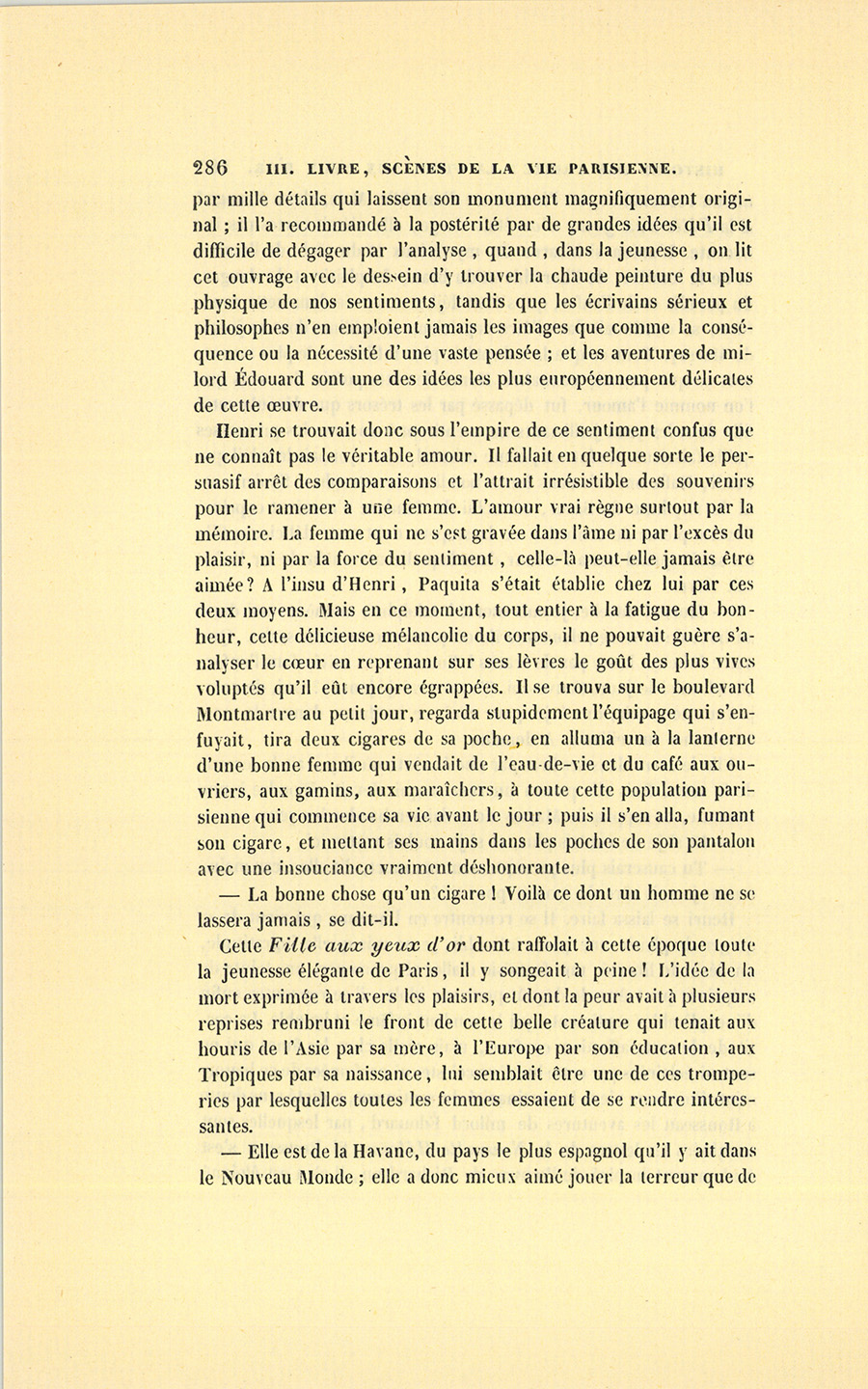 Le lendemain, de Marsay vint encore se promener au soleil sur la terrasse des Feuillants, et y vit Paquita Valdès : déjà pour lui la passion l’avait embellie. Il s’affola sérieusement de ces yeux dont les rayons semblaient avoir la nature de ceux que lance le soleil et dont l’ardeur résumait celle de ce corps parfait où tout était volupté. {p. 268} De Marsay brûlait de frôler la robe de cette séduisante fille quand ils se rencontraient dans leur promenade ; mais ses tentatives étaient toujours vaines. En un moment où il avait dépassé la duègne et Paquita, pour pouvoir se trouver du côté de la Fille aux yeux d’or quand il se retournerait, Paquita, non moins impatiente, s’avança vivement, et de Marsay se sentit presser la main par elle d’une façon tout à la fois si rapide et si passionnément significative, qu’il crut avoir reçu le choc d’une étincelle électrique. En un instant toutes ses émotions de jeunesse lui sourdirent au cœur. Quand les deux amants se regardèrent, Paquita parut honteuse ; elle baissa les yeux pour ne pas revoir les yeux d’Henri, mais son regard se coula par en dessous pour regarder les pieds et la taille de celui que les femmes nommaient avant la révolution leur vainqueur.