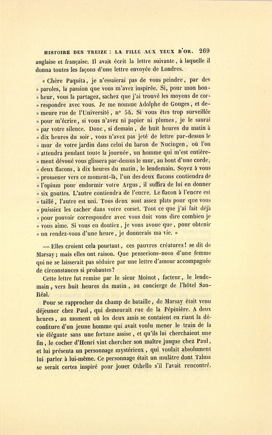 Chère Paquita, je n’essaierai pas de vous peindre, par des paroles, la passion que vous m’avez inspirée. Si, pour mon bonheur, vous la partagez, sachez que j’ai trouvé les moyens de correspondre avec vous. Je me nomme Adolphe de Gouges, et demeure rue de l’Université, nº 54. Si vous êtes trop surveillée pour m’écrire, si vous n’avez ni papier ni plumes, je le saurai par votre silence. Donc, si demain, de huit heures du matin à dix heures du soir, vous n’avez pas jeté de lettre par-dessus le mur de votre jardin dans celui du baron de Nucingen, où l’on attendra pendant toute la journée, un homme qui m’est entièrement dévoué vous glissera par-dessus le mur, au bout d’une corde, deux flacons, à dix heures du matin, le lendemain. Soyez à vous promener vers ce moment-là, l’un des deux flacons contiendra de l’opium pour endormir votre Argus, il suffira de lui en donner six gouttes. L’autre contiendra de l’encre. Le flacon à l’encre est taillé, l’autre est uni. Tous deux sont assez plats pour que vous puissiez les cacher dans votre corset. Tout ce que j’ai fait déjà pour pouvoir correspondre avec vous doit vous dire combien je vous aime. Si vous en doutiez, je vous avoue que, pour obtenir un rendez-vous d’une heure, je donnerais ma vie.
