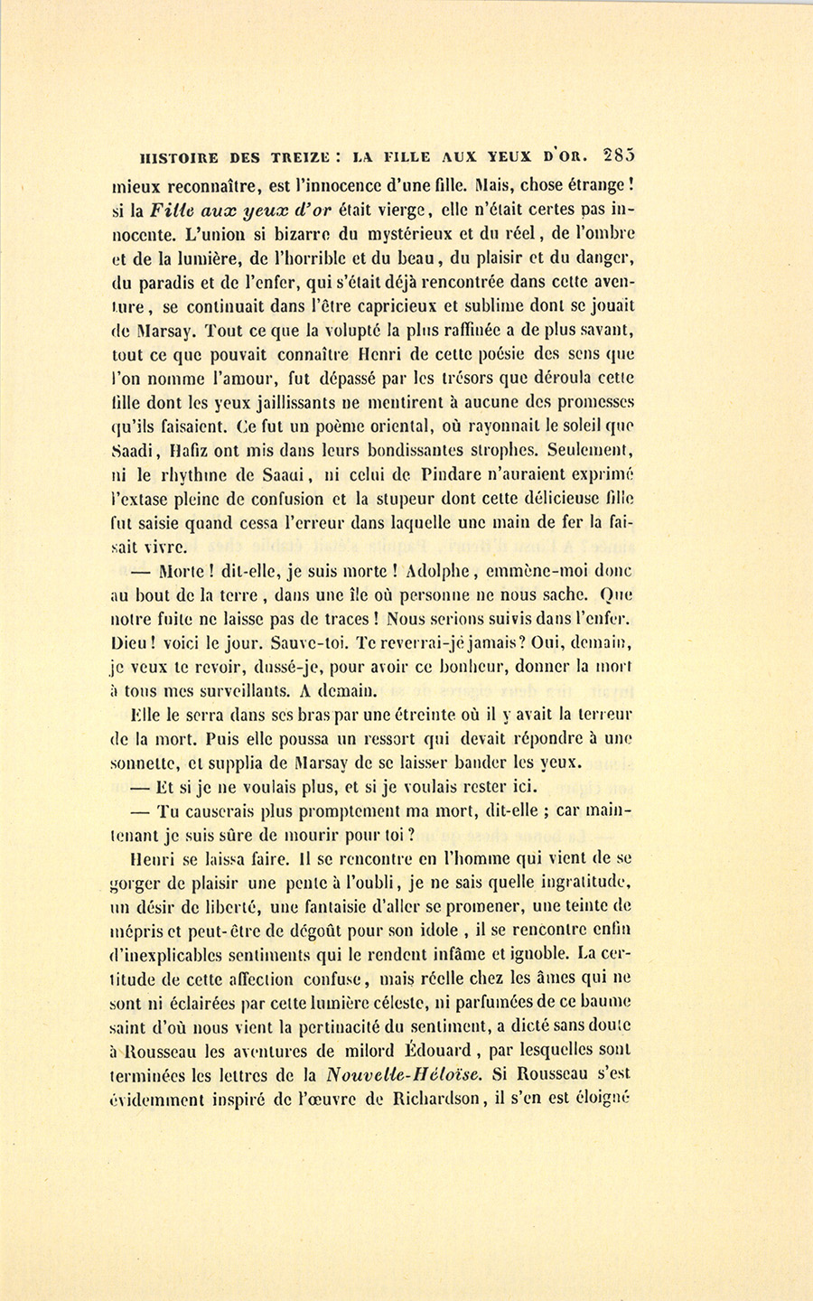 – Tu as raison, reprit Henri. Allons aux Indes, là où le printemps est éternel, où la terre n’a jamais que des fleurs, où l’homme peut déployer l’appareil des souverains, sans qu’on en {p. 295} glose comme dans les sots pays où l’on veut réaliser la plate chimère de l’égalité. Allons dans la contrée où l’on vit au milieu d’un peuple d’esclaves, où le soleil illumine toujours un palais qui reste blanc, où l’on sème des parfums dans l’air, où les oiseaux chantent l’amour, et où l’on meurt quand on ne peut plus aimer…