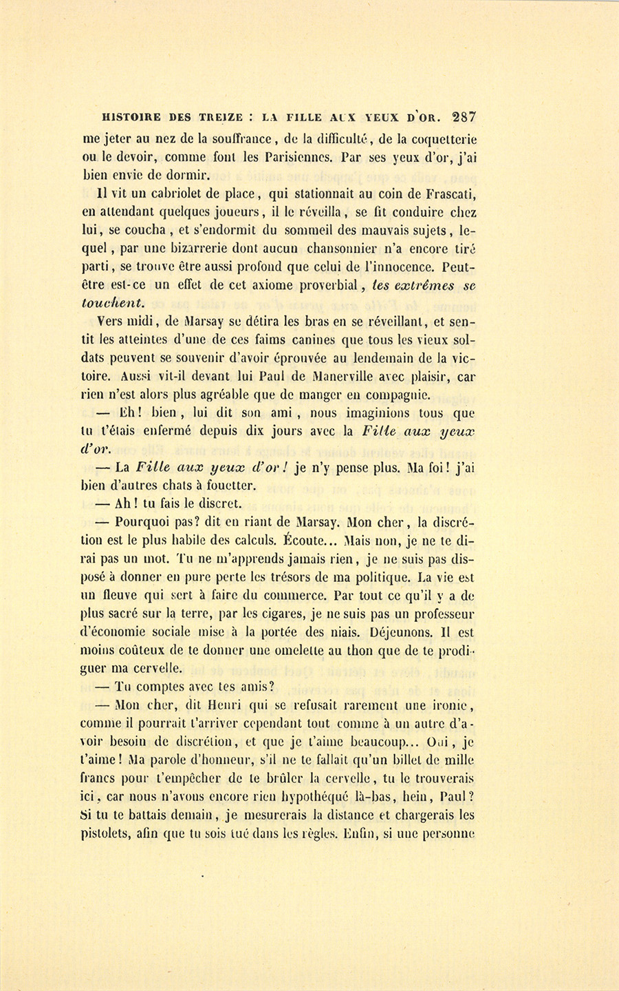 – Nous ne connaissons que ça, mon cher ! s’écria Paul. Elle vient quelquefois ici, c’est la Fille aux yeux d’or. Nous lui avons donné ce nom-là. C’est une jeune personne d’environ vingt-deux ans, et que j’ai vue ici quand les Bourbons y étaient, mais avec une femme qui vaut cent mille fois mieux qu’elle.