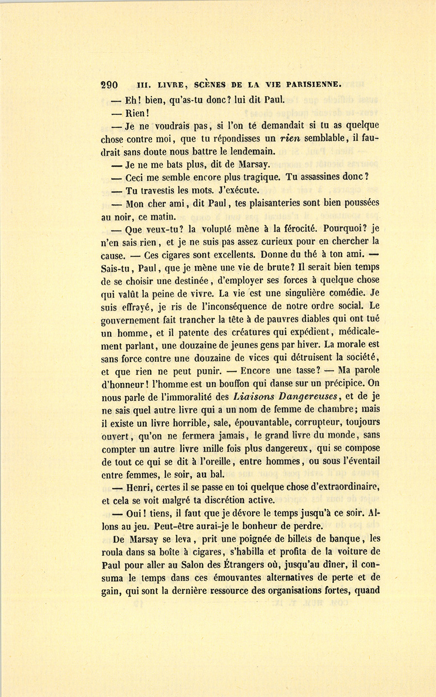 Ou bien : – Nous étions, de Marsay et moi, chez des femmes, et, ma parole d’honneur, j’étais, etc.