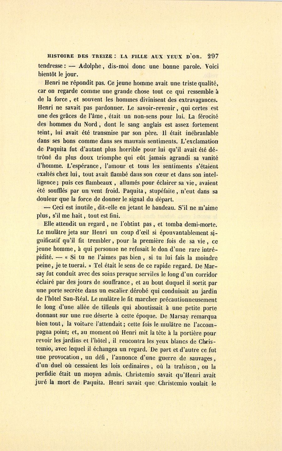 Elle attendit un regard, ne l’obtint pas, et tomba demi-morte. Le mulâtre jeta sur Henri un coup d’œil si épouvantablement significatif qu’il fit trembler, pour la première fois de sa vie, ce jeune homme, à qui personne ne refusait le don d’une rare intrépidité. – « Si tu ne l’aimes pas bien, si tu lui fais la moindre peine, je te tuerai. » Tel était le sens de ce rapide regard. De Marsay fut conduit avec des soins presque serviles le long d’un corridor éclairé par des jours de souffrance, et au bout duquel il sortit par une porte secrète dans un escalier dérobé qui conduisait au jardin de l’hôtel San-Réal. Le mulâtre le fit marcher précautionneusement le long d’une allée de tilleuls qui aboutissait à une petite porte donnant sur une rue déserte à cette époque. De Marsay remarqua bien tout, la voiture l’attendait ; cette fois le mulâtre ne l’accompagna point ; et, au moment où Henri mit la tête à la portière pour revoir les jardins et l’hôtel, il rencontra les yeux blancs de Christemio, avec lequel il échangea un regard. De part et d’autre ce fut une provocation, un défi, l’annonce d’une guerre de sauvages, d’un duel où cessaient les lois ordinaires, où la trahison, ou la perfidie était un moyen admis. Christemio savait qu’Henri avait juré la mort de Paquita. Henri savait que Christemio voulait le {p. 298} tuer avant qu’il ne tuât Paquita. Tous deux s’entendirent à merveille.
