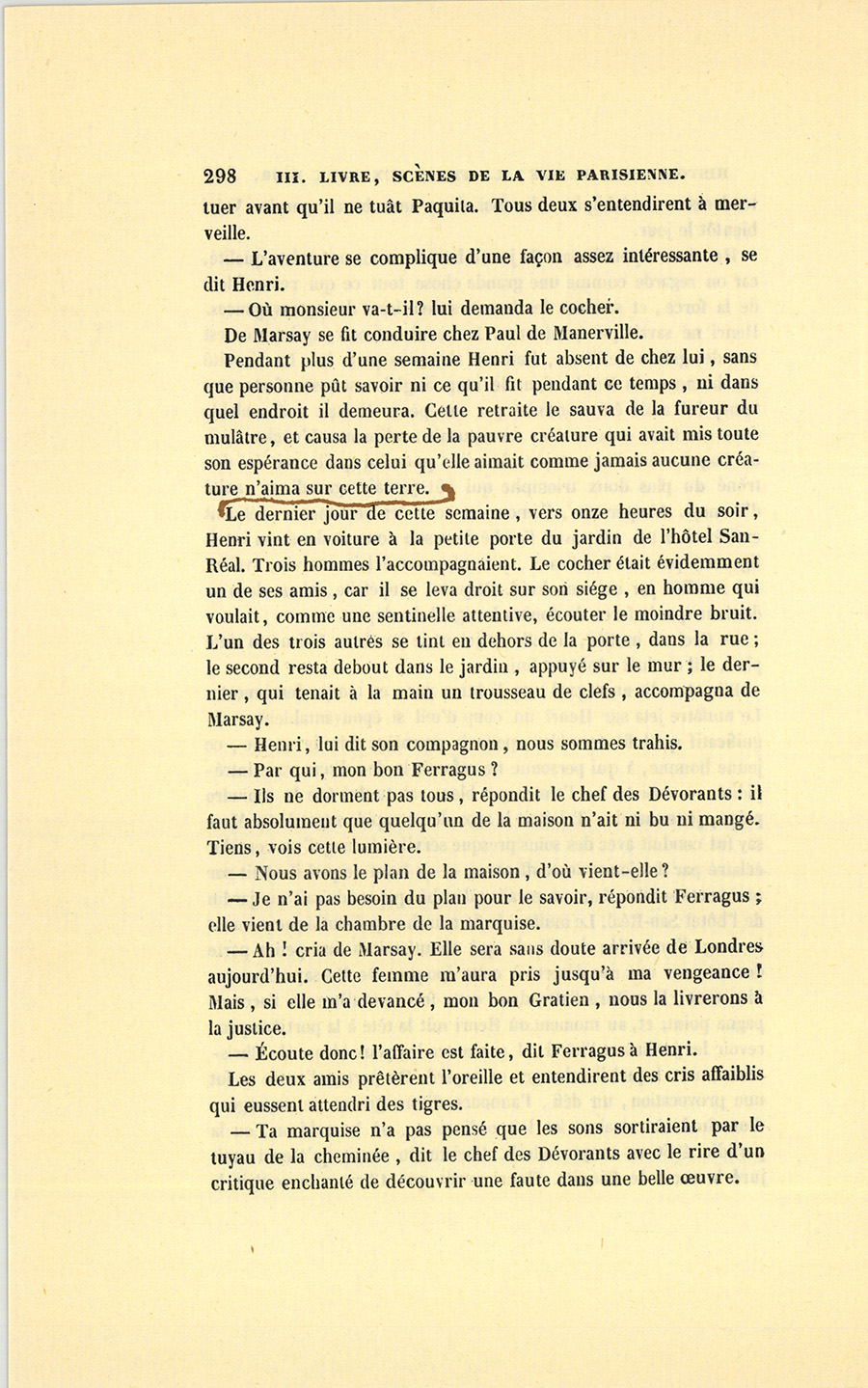 {p. 301} – Tu vas me dire que tu ne l’avais pas vendue pour que je la tuasse, s’écria la marquise. Je sais pourquoi tu sors de ta tanière. Je te la payerai deux fois. Tais-toi.