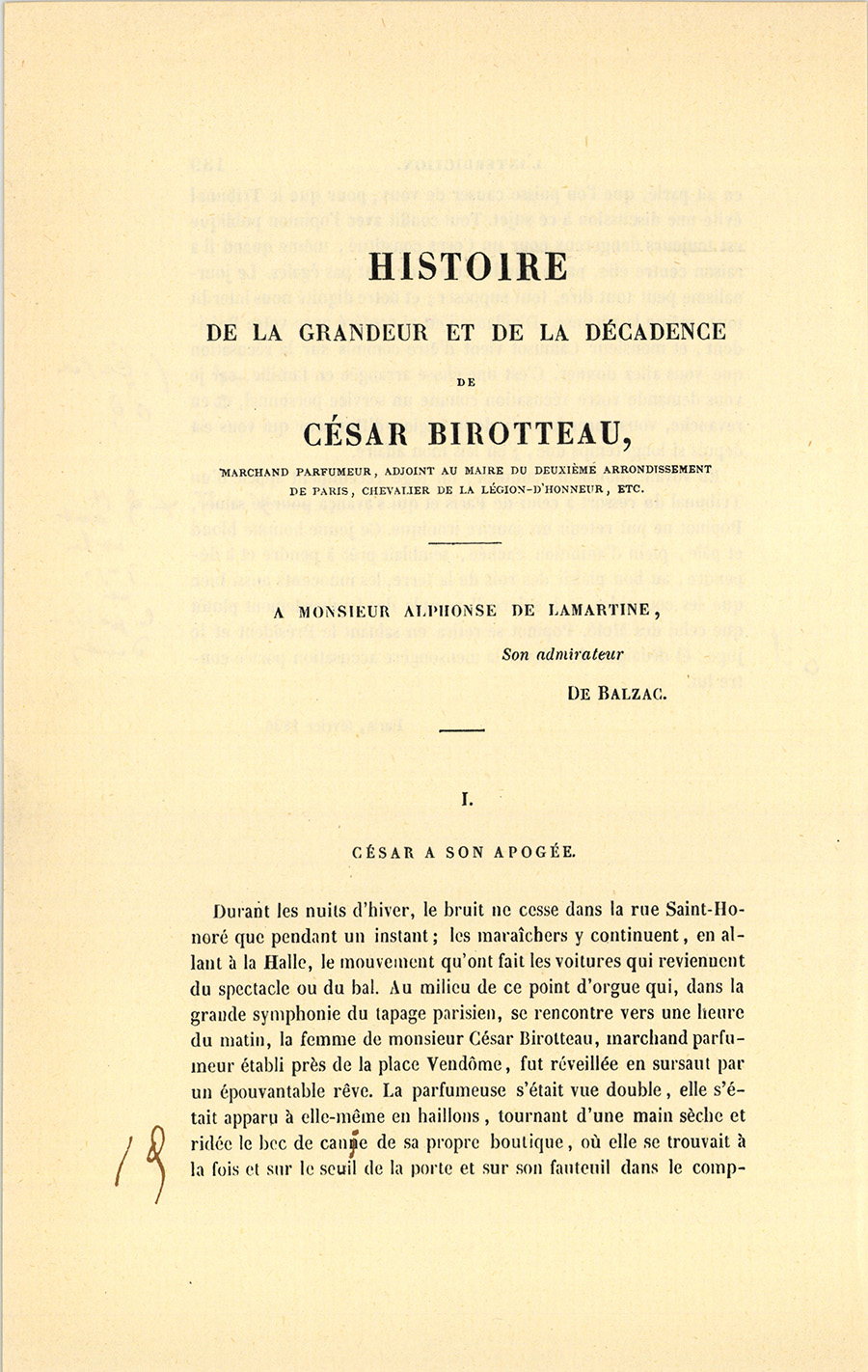 Durant les nuits d’hiver, le bruit ne cesse dans la rue Saint-Honoré que pendant un instant ; les maraîchers y continuent, en allant à la Halle, le mouvement qu’ont fait les voitures qui reviennent du spectacle ou du bal. Au milieu de ce point d’orgue qui, dans la grande symphonie du tapage parisien, se rencontre vers une heure du matin, la femme de monsieur César Birotteau, marchand parfumeur établi près de la place Vendôme, fut réveillée en sursaut par un épouvantable rêve. La parfumeuse s’était vue double, elle s’était apparu à elle-même en haillons, tournant d’une main sèche et ridée le bec de cane de sa propre boutique, où elle se trouvait à la fois et sur le seuil de la porte et sur son fauteuil dans le {p. 191} comptoir ; elle se demandait l’aumône, elle s’entendait parler à la porte et au comptoir. Elle voulut saisir son mari et posa la main sur une place froide. Sa peur devint alors tellement intense qu’elle ne put remuer son cou qui se pétrifia : les parois de son gosier se collèrent, la voix lui manqua ; elle resta clouée sur son séant, les yeux agrandis et fixes, les cheveux douloureusement affectés, les oreilles pleines de sons étranges, le cœur contracté mais palpitant, enfin tout à la fois en sueur et glacée au milieu d’une alcôve dont les deux battants étaient ouverts.