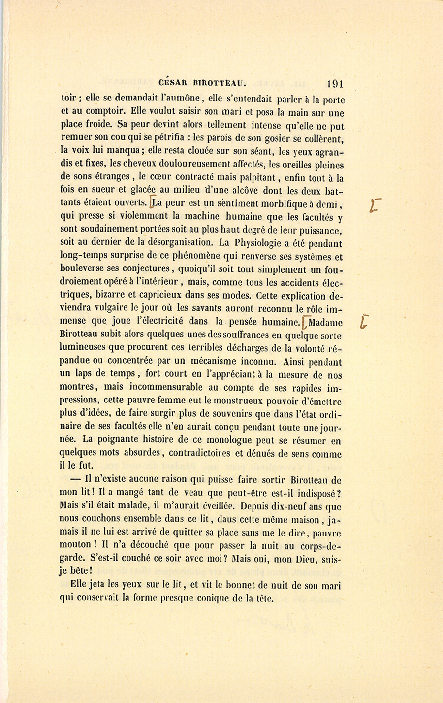 Madame Birotteau subit alors quelques-unes des souffrances en quelque sorte lumineuses que procurent ces terribles décharges de la volonté répandue ou concentrée par un mécanisme inconnu. Ainsi pendant un laps de temps, fort court en l’appréciant à la mesure de nos montres, mais incommensurable au compte de ses rapides impressions, cette pauvre femme eut le monstrueux pouvoir d’émettre plus d’idées, de faire surgir plus de souvenirs que dans l’état ordinaire de ses facultés elle n’en aurait conçu pendant toute une journée. La poignante histoire de ce monologue peut se résumer en quelques mots absurdes, contradictoires et dénués de sens comme il le fut.