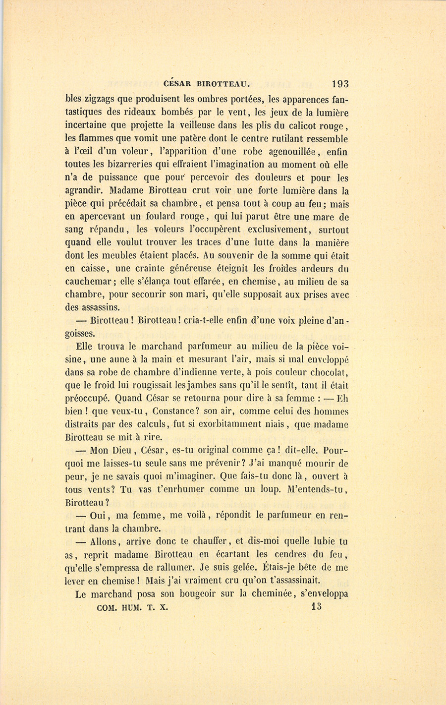 Elle tourna péniblement la tête et regarda furtivement à travers sa chambre, alors pleine de ces pittoresques effets de nuit qui font le désespoir du langage, et semblent appartenir exclusivement au pinceau des peintres de genre. Par quels mots rendre les {p. 193} effroyables zigzags que produisent les ombres portées, les apparences fantastiques des rideaux bombés par le vent, les jeux de la lumière incertaine que projette la veilleuse dans les plis du calicot rouge, les flammes que vomit une patère dont le centre rutilant ressemble à l’œil d’un voleur, l’apparition d’une robe agenouillée, enfin toutes les bizarreries qui effraient l’imagination au moment où elle n’a de puissance que pour percevoir des douleurs et pour les agrandir. Madame Birotteau crut voir une forte lumière dans la pièce qui précédait sa chambre, et pensa tout à coup au feu ; mais en apercevant un foulard rouge, qui lui parut être une mare de sang répandu, les voleurs l’occupèrent exclusivement, surtout quand elle voulut trouver les traces d’une lutte dans la manière dont les meubles étaient placés. Au souvenir de la somme qui était en caisse, une crainte généreuse éteignit les froides ardeurs du cauchemar ; elle s’élança tout effarée, en chemise, au milieu de sa chambre, pour secourir son mari, qu’elle supposait aux prises avec des assassins.