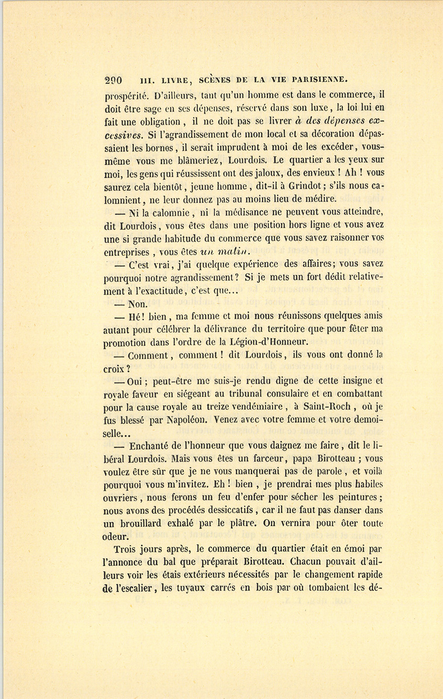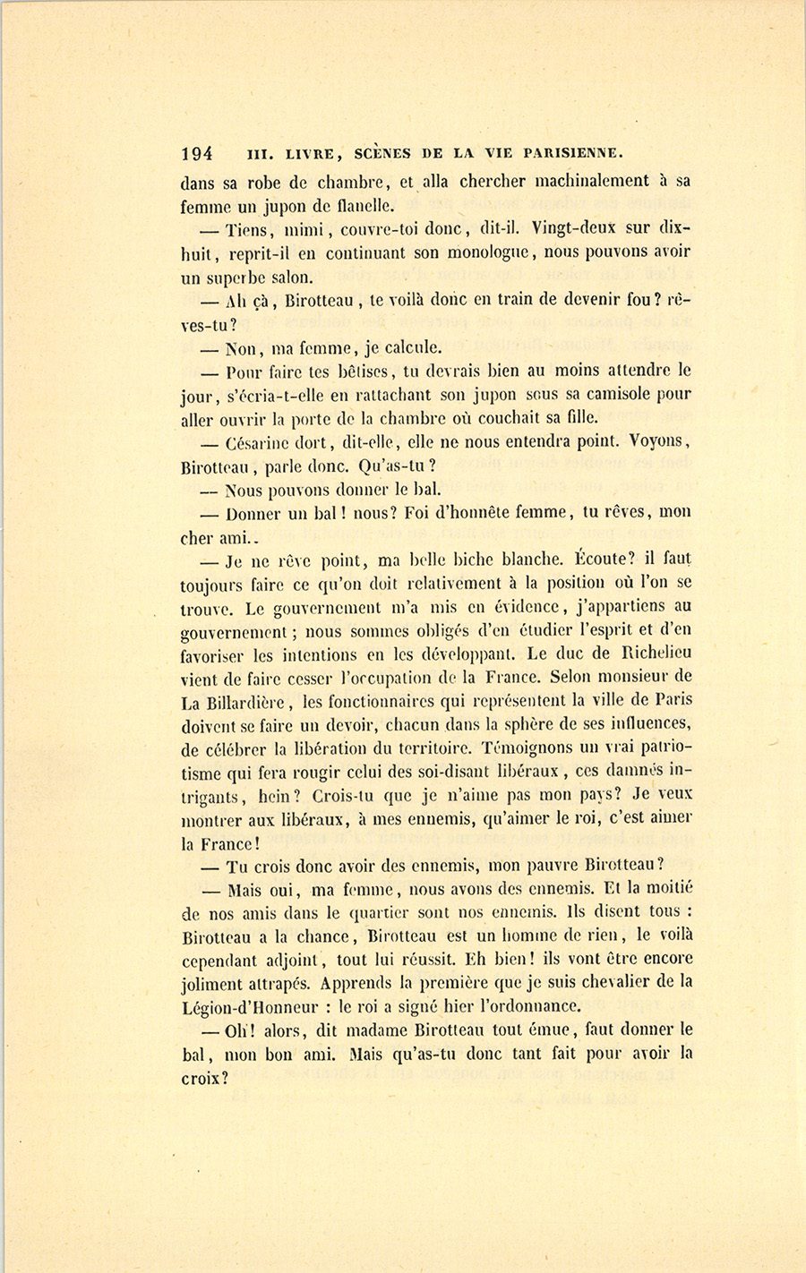– Mais oui, ma femme, nous avons des ennemis. Et la moitié de nos amis dans le quartier sont nos ennemis. Ils disent tous : Birotteau a la chance, Birotteau est un homme de rien, le voilà cependant adjoint, tout lui réussit. Eh bien ! ils vont être encore joliment attrapés. Apprends la première que je suis chevalier de la Légion-d’Honneur : le roi a signé hier l’ordonnance.