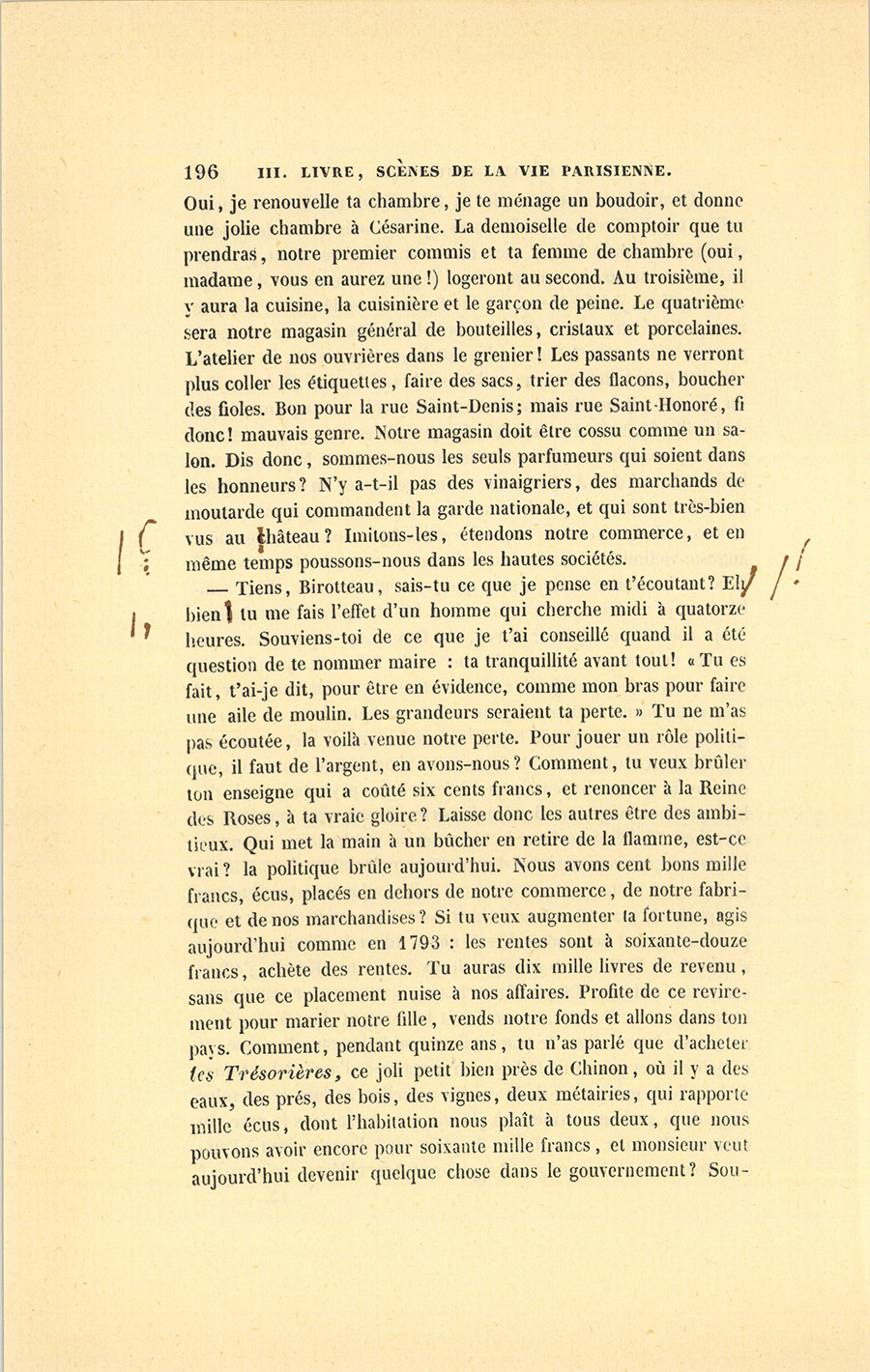 – Tiens, Birotteau, sais-tu ce que je pense en t’écoutant ? Eh ! bien, tu me fais l’effet d’un homme qui cherche midi à quatorze heures. Souviens-toi de ce que je t’ai conseillé quand il a été question de te nommer maire : ta tranquillité avant tout ! « Tu es fait, t’ai-je dit, pour être en évidence, comme mon bras pour faire une aile de moulin. Les grandeurs seraient ta perte. » Tu ne m’as pas écoutée, la voilà venue notre perte. Pour jouer un rôle politique, il faut de l’argent, en avons-nous ? Comment, tu veux brûler ton enseigne qui a coûté six cents francs, et renoncer à la Reine des Roses, à ta vraie gloire ? Laisse donc les autres être des ambitieux. Qui met la main à un bûcher en retire de la flamme, est-ce vrai ? la politique brûle aujourd’hui. Nous avons cent bons mille francs, écus, placés en dehors de notre commerce, de notre fabrique et de nos marchandises ? Si tu veux augmenter ta fortune, agis aujourd’hui comme en 1793 : les rentes sont à soixante-douze francs, achète des rentes. Tu auras dix mille livres de revenu, sans que ce placement nuise à nos affaires. Profite de ce revirement pour marier notre fille, vends notre fonds et allons dans ton pays. Comment, pendant quinze ans, tu n’as parlé que d’acheter les Trésorières, ce joli petit bien près de Chinon, où il y a des eaux, des prés, des bois, des vignes, deux métairies, qui rapporte mille écus, dont l’habitation nous plaît à tous deux, que nous pouvons avoir encore pour soixante mille francs, et monsieur veut aujourd’hui devenir quelque chose dans le gouvernement ? {p. 197} Souviens-toi donc de ce que nous sommes, des parfumeurs. Il y a seize ans, avant que tu n’eusses inventé la double Pâte des sultanes et l’Eau carminative, si l’on était venu te dire : « Vous allez avoir l’argent nécessaire pour acheter les Trésorières » ne te serais-tu pas trouvé mal de joie ? Eh bien ! tu peux acquérir cette propriété, dont tu avais tant envie que tu n’ouvrais la bouche que de ça, maintenant tu parles de dépenser en bêtises un argent gagné à la sueur de notre front, je peux dire le nôtre, j’ai toujours été assise dans ce comptoir par tous les temps comme un pauvre chien dans sa niche. Ne vaut-il pas mieux avoir un pied à terre chez ta fille, devenue la femme d’un notaire de Paris, et vivre huit mois de l’année à Chinon, que de commencer ici à faire de cinq sous six blancs, et de six blancs rien. Attends la hausse des fonds publics, tu donneras huit mille livres de rente à ta fille, nous en garderons deux mille pour nous, le produit de notre fonds nous permettra d’avoir les Trésorières. Là, dans ton pays, mon bon petit chat, en emportant notre mobilier qui vaut gros, nous serons comme des princes, tandis qu’ici faut au moins un million pour faire figure.
