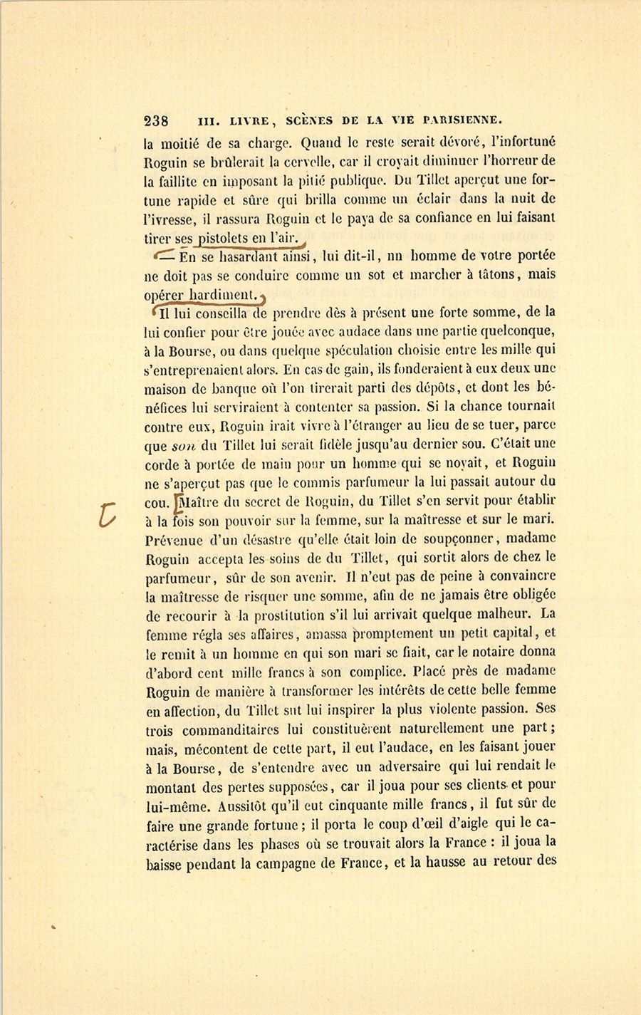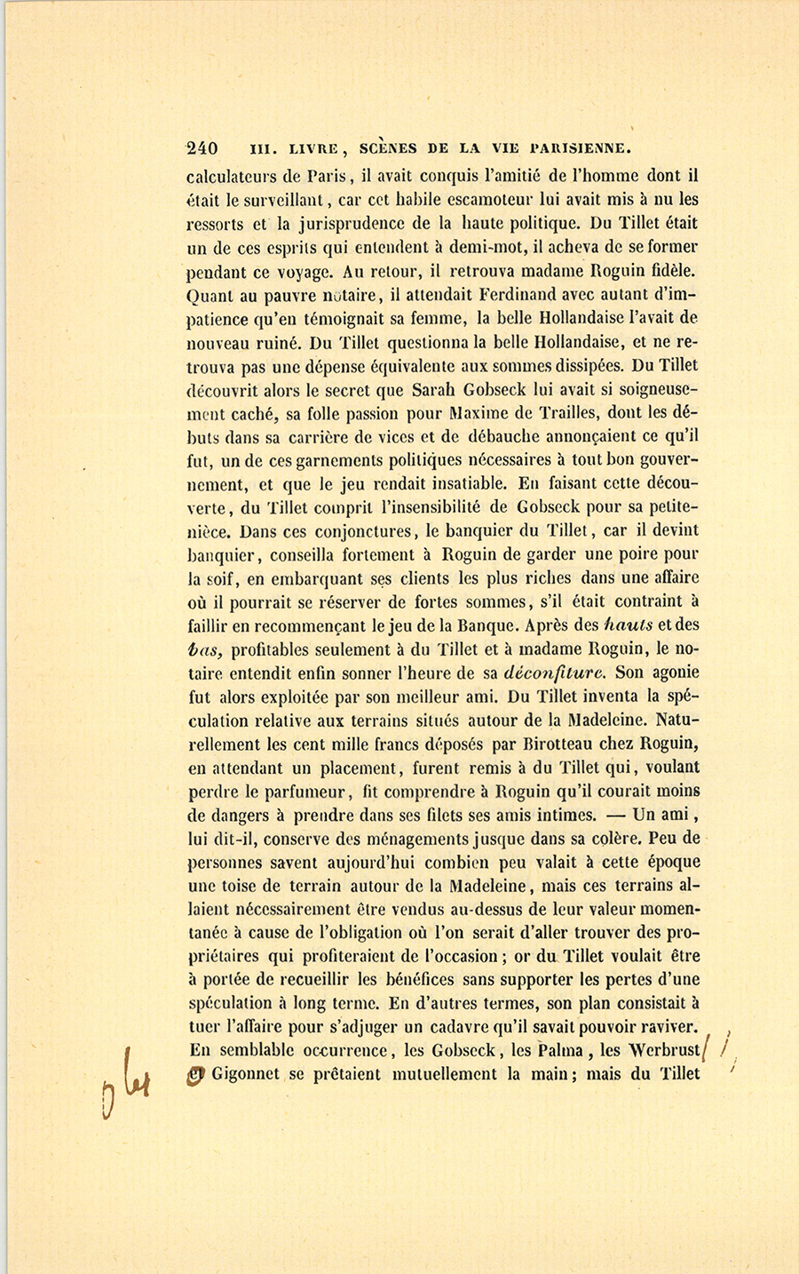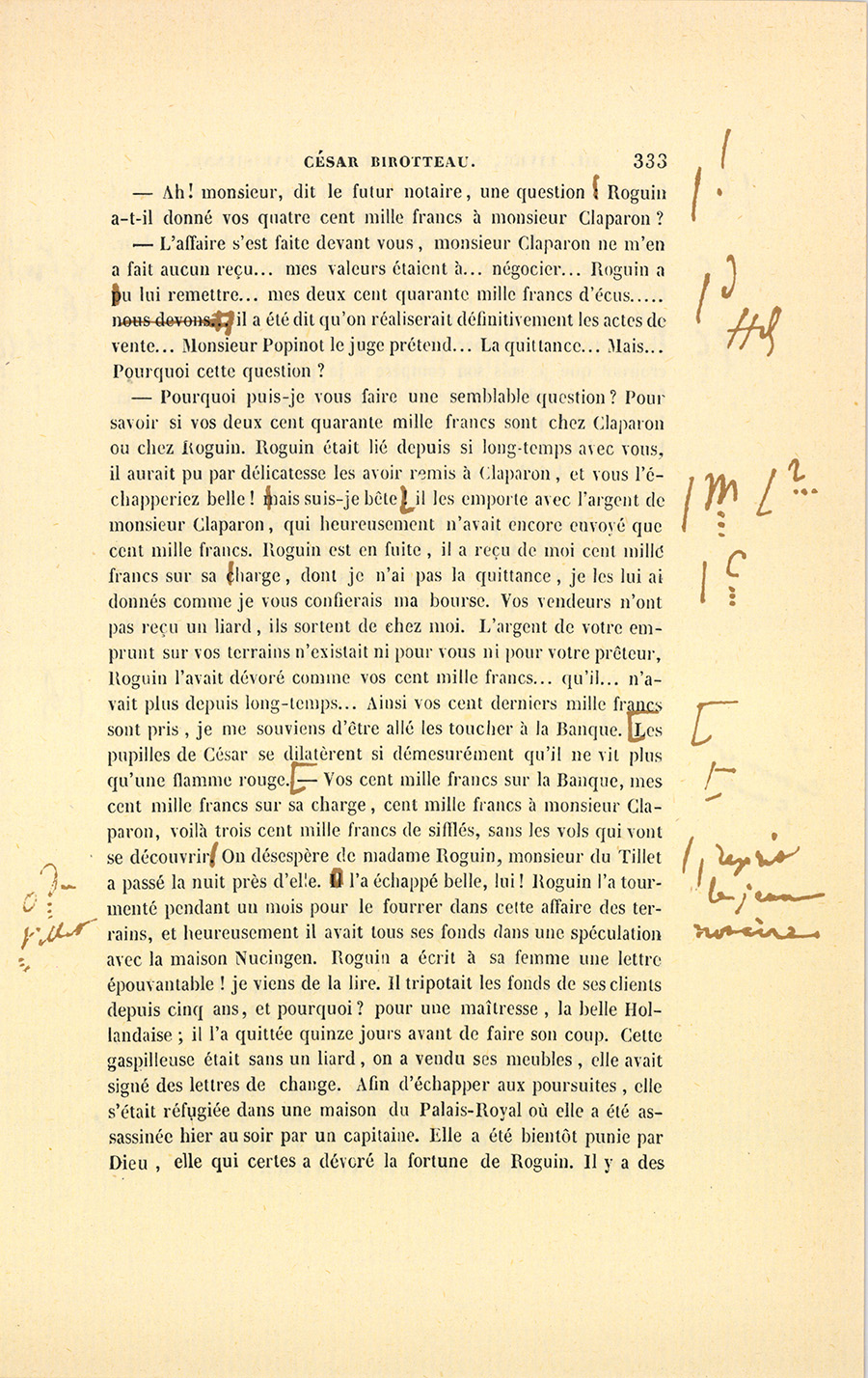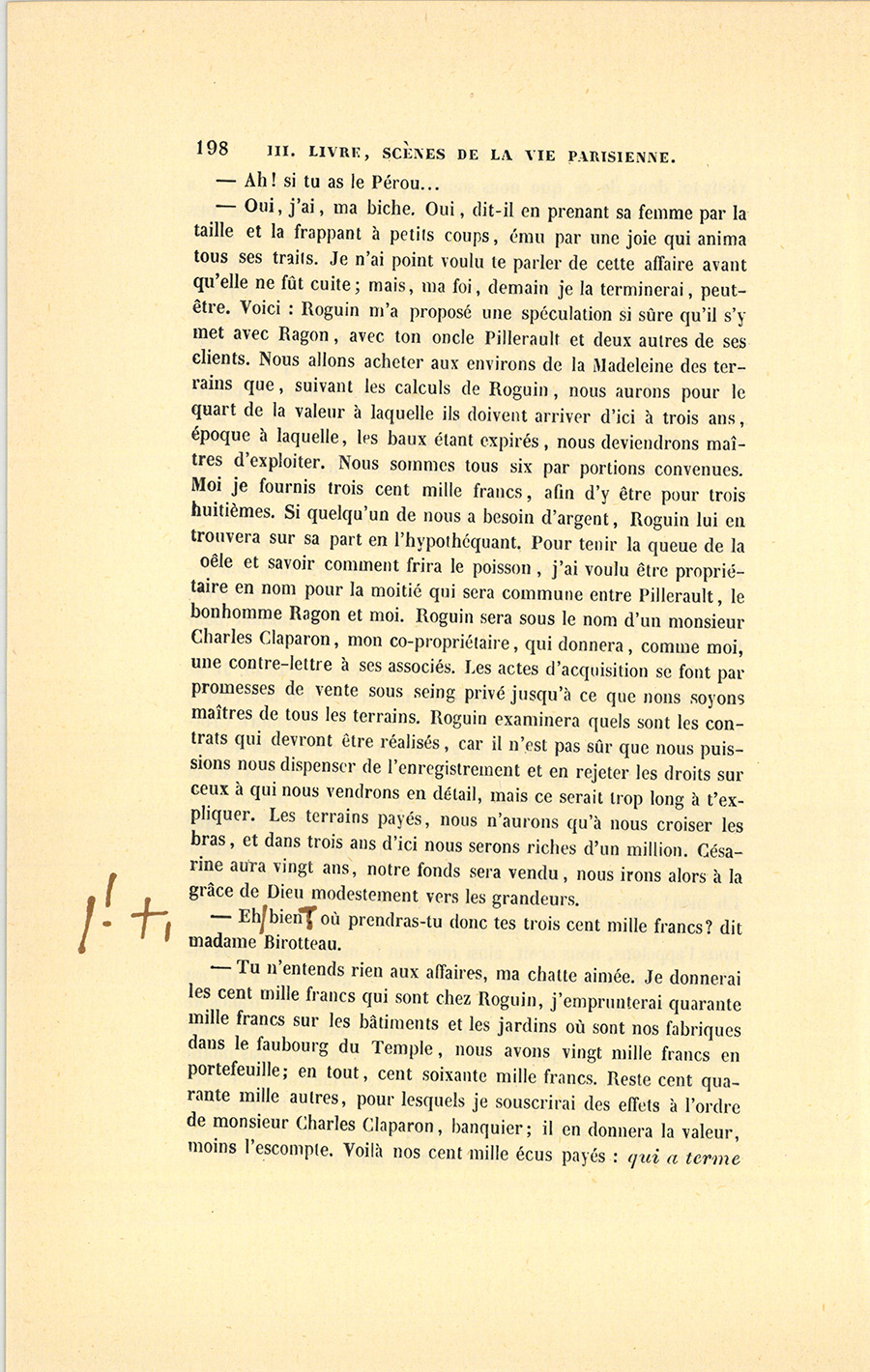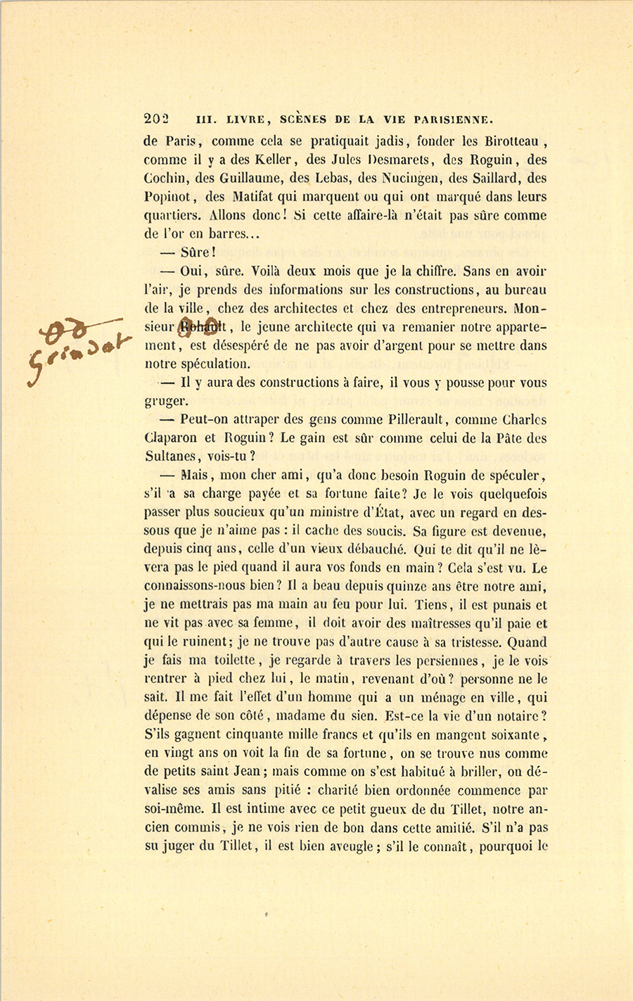 – Mais, mon cher ami, qu’a donc besoin Roguin de spéculer, s’il a sa charge payée et sa fortune faite ? Je le vois quelquefois passer plus soucieux qu’un ministre d’État, avec un regard en dessous que je n’aime pas : il cache des soucis. Sa figure est devenue, depuis cinq ans, celle d’un vieux débauché. Qui te dit qu’il ne lèvera pas le pied quand il aura vos fonds en main ? Cela s’est vu. Le connaissons-nous bien ? Il a beau depuis quinze ans être notre ami, je ne mettrais pas ma main au feu pour lui. Tiens, il est punais et ne vit pas avec sa femme, il doit avoir des maîtresses qu’il paie et qui le ruinent ; je ne trouve pas d’autre cause à sa tristesse. Quand je fais ma toilette, je regarde à travers les persiennes, je le vois rentrer à pied chez lui, le matin, revenant d’où ? personne ne le sait. Il me fait l’effet d’un homme qui a un ménage en ville, qui dépense de son côté, madame du sien. Est-ce la vie d’un notaire ? S’ils gagnent cinquante mille francs et qu’ils en mangent soixante, en vingt ans on voit la fin de sa fortune, on se trouve nus comme de petits saint Jean ; mais comme on s’est habitué à briller, on dévalise ses amis sans pitié : charité bien ordonnée commence par soi-même. Il est intime avec ce petit gueux de du Tillet, notre ancien commis, je ne vois rien de bon dans cette amitié. S’il n’a pas su juger du Tillet, il est bien aveugle ; s’il le connaît, pourquoi le {p. 203} choye-t-il tant ? tu me diras que sa femme aime du Tillet ? eh bien ! je n’attends rien de bon d’un homme qui n’a pas d’honneur à l’égard de sa femme. Enfin les possesseurs actuels de ces terrains sont donc bien bêtes de donner pour cent sous ce qui vaut cent francs ? Si tu rencontrais un enfant qui ne sût pas ce que vaut un louis, ne lui en dirais-tu pas la valeur ? Votre affaire me fait l’effet d’un vol, à moi, soit dit sans t’offenser.