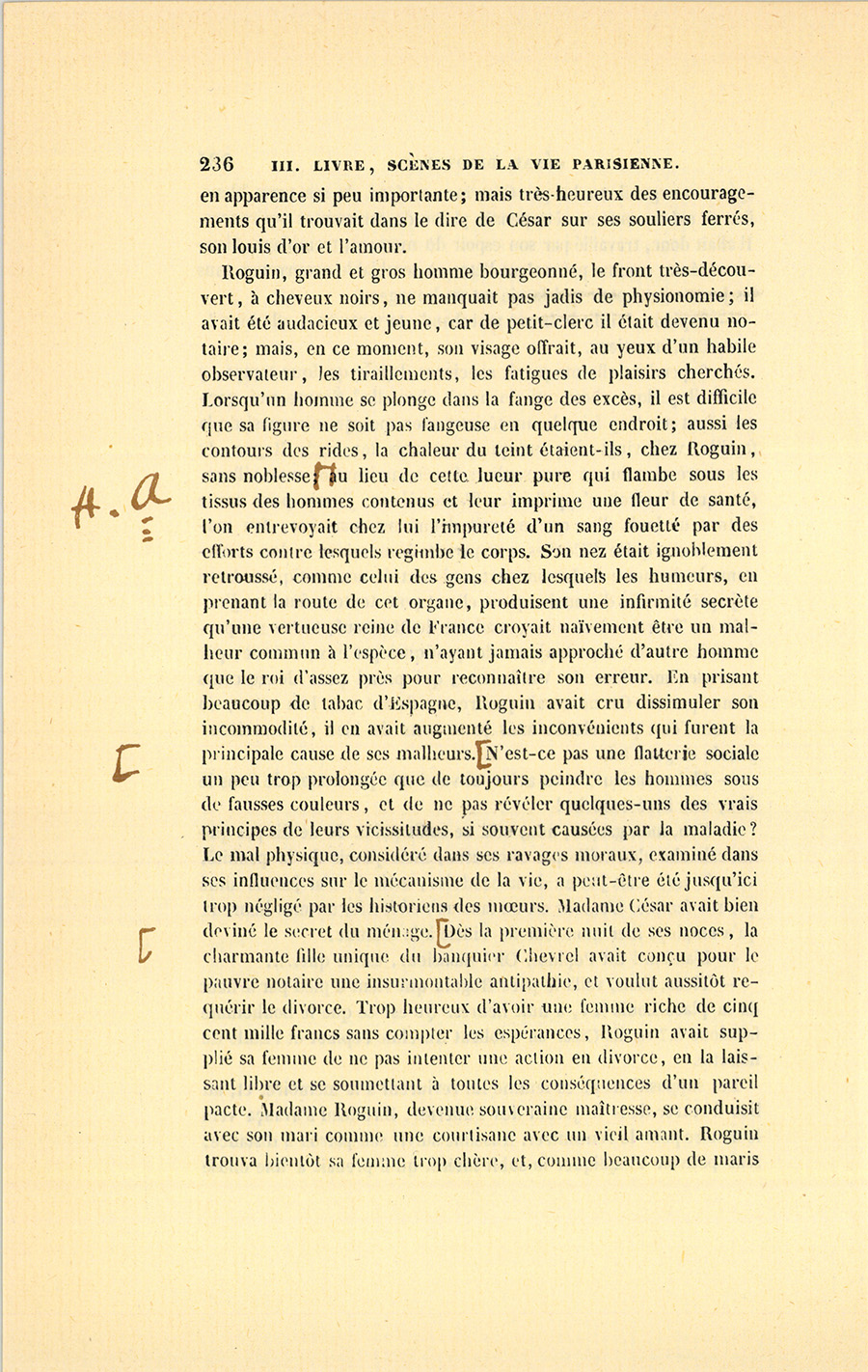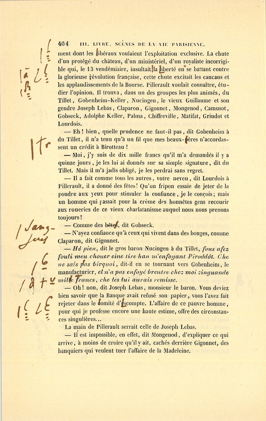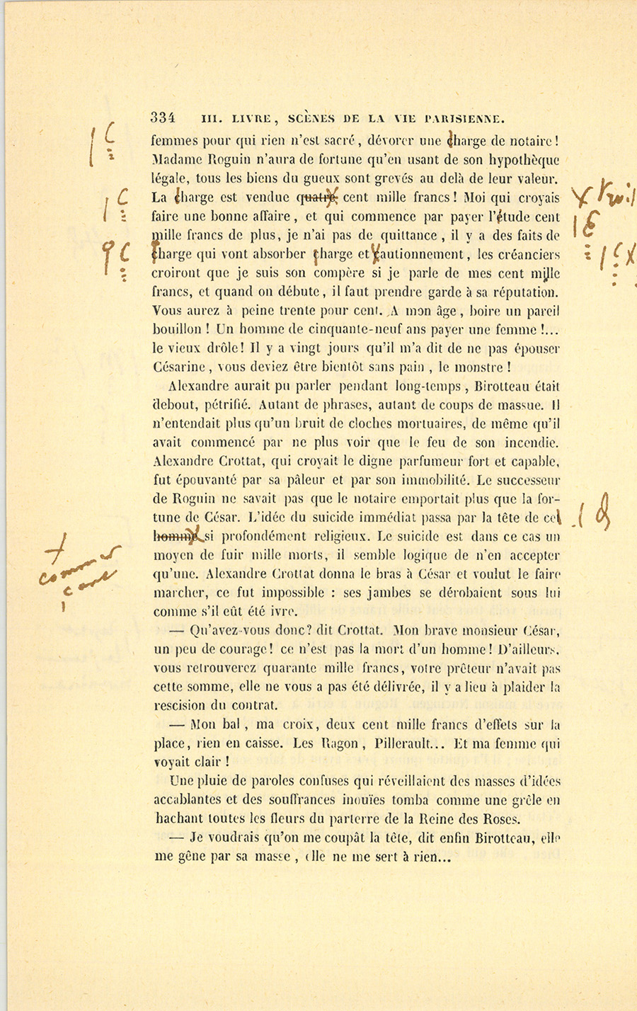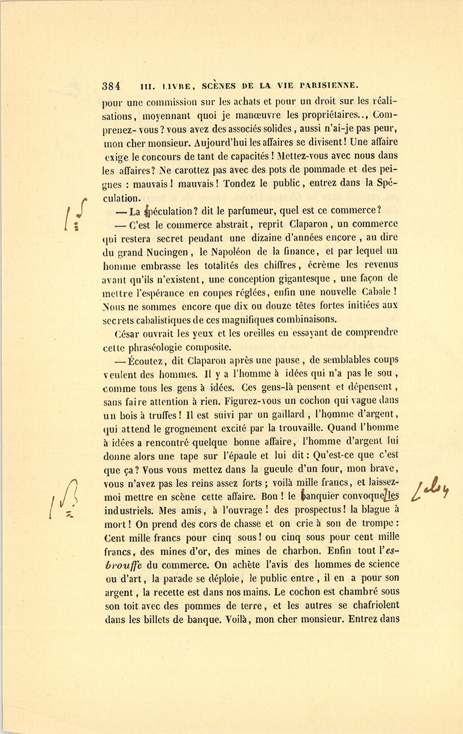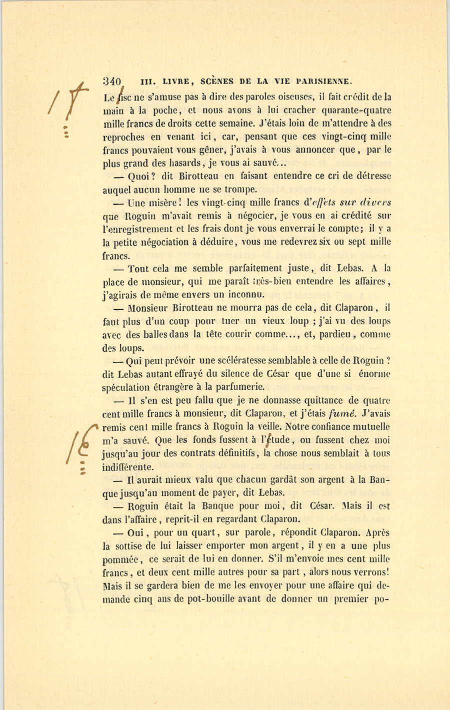 – Mais, mon cher ami, qu’a donc besoin Roguin de spéculer, s’il a sa charge payée et sa fortune faite ? Je le vois quelquefois passer plus soucieux qu’un ministre d’État, avec un regard en dessous que je n’aime pas : il cache des soucis. Sa figure est devenue, depuis cinq ans, celle d’un vieux débauché. Qui te dit qu’il ne lèvera pas le pied quand il aura vos fonds en main ? Cela s’est vu. Le connaissons-nous bien ? Il a beau depuis quinze ans être notre ami, je ne mettrais pas ma main au feu pour lui. Tiens, il est punais et ne vit pas avec sa femme, il doit avoir des maîtresses qu’il paie et qui le ruinent ; je ne trouve pas d’autre cause à sa tristesse. Quand je fais ma toilette, je regarde à travers les persiennes, je le vois rentrer à pied chez lui, le matin, revenant d’où ? personne ne le sait. Il me fait l’effet d’un homme qui a un ménage en ville, qui dépense de son côté, madame du sien. Est-ce la vie d’un notaire ? S’ils gagnent cinquante mille francs et qu’ils en mangent soixante, en vingt ans on voit la fin de sa fortune, on se trouve nus comme de petits saint Jean ; mais comme on s’est habitué à briller, on dévalise ses amis sans pitié : charité bien ordonnée commence par soi-même. Il est intime avec ce petit gueux de du Tillet, notre ancien commis, je ne vois rien de bon dans cette amitié. S’il n’a pas su juger du Tillet, il est bien aveugle ; s’il le connaît, pourquoi le {p. 203} choye-t-il tant ? tu me diras que sa femme aime du Tillet ? eh bien ! je n’attends rien de bon d’un homme qui n’a pas d’honneur à l’égard de sa femme. Enfin les possesseurs actuels de ces terrains sont donc bien bêtes de donner pour cent sous ce qui vaut cent francs ? Si tu rencontrais un enfant qui ne sût pas ce que vaut un louis, ne lui en dirais-tu pas la valeur ? Votre affaire me fait l’effet d’un vol, à moi, soit dit sans t’offenser.