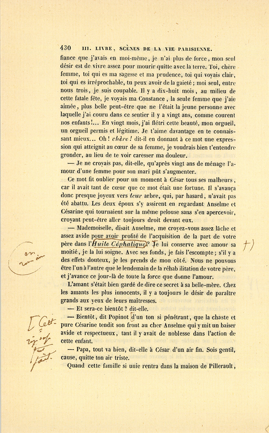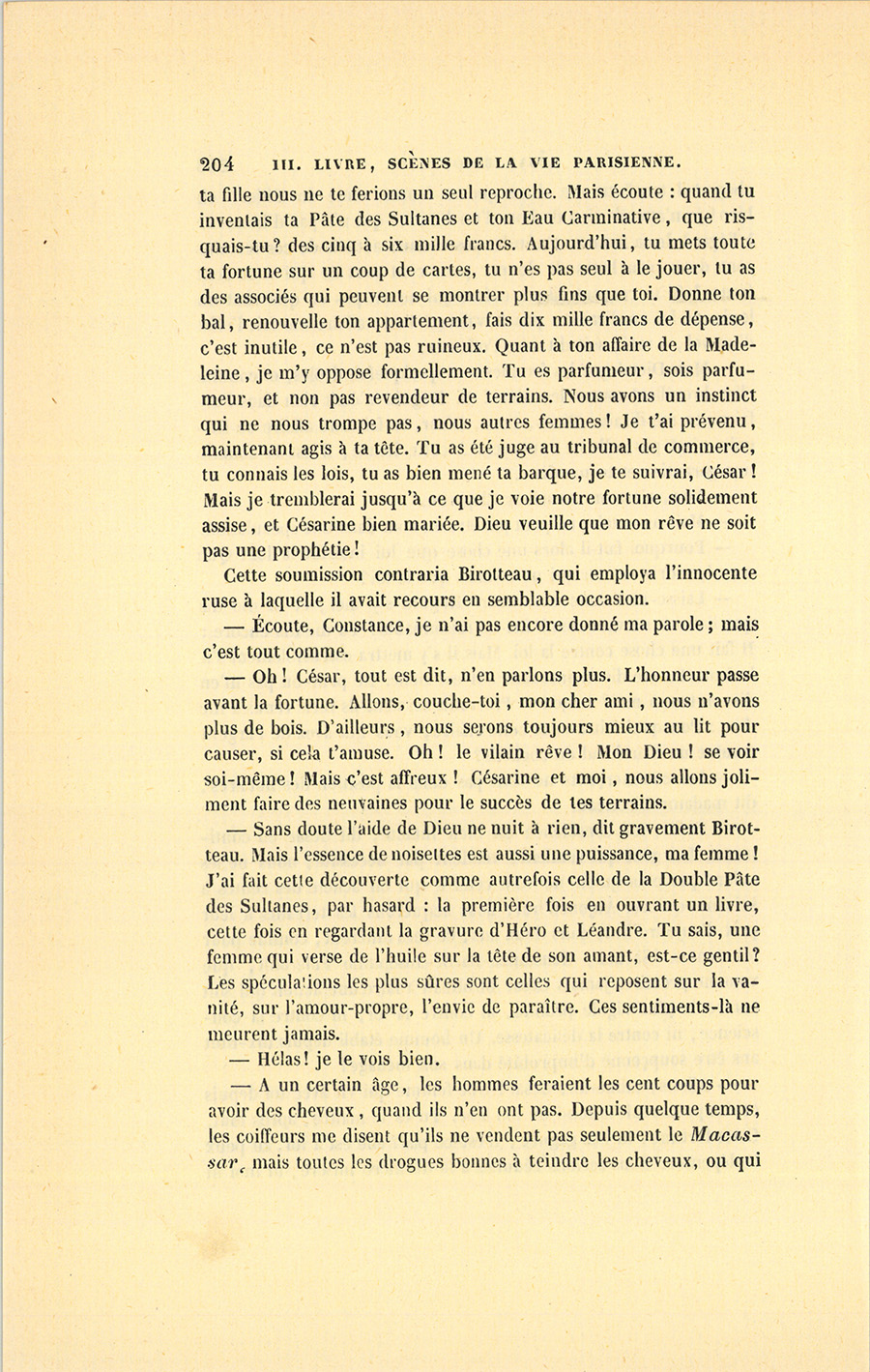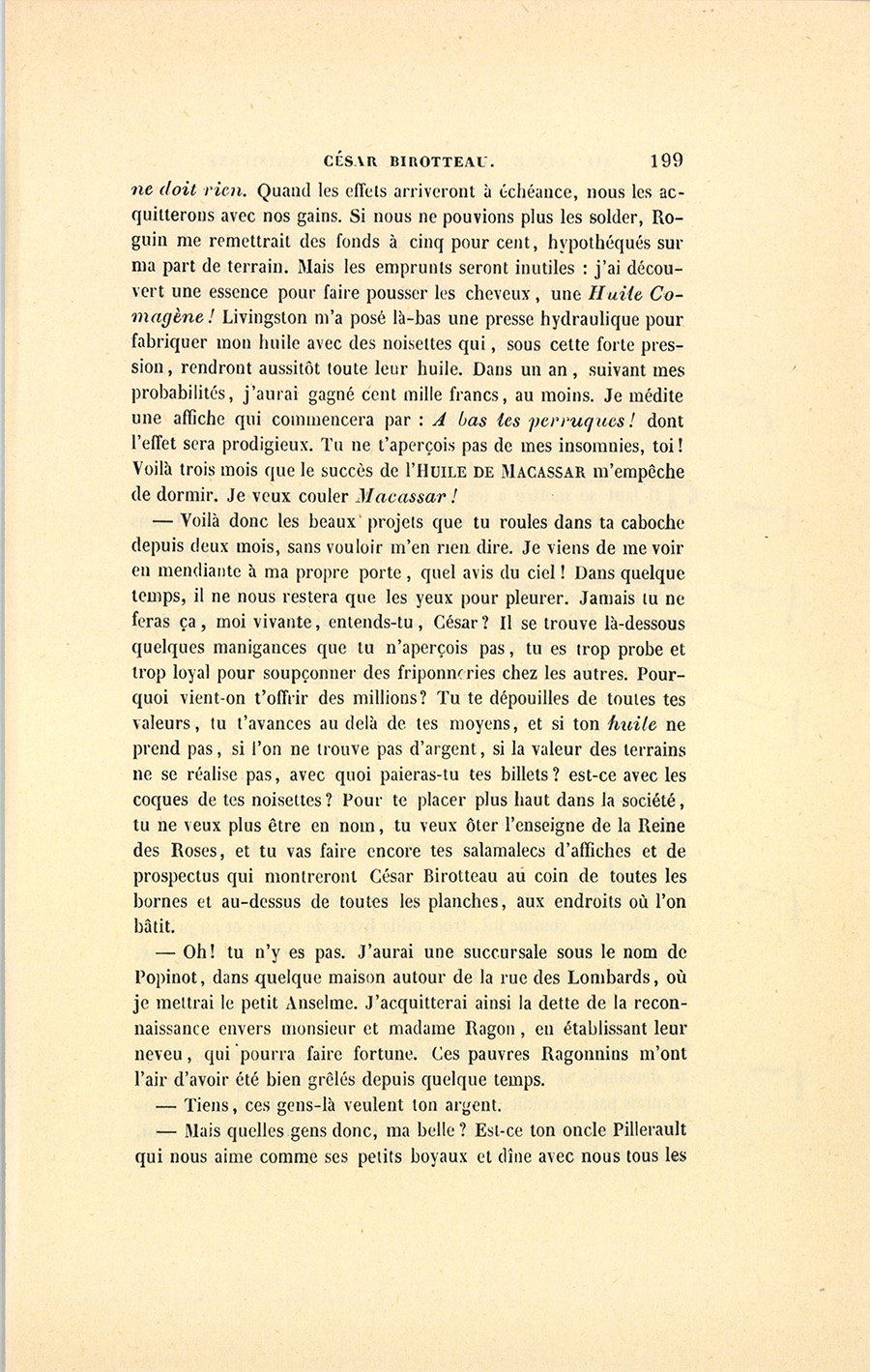 – Tu n’entends rien aux affaires, ma chatte aimée. Je donnerai les cent mille francs qui sont chez Roguin, j’emprunterai quarante mille francs sur les bâtiments et les jardins où sont nos fabriques dans le faubourg du Temple, nous avons vingt mille francs en portefeuille ; en tout, cent soixante mille francs. Reste cent quarante mille autres, pour lesquels je souscrirai des effets à l’ordre de monsieur Charles Claparon, banquier ; il en donnera la valeur, moins l’escompte. Voilà nos cent mille écus payés : qui a terme {p. 199} ne doit rien. Quand les effets arriveront à échéance, nous les acquitterons avec nos gains. Si nous ne pouvions plus les solder, Roguin me remettrait des fonds à cinq pour cent, hypothéqués sur ma part de terrain. Mais les emprunts seront inutiles : j’ai découvert une essence pour faire pousser les cheveux, une Huile Comagène ! Livingston m’a posé là-bas une presse hydraulique pour fabriquer mon huile avec des noisettes qui, sous cette forte pression, rendront aussitôt toute leur huile. Dans un an, suivant mes probabilités, j’aurai gagné cent mille francs, au moins. Je médite une affiche qui commencera par : À bas les perruques ! dont l’effet sera prodigieux. Tu ne t’aperçois pas de mes insomnies, toi ! Voilà trois mois que le succès de l’Huile de Macassar m’empêche de dormir. Je veux couler Macassar !