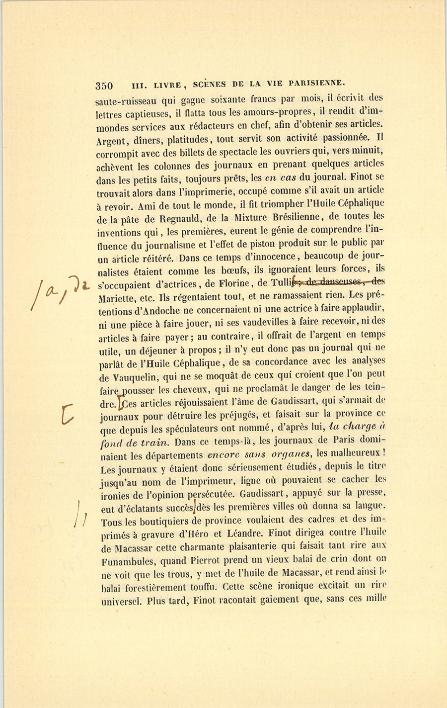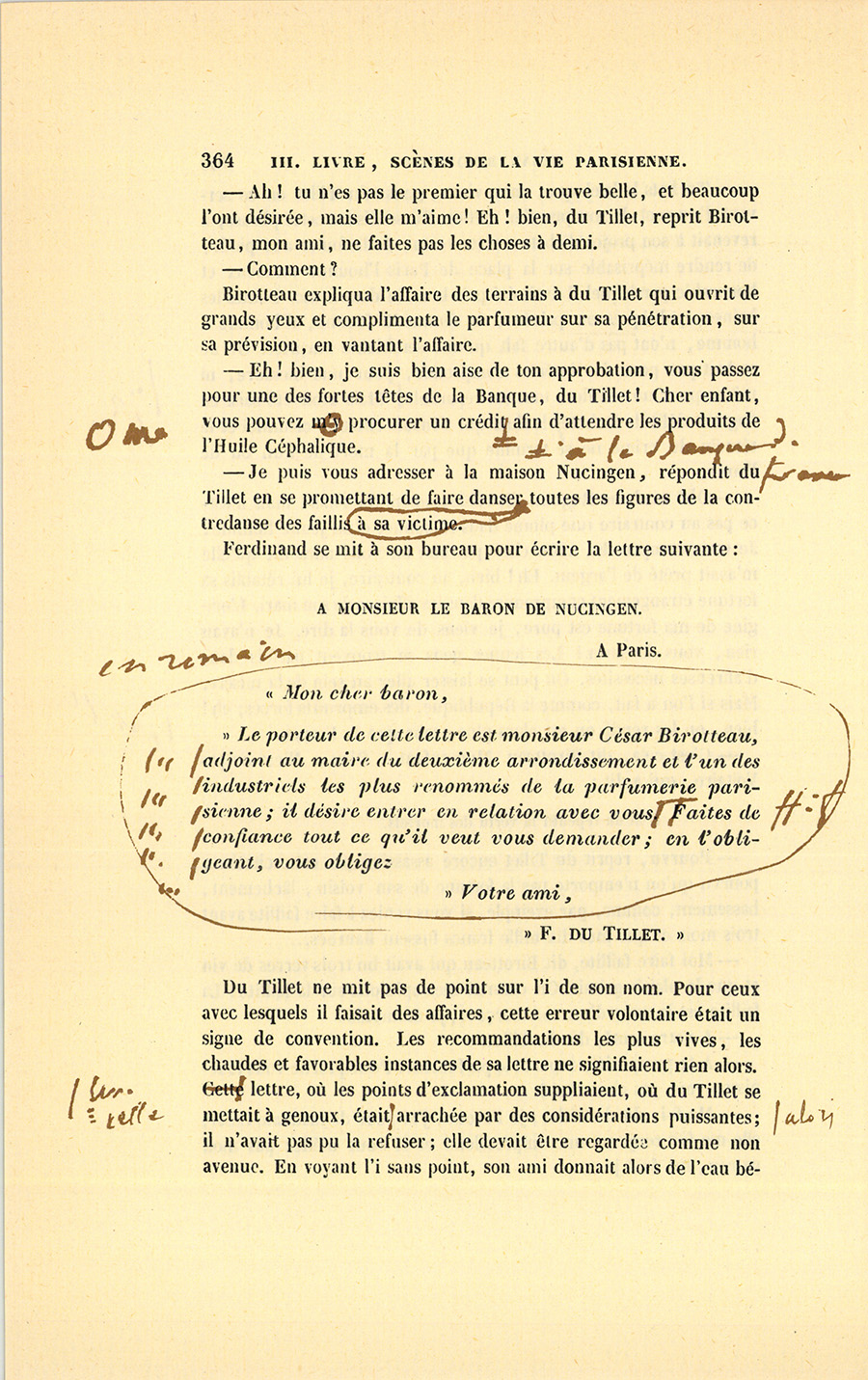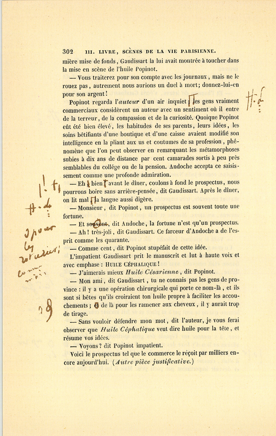 – Tu n’entends rien aux affaires, ma chatte aimée. Je donnerai les cent mille francs qui sont chez Roguin, j’emprunterai quarante mille francs sur les bâtiments et les jardins où sont nos fabriques dans le faubourg du Temple, nous avons vingt mille francs en portefeuille ; en tout, cent soixante mille francs. Reste cent quarante mille autres, pour lesquels je souscrirai des effets à l’ordre de monsieur Charles Claparon, banquier ; il en donnera la valeur, moins l’escompte. Voilà nos cent mille écus payés : qui a terme {p. 199} ne doit rien. Quand les effets arriveront à échéance, nous les acquitterons avec nos gains. Si nous ne pouvions plus les solder, Roguin me remettrait des fonds à cinq pour cent, hypothéqués sur ma part de terrain. Mais les emprunts seront inutiles : j’ai découvert une essence pour faire pousser les cheveux, une Huile Comagène ! Livingston m’a posé là-bas une presse hydraulique pour fabriquer mon huile avec des noisettes qui, sous cette forte pression, rendront aussitôt toute leur huile. Dans un an, suivant mes probabilités, j’aurai gagné cent mille francs, au moins. Je médite une affiche qui commencera par : À bas les perruques ! dont l’effet sera prodigieux. Tu ne t’aperçois pas de mes insomnies, toi ! Voilà trois mois que le succès de l’Huile de Macassar m’empêche de dormir. Je veux couler Macassar !