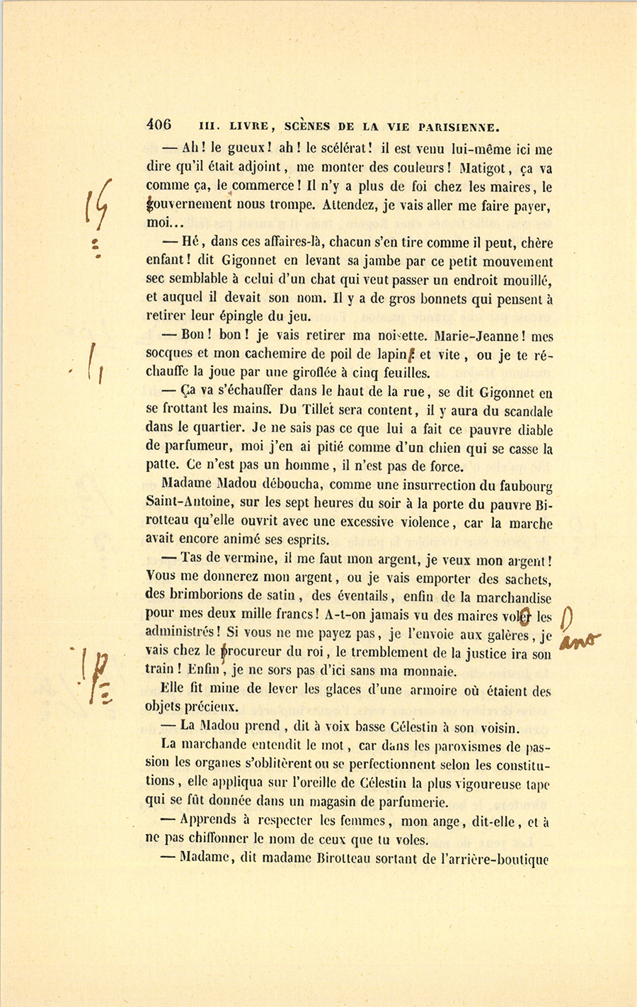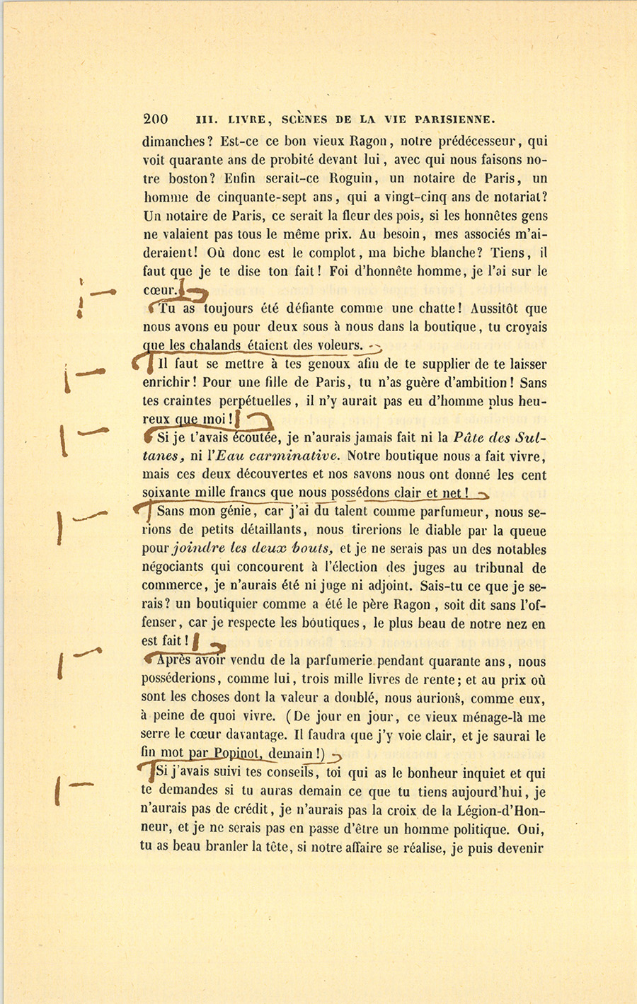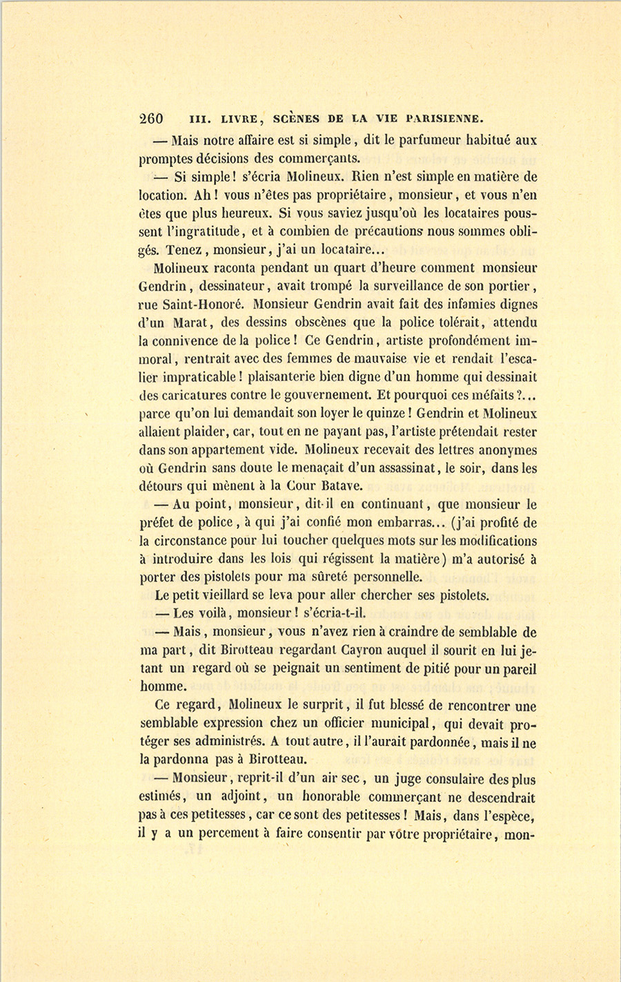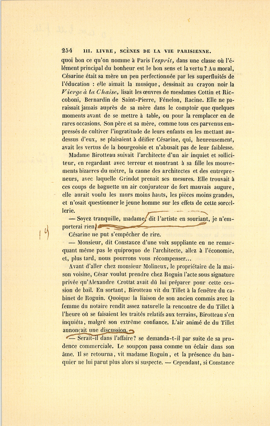 – Mais quelles gens donc, ma belle ? Est-ce ton oncle Pillerault qui nous aime comme ses petits boyaux et dîne avec nous tous les {p. 200} dimanches ? Est-ce ce bon vieux Ragon, notre prédécesseur, qui voit quarante ans de probité devant lui, avec qui nous faisons notre boston ? Enfin serait-ce Roguin, un notaire de Paris, un homme de cinquante-sept ans, qui a vingt-cinq ans de notariat ? Un notaire de Paris, ce serait la fleur des pois, si les honnêtes gens ne valaient pas tous le même prix. Au besoin, mes associés m’aideraient ! Où donc est le complot, ma biche blanche ? Tiens, il faut que je te dise ton fait ! Foi d’honnête homme, je l’ai sur le cœur. – Tu as toujours été défiante comme une chatte ! Aussitôt que nous avons eu pour deux sous à nous dans la boutique, tu croyais que les chalands étaient des voleurs. – Il faut se mettre à tes genoux afin de te supplier de te laisser enrichir ! Pour une fille de Paris, tu n’as guère d’ambition ! Sans tes craintes perpétuelles, il n’y aurait pas eu d’homme plus heureux que moi ! – Si je t’avais écoutée, je n’aurais jamais fait ni la Pâte des Sultanes, ni l’Eau carminative. Notre boutique nous a fait vivre, mais ces deux découvertes et nos savons nous ont donné les cent soixante mille francs que nous possédons clair et net ! – Sans mon génie, car j’ai du talent comme parfumeur, nous serions de petits détaillants, nous tirerions le diable par la queue pour joindre les deux bouts, et je ne serais pas un des notables négociants qui concourent à l’élection des juges au tribunal de commerce, je n’aurais été ni juge ni adjoint. Sais-tu ce que je serais ? un boutiquier comme a été le père Ragon, soit dit sans l’offenser, car je respecte les boutiques, le plus beau de notre nez en est fait ! – Après avoir vendu de la parfumerie pendant quarante ans, nous posséderions, comme lui, trois mille livres de rente ; et au prix où sont les choses dont la valeur a doublé, nous aurions, comme eux, à peine de quoi vivre. (De jour en jour, ce vieux ménage-là me serre le cœur davantage. Il faudra que j’y voie clair, et je saurai le fin mot par Popinot, demain !) – Si j’avais suivi tes conseils, toi qui as le bonheur inquiet et qui te demandes si tu auras demain ce que tu tiens aujourd’hui, je n’aurais pas de crédit, je n’aurais pas la croix de la Légion-d’Honneur, et je ne serais pas en passe d’être un homme politique. Oui, tu as beau branler la tête, si notre affaire se réalise, je puis devenir {p. 201} député de Paris. Ah ! je ne me nomme pas César pour rien, tout m’a réussi. – C’est inimaginable, au dehors chacun m’accorde de la capacité ; mais ici, la seule personne à laquelle je veux tant plaire que je sue sang et eau pour la rendre heureuse, est précisément celle qui me prend pour une bête.